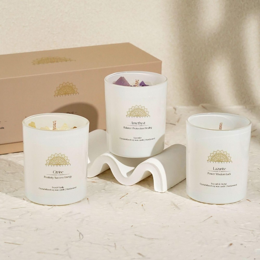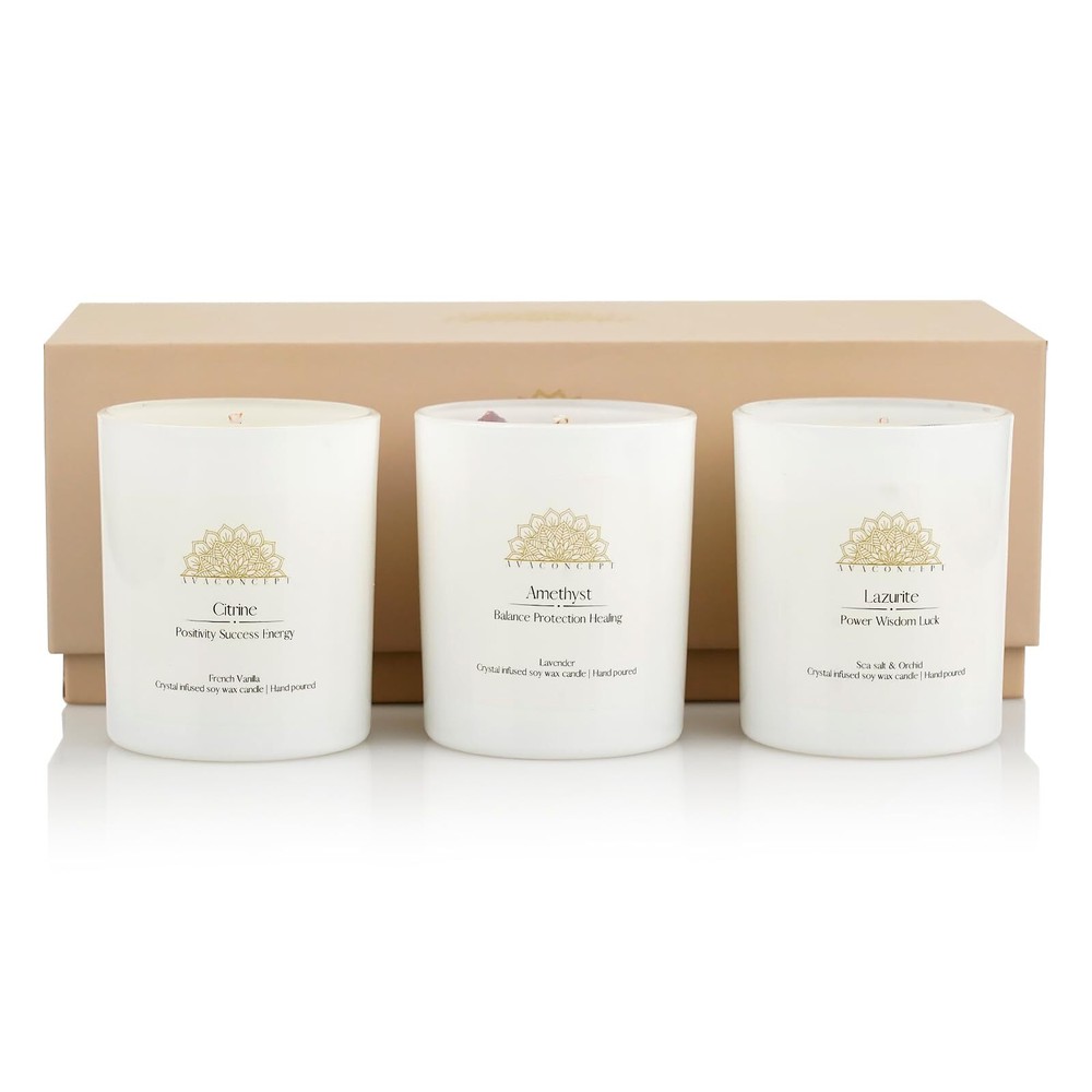 Looking for a unique and thoughtful gift? This set of three crystal-infused candles is the perfect choice! Each candle comes with a hidden crystal inside, beautifully packaged and ready for any special occasion. Every candle in this set is thoughtfully crafted with a unique fragrance that enhances the natural energy of the crystal inside. Enjoy the perfect combination of delightful scents and positive vibes. These candles are ideal for relaxation, meditation, stress relief, and adding a special touch to your home decor. AMETHYST CRYSTALS: Achieve peace and balance with Amethyst. Renowned for its calming and protective properties, Amethyst heightens intuition, promotes relaxation, and helps relieve anxiety and stress. LAZURITE CRYSTALS: Enhance your wisdom and intuition with Lazurite. This crystal is known for promoting insight and truth, enhancing intellectual abilities, boosting communication skills, and encouraging a deeper connection with the self. CITRINE CRYSTALS: Uplift your spirit and boost motivation with Citrine. Known for its happy and invigorating energy, Citrine enhances mental clarity and creativity, helps manifest success, and attracts wealth and prosperity. DIMENSIONS: The gift box measures L 9.12" x W 3.5" x H 3.37" Each votive candle measures W 2.37" x H 2.87" WEIGHT: Total weight is approx. 0.9kg Each votive candle holds 3.5oz (100g) of pure soy wax BURN TIME: Each crystal candle has an approx. burn time of 20 hours, for a total of up to 60 hours CANDLE SAFETY INSTRUCTIONS: 1. Never leave a burning candle unattended 2. Ensure wicks are upright and trimmed to 1/4” each time candle is lit 3. Always burn candles on a protected, heat-resistant surface 4. Avoid using near drafts and flammable materials 5. Keep out of reach of children and pets 6. Do not burn for more than 4 hours at a time 7. Do not burn when there is 1/4” wax remaining 8. Do not attempt to remove crystals while candle is lit ✅ LUXURIOUS CRYSTAL INFUSED CANDLES - All Candles Are 3.5 Once White Sine Jar with gem and crystal, Manifestation Love And Joy To Your Home , Amplify Happiness And Energy , Bring Luxury To Home Decor And Balance Chakra During Meditate ✅ Charming and Unique - Indulge yourself or someone special with these Amethyst, Lazurite, and Citrine crystal candles, designed to release positive energy and a delightful fragrance. ✅ PURE BLEND OF FRAGRANCE OILS - Our 100% Hand Made Crystal Candles Are Infused With Hand Picked Blends Of Highest Quality Fragrance Oils . The Stone Scented Candles For Aromatherapy Have 3 Scents: 1. Lavender Scent With Ametyst, 2. Sea Salt & Orchid Scent With Lazurite, 3. French Vanilla With Citrine ✅ SMOKE FREE AND BURN CLEAN - Our Candles Are Crafted With One Cotton Wick And 100 % Soy Wax Candle With Crystals Inside Which Bring Calming And Cleansing Ambiance To Your Environment And Clear Negative Energy ✅ PERFECT GIFT FOR LOVED ONES - meaningful gift that bring love and peace . our aromatherapy candles healing spiritual gifts for women and loved ones. our gemstone candles with pure crystal perfect gift idea for birthday , wedding , meditation , friends ...