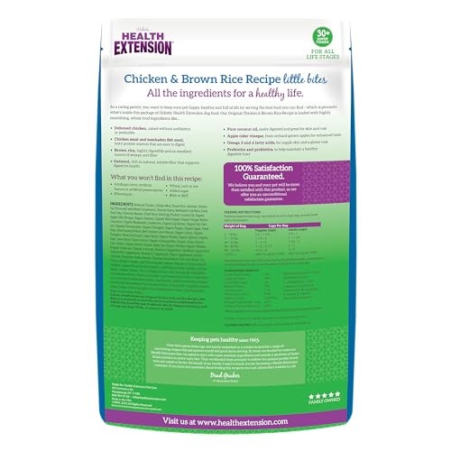 Health Extension Little Bites Dry Dog Food for Toy and Small 30 lbs, Multi Description Health Extension Little Bites Chicken & Brown Rice Recipe dry dog food is crafted especially for teacups, toys and miniature dogs – from puppies to senior adults. This delicious, protein-first formula contains select cuts of organically raised chicken along with highly digestible brown rice. Our Little Bites recipe is formulated with cutting-edge ingredients like turmeric, apple cider vinegar and ginger. It’s also packed with natural probiotics for proper digestion, as well as flaxseed and pure coconut oil for supple skin and a shiny coat. This recipe comes in a perfectly sized kibble for small dogs and puppies. Features: SMALL-BREED FORMULA: Small kibble designed for teacup, toy, and miniature breeds-from puppies through seniors-to support easy eating and digestion. REAL CHICKEN FIRST: Deboned chicken provides lean protein to support strong muscles and lasting energy. BOOSTED WITH 30+ SUPERFOODS: Including turmeric, apple cider vinegar, coconut oil, blueberries, cranberries, and more for natural health boost. NO FILLERS OR ARTIFICIAL ADDITIVES: No artificial flavors, colors, preservatives, corn, wheat, and soy. DIGESTIVE & IMMUNE HEALTH: Fortified with probiotics, prebiotics, and antioxidants to keep your small dog’s gut balanced and defenses strong. Product Details: Handling We will ship all orders within 3 business day of payment. Delivery We Do Not Ship Outside of the Continental US. Return Policy All items qualify for returns within 30 days of receipt. Buyer is responsible for return shipping on any item that is not damaged. Feedback We take our reputation seriously, we buy and sell online, so we understand the value of trust. If you are unsatisfied with your order, please contact us and we will work with you to resolve it to your satisfaction.