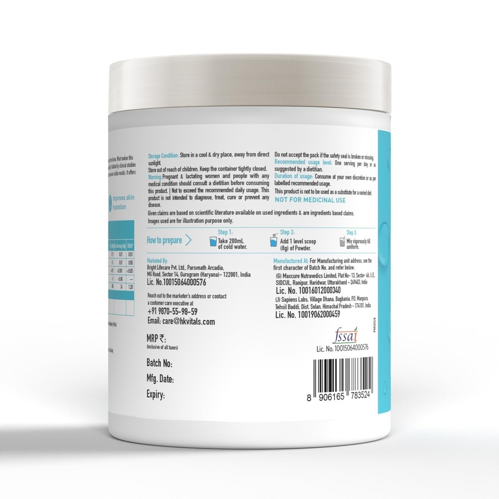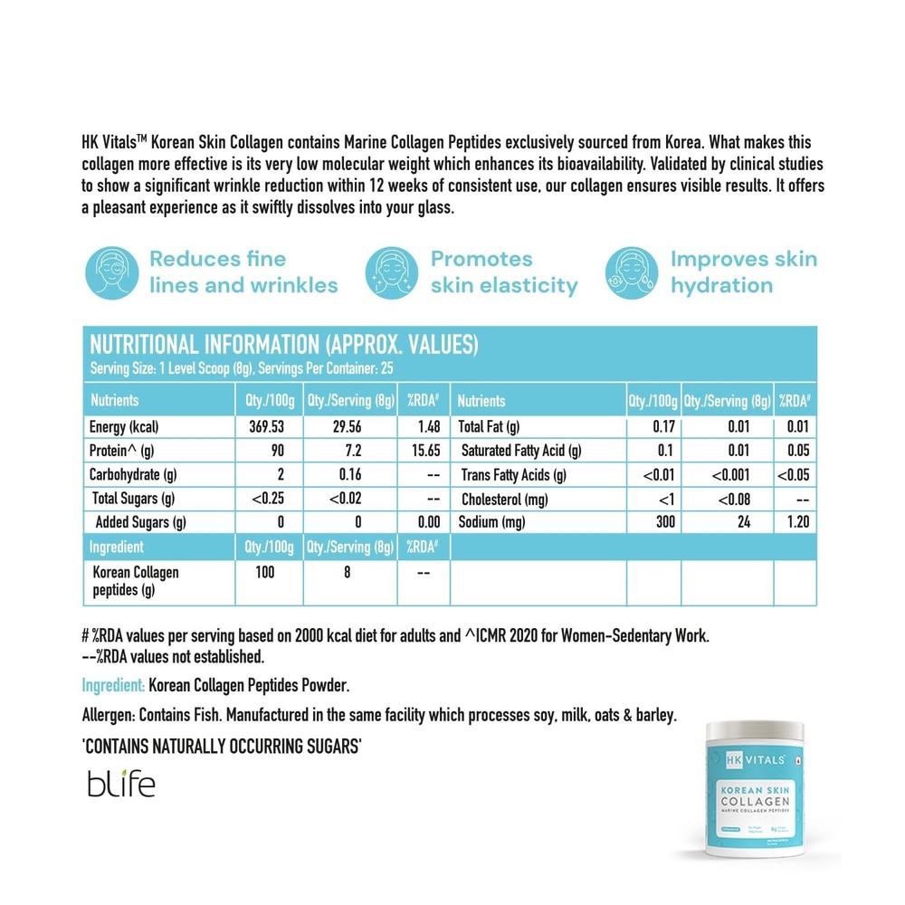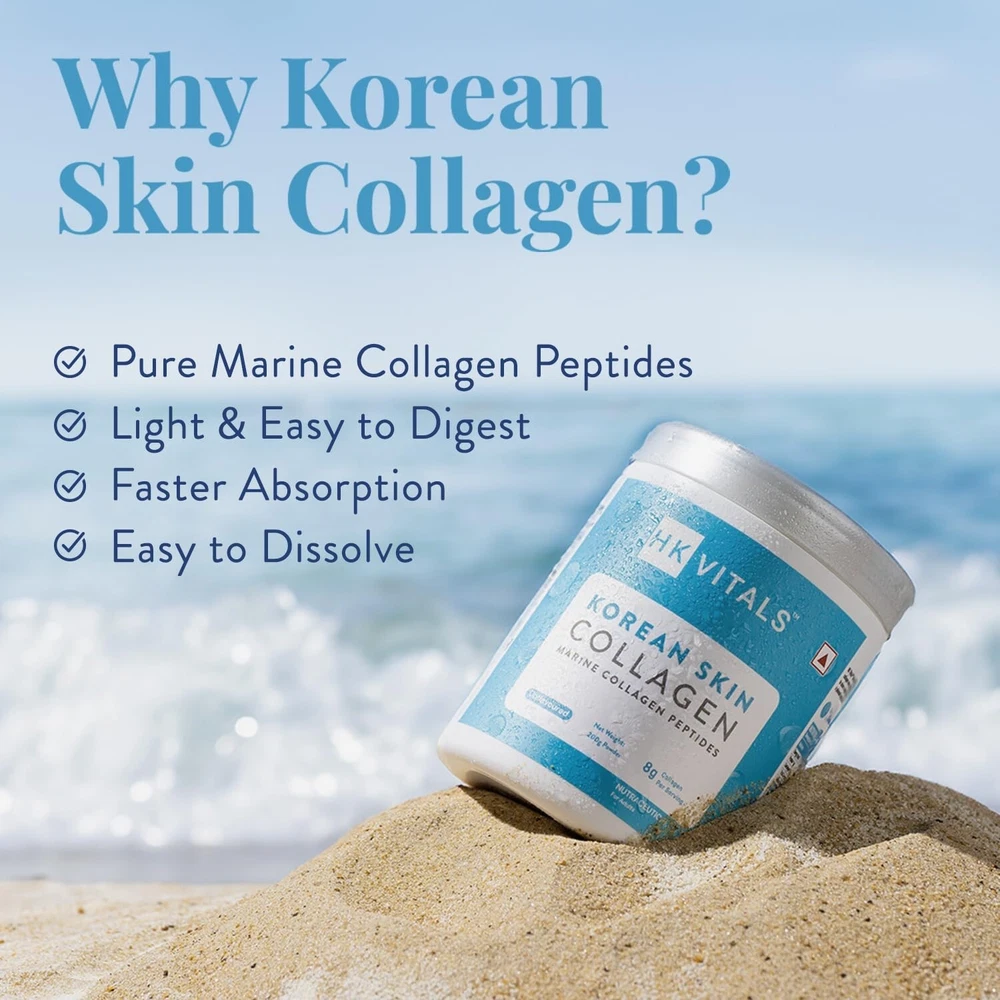 About this item 100% PURE MARINE COLLAGEN: Sourced exclusively from the pristine blue waters of Korea, renowned as the skincare capital of the world, this 100% Pure Korean Skin Collagen is a skincare essential. And the best part? It stands out with its light texture and quick dissolvability, plus does not leave any lumps - ensuring a truly smooth skincare experience, every day DELIVERS PROVEN RESULTS ON SKIN IN 12 WEEKS: With HealthKart hk vitals Korean Skin Collagen, you're not just nurturing your skin, you're also ensuring definite results. It is clinically proven for results - reduces wrinkles and improves hydration in 12 weeks and helps with UV protection & skin elasticity IMPROVES SKIN ELASTICITY: The initial signs of skin ageing are often the result of deeper changes - primarily your skin’s inability to renew itself due to the natural loss of collagen. Korean Skin Collagen has marine collagen peptides that reach deep into your skin and help replenish your body’s lost collagen. This results in enhanced elasticity and a visible reduction in fine lines and wrinkles. BOOSTS HYDRATION: A dry, poorly hydrated skin often looks dull, with signs of ageing looking more noticeable. This collagen supplement for women and men works effectively to improve skin hydration, leaving your skin soft, supple and glowing EASY TO DIGEST & HIGH ABSORPTION: Collagen molecules are typically large and complex, which can make them difficult for the body to break down and absorb properly. However, this collagen supplement is formulated using collagen peptides that have a low molecular weight. This, in turn, helps ensure that it is easily digestible, facilitating efficient absorption by the body. BLENDS EASILY WITH VARIOUS DRINKS AND FOODS: Savor this unflavoured collagen powder that swiftly dissolves with your favourite drink (coffee, smoothies, juice) and integrates seamlessly into your daily skincare routine. Product Description Previous page Next page Previous page Next page