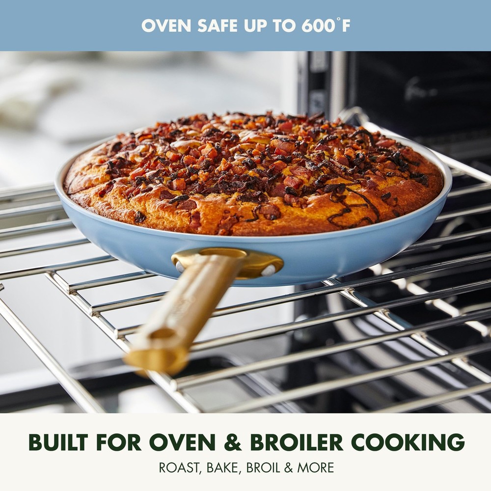 SET INCLUDES: 10" and 12" frypans REINFORCED WITH DIAMONDS: 's original diamond-infused nonstick coating offers remarkable durability, balanced heating, and effortless cleanup TOXIN-FREE: 's Thermolon healthy ceramic nonstick coating is free of PFAS, PFOA, lead, and cadmium DUOFORGED ARMORED BODIES: Pretreated before they’re hard anodized, these pans deliver extraordinary strength and scratch resistance with uniform heat BUILT FOR OVEN COOKING: Oven and broiler safe up to 600°F and suitable for all stovetops, except induction STYLISH FLAIR: Gorgeous gold-tone handles add a pop of color to any kitchen STAINLESS STEEL HANDLES: Riveted matte-finished handles offer a safe and secure grip EASY TO CLEAN: These pans are dishwasher safe for easy cleanup, but most messes will wipe clean