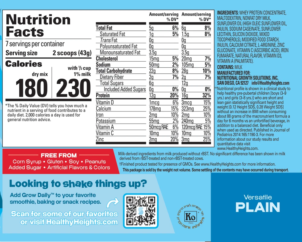 eBay Product details Healthy Heights’ Grow Daily 3+, specially formulated protein powder shakes for children between ages 3 to 9 years old. In delicious Plain, Chocolate and Vanilla flavors, our unique shake mix formulas contain the right combination of protein, amino acids, vitamins and minerals needed to support healthy growth and physical development in children. Premium children’s nutrition is our mission, developed by pediatricians Healthy Heights Grow Daily 3+ is shown to support optimal growth and designed for the specific nutritional needs of children ages 3-9 years. Designed for tiny tummies, each delicious 4oz shake is packed with12 grams of protein, 350 milligrams of arginine, zinc, calcium, iron, and vitamins A, C, D, supporting healthy growth when included as a part of an overall healthy diet. This product is gluten free, soy free, and rBST free, contains no human growth hormones (HGH), corn syrup, artificial colors, flavors, or preservatives, and plain has no added sugar. Your child will get the nutrition they need, with a taste they’ll enjoy. Healthy Heights’ Grow Daily 3+, specially formulated protein powder shakes for children between ages 3 to 9 years old. In delicious Plain, Chocolate and Vanilla flavors, our unique shake mix formulas contain the right combination of protein, amino acids, vitamins and minerals needed to support healthy growth and physical development in children. Premium children’s nutrition is our mission, developed by pediatricians Healthy Heights Grow Daily 3+ is shown to support optimal growth and designed for the specific nutritional needs of children ages 3-9 years. Designed for tiny tummies, each delicious 4oz shake is packed with12 grams of protein, 350 milligrams of arginine, zinc, calcium, iron, and vitamins A, C, D, supporting healthy growth when included as a part of an overall healthy diet. This product is gluten free, soy free, and rBST free, contains no human growth hormones (HGH), corn syrup, artificial colors, flavors, or preservatives, and plain has no added sugar. Your child will get the nutrition they need, with a taste they’ll enjoy. Great for picky and finicky eaters, active kids, leaner kids needing to gain weight and parents concerned about their child’s nutrition and appreciate the benefits of premium nutritional products. Easily supplement your child's breakfast, lunch, dinner or bedtime snack with a kid-friendly nutritional protein shake or use when baking to give an extra boost of protein, vitamins, and minerals to pancakes, muffins, waffles, doughnuts and cookies. Simply mix with water, milk/milk alternative, shake and drink.