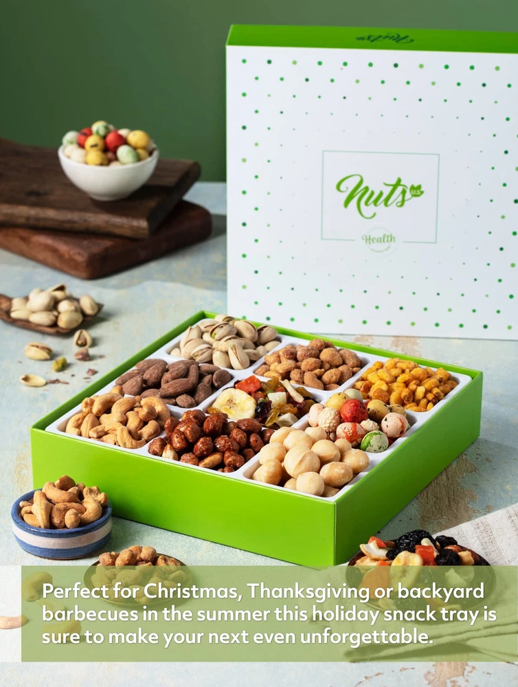 9 variety of nuts and dried fruit blend in outstanding gift box. Gourmet Assorted 9-Variety Gift Basket: Experience the gourmet blend of sweet and savory with 9 premium varieties, including California Pistachios, Cashews, Macadamia, Almonds, Honey Peanuts, Toffee Peanuts, Corn Nuggets, Japanese Mixed Nuts, and Assorted Nuts. Perfect for gifting or indulging at home. Freshly Roasted for Satisfying Crunch: Our nuts are roasted at optimal temperatures to lock in their natural flavors and crunchiness. A Thoughtful Gift for All Occasions: This gift box is ready for Christmas, New Year, Valentine’s Day, Birthdays, Anniversaries, and Corporate Events. Whether you’re celebrating a milestone or showing appreciation, this gourmet snack box makes every moment special. Wholesome and Healthy Snacks: Made with all-natural, vegan-friendly ingredients, this assortment is a healthier choice for snacking. Rich in protein and free from trans fats, it’s a heart-smart option for anyone on your gift list. Proudly Packed and Shipped in the USA: Each gift box is prepared in the USA to ensure top-quality freshness and safety. Perfect for sharing with family, coworkers, clients, or as a hostess gift, this beautifully packed set is ready to impress.
