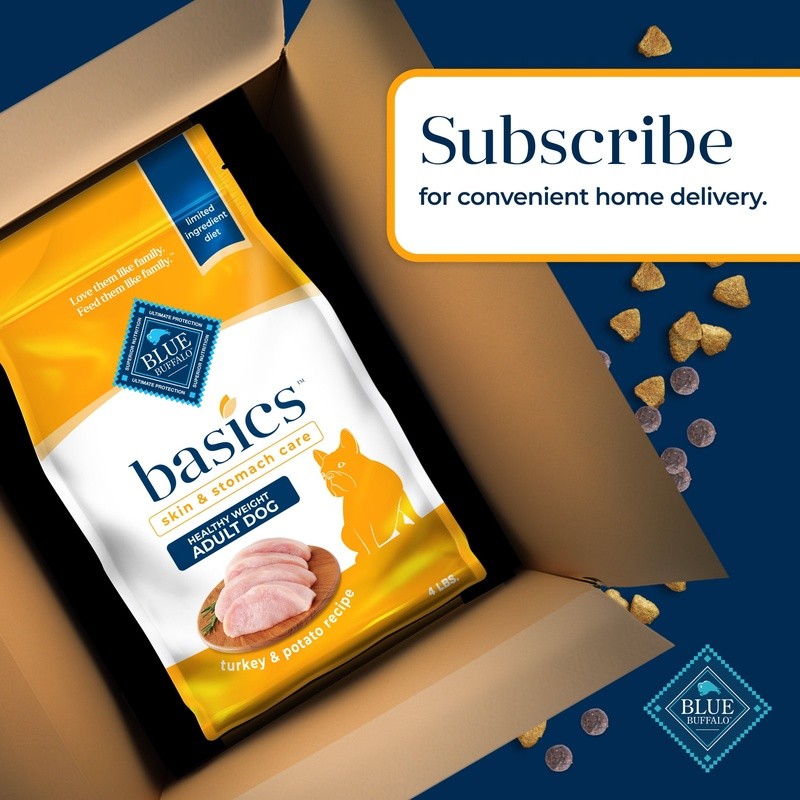Support your adult dog's skin and digestive health with Basics Healthy Weight Adult Dry Dog Food, Turkey & Potato Recipe. Formulated with healthy ingredients that support gentle digestion, this limited-ingredient dog food promotes healthy skin and a shiny coat with Omega 3 & 6 fatty acids. What's more, this dry dog food is made with real turkey as the first ingredient to help build and maintain strong muscles, plus L-Carnitine and fiber to support an optimal weight while providing a satisfying meal. And like all natural dog foods, BLUE Basics contains no chicken (or poultry) by-product meals. It's also free of corn, wheat, soy, artificial flavors, and preservatives. REAL TURKEY FIRST: This dry dog food is made with real, high-quality turkey as the #1 ingredient WEIGHT MANAGEMENT: This diet is made with real, turkey as the first ingredient to help build and maintain strong muscles, plus L-Carnitine and fiber to support an optimal weight while providing a satisfying meal IMMUNE SYSTEM SUPPORT: This dry dog food contains exclusive, antioxidant-rich LifeSource Bits HEALTHY, WHOLESOME INGREDIENTS: This dog food is made with no chicken (or poultry) by-product meals, and no corn, wheat, or soy Contains: One (1) 4-lb bag of BLUE Basics Skin & Stomach Care Healthy Weight Adult Dry Dog Food, Turkey & Potato Recipe ENHANCED IMAGERY: We have enhanced our digital product packaging to highlight our products’ ingredients and essential benefits; while the physical packaging will differ slightly, all information is accurate