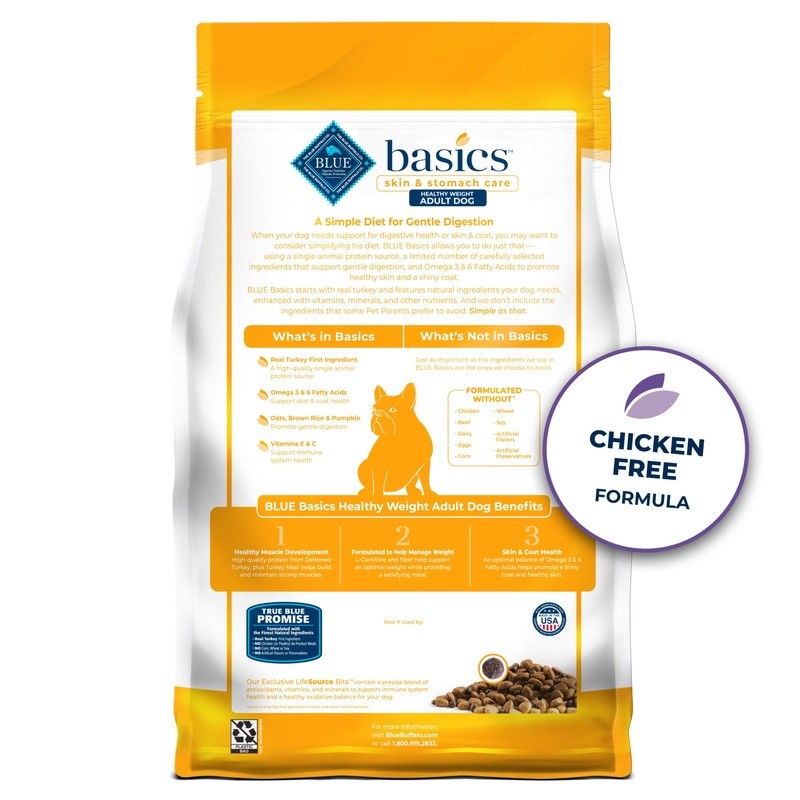 You may also like Stainless Steel Manual Frozen Meat Slicer Mutton Ham Beef Cutter Cutting Machine 24.25 USD 25.8 USD Free shipping 6% off 27 Gallon Plastic Storage Bin W/ Lockable Snap Lid Organizing Gear Tools Toys US 15.51 USD Free shipping Kitchen Poultry Shears, Heavy Duty Stainless Steel Bone Scissors for Meat & Fish 11.12 USD 11.71 USD Free shipping 5% off Stainless Steel Fish Scaler Brush – Scale Scraper & Skin Remover Seafood Tool 4.66 USD 4.9 USD Free shipping 5% off Wooden Handle Stainless Steel Measuring Cups OR Spoons Baking Tools Coffee 8.22 USD 8.65 USD Free shipping 5% off Pre-seasoned Cast Iron Dutch Oven Pot W/ Skillet Lid Ergonomic Handles 3Qt New 47.24 USD 54.8 USD Free shipping 14% off Clear Stackable Storage Bin 72Qt W/ Secure Latch Ideal Home Organization New 10.5 USD Free shipping Flip Top Glass Bottles 1L Pack of 6 Airtight Leakproof Stoppers Beverages New 54.31 USD 57.78 USD Free shipping 6% off 1X Metal Wallet Stainless Steel Credit Card Holder RFID Enclosed Protective Case 5.49 USD 5.78 USD Free shipping 5% off Cast Iron Dutch Oven 7.3Qt Enameled Cookware Oven Safe Heat Retention Easy Clean 56.75 USD 62.24 USD Free shipping 9% off Cordless Rechargeable Floor & Carpet Sweeper lightweight Powerful Floor Sweeper 59.24 USD 75.71 USD Free shipping 22% off 10PCS V Tapes Shape Tape Anti Wrinkle Instant Face Neck Eye Lift Face lift 5.37 USD 5.65 USD Free shipping 5% off BLUE Basics Healthy Weight Turkey and Potato Recipe for Adult Dogs is a deliciously simple limited-ingredient diet for skin and stomach care. It’s designed to support healthy skin and gentle digestion. This dry dog food starts with real turkey as its only animal protein source and contains no corn, wheat, soy, dairy, or eggs, making it ideal for dogs with food sensitivities. This BLUE Basics Healthy Weight formula contains L-Carnitine and fiber to help support your dog’s optimal weight while providing a satisfying meal. Like all BLUE dry foods, BLUE Basics includes exclusive antioxidant-rich LifeSource Bits, which are “cold-formed” to retain their potency. Give your dog the balanced nutrition of BLUE Basics today. BLUE Basics is brought to you by , the leader in natural pet food. makes premium-quality pet foods featuring real meat first, wholesome whole grains, and healthy fruits and vegetables. Love them like family. Feed them like family. STARTS with REAL TURKEY: This adult dry dog food features a single animal protein source along with potatoes, peas and pumpkin to support gentle digestion, making it a good option for dogs with a sensitive stomach LIMITED INGREDIENT HEALTHY WEIGHT DOG FOOD: BLUE Basics doesn’t contain any chicken, beef, corn, wheat, soy, dairy or eggs making it a good option for dogs with food sensitivities; formulated with reduced calories from fat to help dogs manage weight ANTIOXIDANT-RICH LIFESOURCE BITS: A precise blend of antioxidants, vitamins and minerals carefully selected by holistic veterinarians and animal nutritionists to support immune system health, life stage needs and a healthy oxidative balance A NATURAL DOG FOOD: BLUE dry dog food is made with the finest natural ingredients enhanced with vitamins and minerals; BLUE contains NO chicken (or poultry) by-product meals, corn, wheat, soy, artificial flavors or preservatives Contains One (1) 24lb bag of BLUE Basics Skin & Stomach Care, Natural Adult Healthy Weight Dry Dog Food, Turkey & Potato Flex Angle Tool, Adjustable Arc Scriber for Precision Marking in Wood Metalwork 6.85 USD 7.21 USD Free shipping 5% off 3 Style Stainless Steel Multi-functional Egg Slicer Heavy Duty Hard Boiled Eggs 6.26 USD 6.59 USD Free shipping 5% off Kitchen Bone Scissors - Heavy Duty Stainless Steel Poultry Shears for Chicken 11.12 USD 11.71 USD Free shipping 5% off One-Hand Operation Bag Holder - Adjustable Stand for Food Prep, Storage Bags 4.96 USD 5.22 USD Free shipping 5% off Meat Tenderizer Hammer, Stainless Steel Mallet Tool for Steak Beef Chicken 5.73 USD 6.03 USD Free shipping 5% off Knife Sharpening System - 4-Stage Professional Sharpener with Diamond & Ceramic 5.69 USD 5.99 USD Free shipping 5% off Butter Spreader & Stick Holder Evenly Spreads Butter on Pancakes,Toast and Bread 5.48 USD 5.77 USD Free shipping 5% off 20x Aluminum Mini Heavy Duty Carabiner Key Chain Snap Hook Clip Outdoor Camping 6.96 USD 7.33 USD Free shipping 5% off Anti-Slip Weight Lifting Grips for Bodybuilding, Gym Workout Hand Protectors 6.75 USD 7.11 USD Free shipping 5% off Wave Taco Holder Stand - BPA-Free Plastic Rack & Tray for Mexican Cooking 4.59 USD 4.83 USD Free shipping 5% off Multi-Function Heavy Duty Egg Slicer -Stainless Steel Cutter for Hard Boiled Egg 6.25 USD 6.58 USD Free shipping 5% off 4Pcs Reusable Gas Stove Burner Covers Kitchen Cleaning Protector Liners&Mat Pads 5.8 USD 6.1 USD Free shipping 5% off