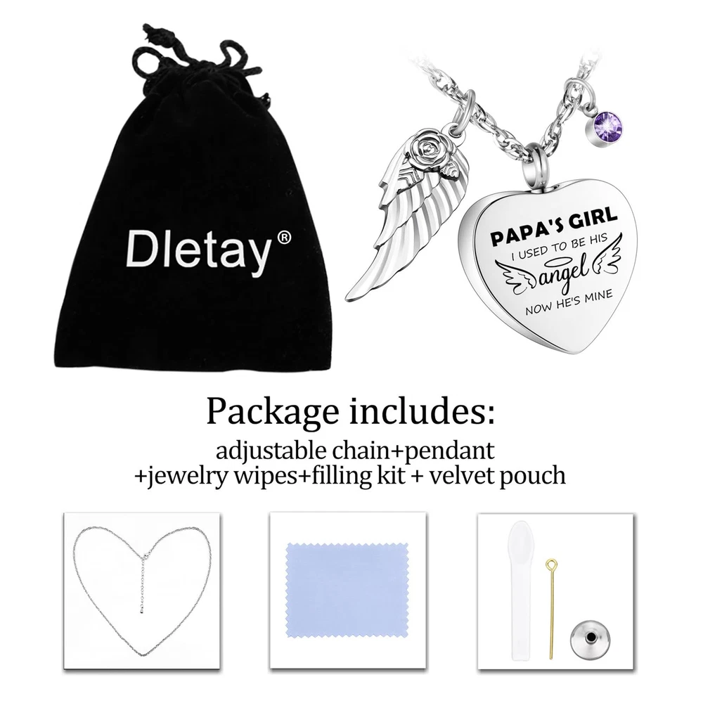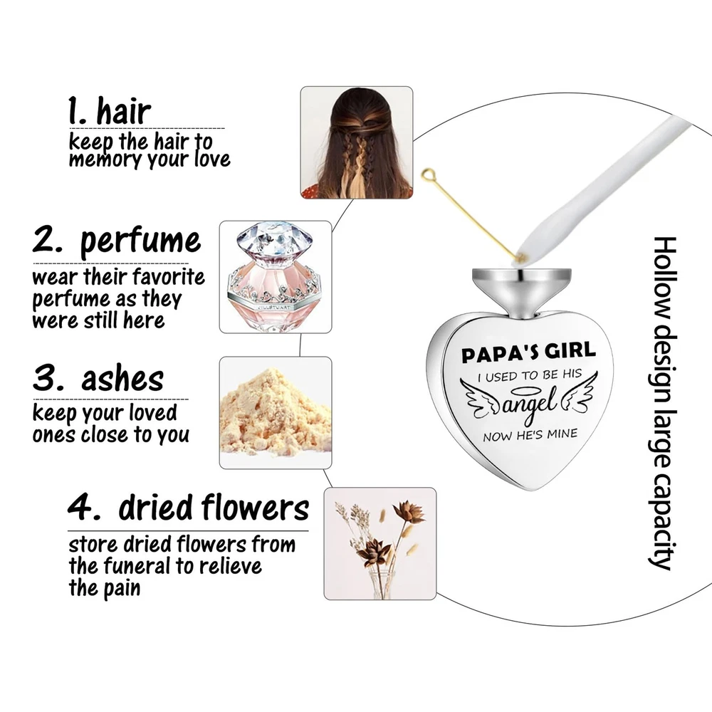 Stainless Steel Memorial Cremation Jewelry: Things would end but memory lasts forever. Cremation jewelry allows you to take that small piece of your loved ones with you wherever you go. Your urn jewelry from our store goes right along with you wherever you are. Handling the loss of a loved one is the hardest thing we deal with in life, but having your piece of keepsake jewelry with you at all times brings remembrance of the good times and allows you to express your memories of your loved one to others. Life may be gone, but memory lasts forever. Feature: Waterproof Design : with rubber sealing ring and welding craftsmanship for the chain, you can make sure the inside content is safe and secure. Simple Design: : This high quality heart urn necklace is dainty, simple and classic. It makes a great keepsake necklace to store ashes for those who have lost a loved one. Sturdy Chain : Welding of chain circles to prevent it from breaking. Package Include: 1 x Memorial pendant 1 x Stainless steel chain 1 x Filling kit 1 x Velvet pouch 12 x Birthstones Customer Service: We strive to provide the best products and service for our customers. If you have any complaints about the products, please feel free to contact us. Your satisfaction is our constant goal. HEART CREMATION NECKLACE: This delicate heart urn necklace will save the memories of your loved ones and bring you comfort. Keep it close to your heart wherever you are, not only as a decoration, but also as a great way to commemorate your loved ones. Keep your loved ones close to your heart always. 12 BIRTHSTONES: Each cremation necklace comes with 12 birthstones, you can personalize your necklace with different birthstone and angel wing charm to match different outfit. EXQUISITE WORKMANSHIP: Made of premium grade stainless steel, pendant &chain will never rust, corrode, rust or stain. Spot welding craftsmanship for the chain makes sure you will never lose your memories! Screw & rubber gasket secures a tight seal to keep your loved ones ashes. IDEAL GIFT: Cremation Jewelry, also known as funeral jewelry, memorial jewelry, or remembrance jewelry can be a present to your family and friends. Come with a beautiful velvet pouch. Ready for gift giving and make the best impression! Also comes with a tool for you to fill the memories in. A thoughtful present for family and friends on Christmas, Birthday, Anniversary, Thanksgiving, New Year's Day to cherish loved ones. SIZE- Pendant: 2.5*2 cm(0.98*0.79"); adjustable chain length: 50+5 cm(20+2") this length works great for about everyone, you can't go wrong with this length.