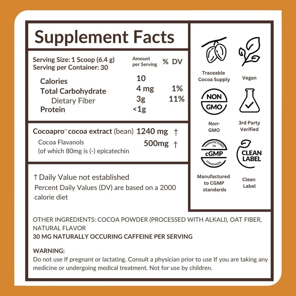 Cardio Health Cocoa Powder, 30 Servings, 500mg Cocoa Flavanols, Support Heart Health, Boost Nitric Oxide, Improve Circulation, Energy, Preworkout, Vegan, Dark Chocolate Cacao CLINICALLY PROVEN RESULTS - Backed by more than 20 s of Scientific Research, 30 plus Clinical Studies, and 150 Published Scientific Papers. Cocoa Flavanols are one of the most researched plant-based nutrients. PROMOTES A STRONG HEART & CARDIOVASCULAR HEALTH - Helps improve vascular elasticity and arterial function, and blood flow. NITRIC OXIDE SUPPLY BOOSTER - Cocoa flavanols increase nitric oxide output, a super molecule that enhances circulation by making arteries more flexible. This results in a boost of oxygen supply through heart, muscles and brain. POWER UP YOUR WORKOUTS with circulation boosting bioactives. Like a natural pre workout, these cocoa based bioactives help boost nitric oxide supply for better blood flow and nutrient delivery to the muscles when they need it most. MOST CONCENTRATED COCOA FLAVANOL PRODUCT* – Tested & Verified by Consumer Labs. Each scoop contains 500 mg of Cocoa Flavanol and also delivers 30 mg of naturally occurring caffeine. Cocoa Flavanols work best when taken daily. Consider adding to your morning coffee, smoothies or oatmeal. *Among 46 Cocoa Products.