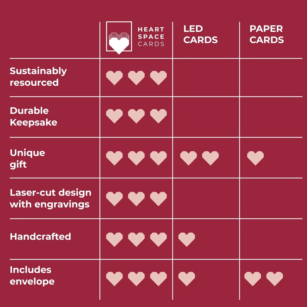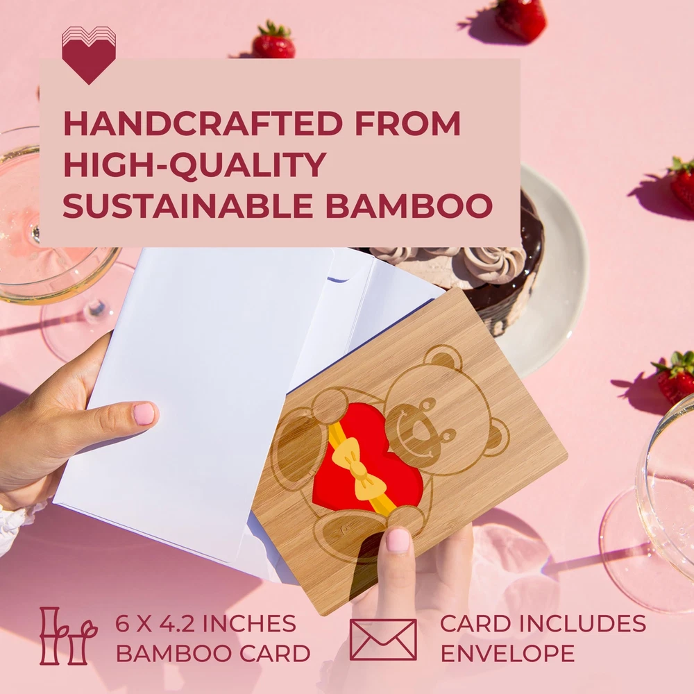 Let them know that they are surrounded by warmth and love with this teddy bear inspired card. This lightly colored wood card features a sweet teddy bear holding a brightly colored red heart tied with a yellow ribbon. This pop of color shows the recipient that they're in your heart. Inside the playful teddy bear theme is reflected as the perfect backdrop for a handwritten message or note. UNIQUE EXPRESSION OF LOVE - Elevate heartfelt messages with HeartSpace's handcrafted bamboo cards. Swap paper for this distinctive wooden card, a perfect anniversary card for your wife, husband, or an 'I love you' card for your girlfriend. Express your love uniquely! ENDURING KEEPSAKE - The wooden anniversary card from HeartSpace isn't just a card; it's a durable, long-lasting memento of your affection. Perfect for any wedding anniversary or to express your deep, unspoken love. LUXURY & NATURE IN YOUR HANDS: Experience the luxurious blend of artistry and sustainability with HeartSpace's handcrafted bamboo cards. Paired with quality envelopes, they are perfect for birthdays or anniversaries. YOUR LOVE, YOUR WORDS - Inside, left blank, HeartSpace's Bamboo Love Cards offers a canvas for your emotions. Craft a personalized anniversary card or a sincere expression of love that truly speaks from your heart to your loved one. SUSTAINABLE LOVE EXPRESSIONS- Embrace Flora's commitment to sustainability and HeartSpace's mission for a cleaner, greener world. Our eco-friendly sustainable Love Cards are not just heartfelt messages; they symbolize love and respect for Mother Earth.