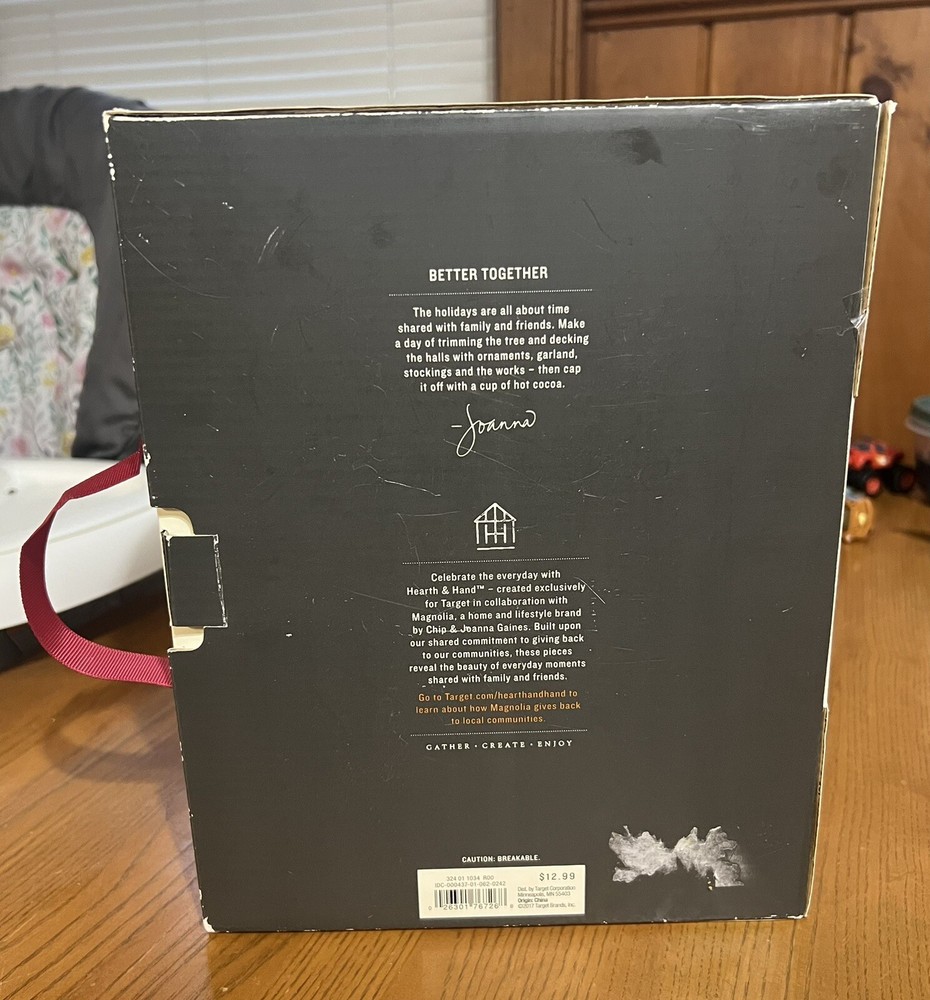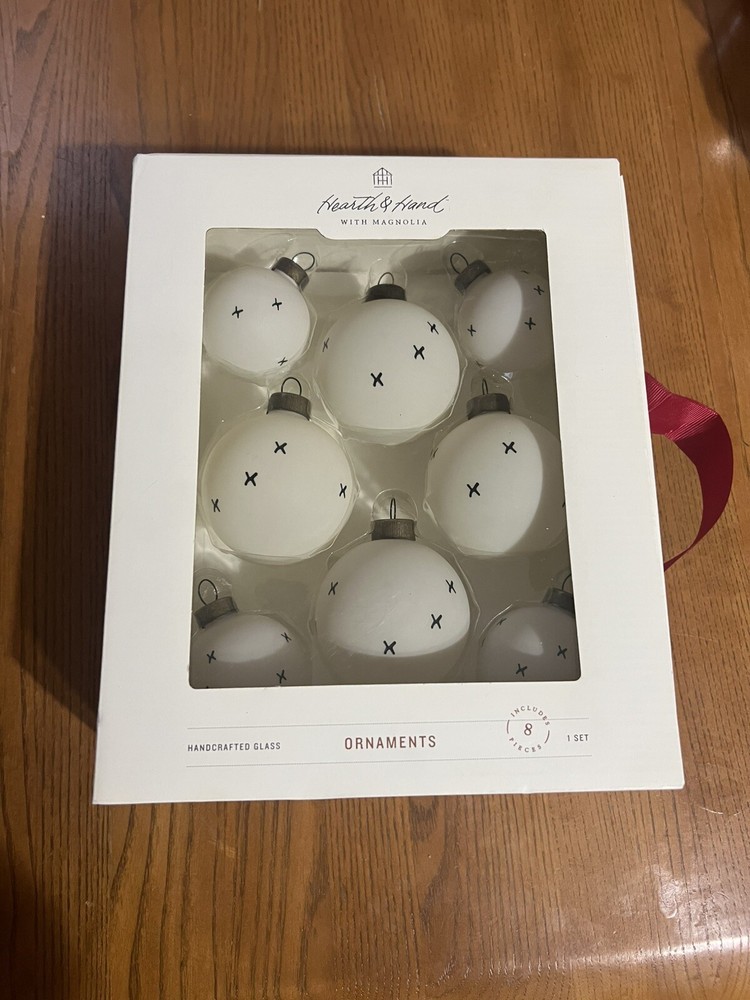 Hearth and hand with magnolia bulb ornaments. White with black X's. Open box. Adorable addition to your simple style tree or other decor for the holidays.
