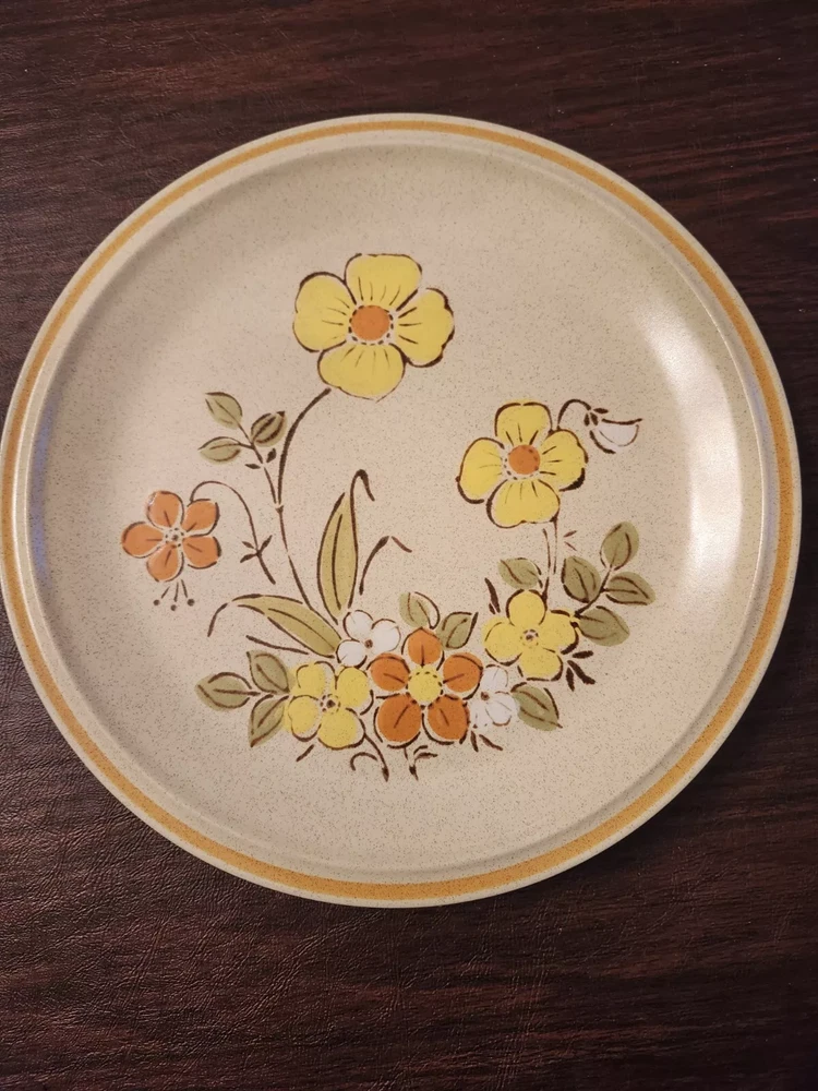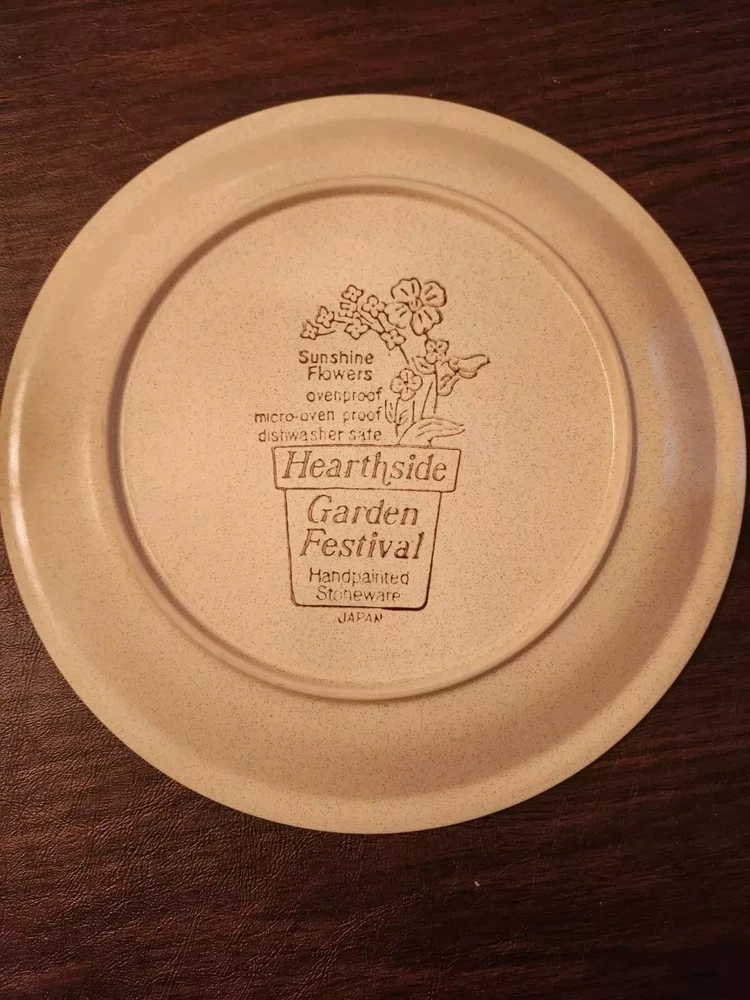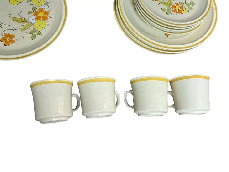 This Hearthside Garden Festival Sunshine Flower Dinner Set of 16 is a beautiful addition to any vintage dinnerware collection. The set includes a four-piece set with a plate, cup, saucer, and dinner plate, all of which feature a vibrant off-white color with orange, yellow, green, and white patterns. The round shape and 10 1/2" width of the plates make them perfect for serving a variety of dishes, while the 10 7/16" diameter of the plates ensures that they are both functional and decorative. Crafted in Japan in the late 20th century, this vintage dinner set is made of durable stoneware material that is perfect for everyday use. The set is an original Hearthside product and is part of the Garden Festival production style. With care instructions that recommend hand washing only, this set is perfect for those who appreciate the retro style and vintage pattern.