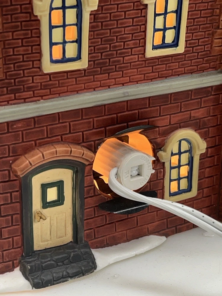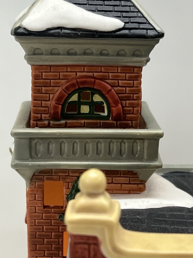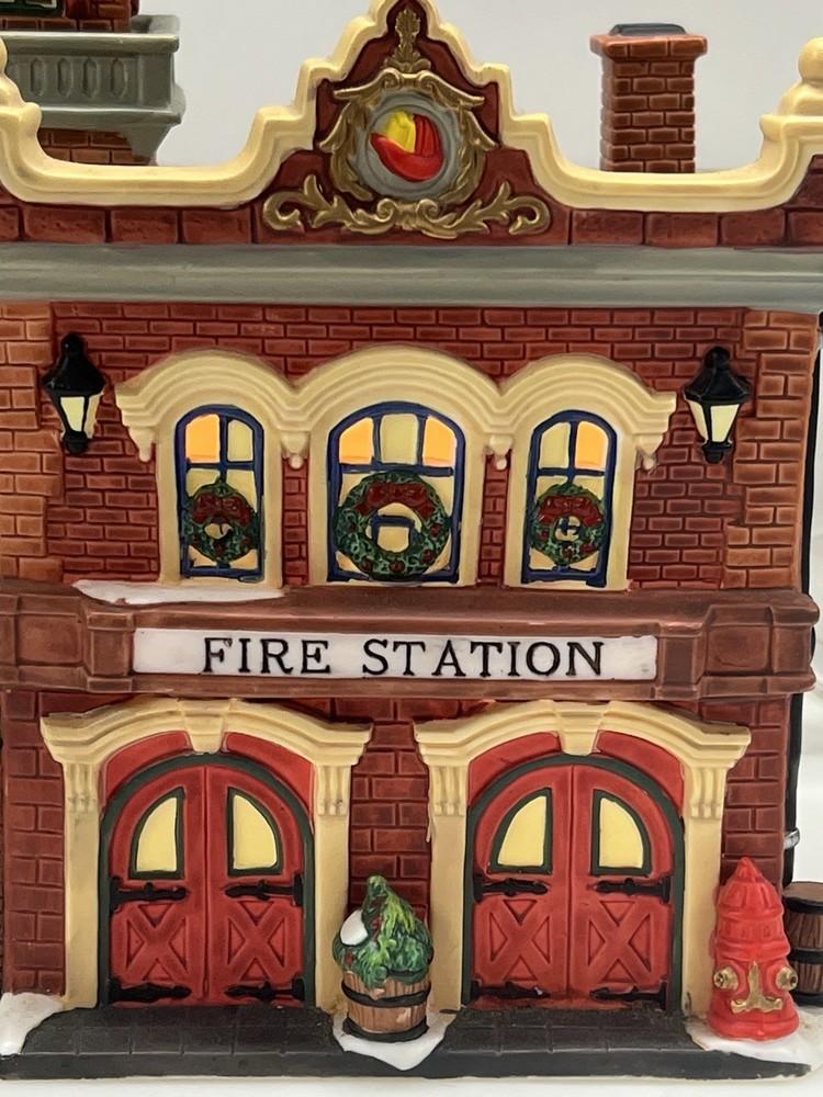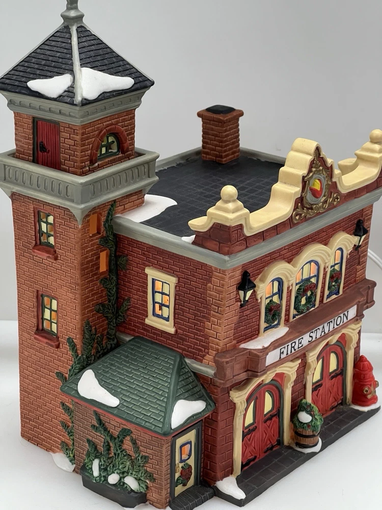 The Heartland Valley Village Fire Station 1999 O'Well Deluxe Lighted is a medium-sized porcelain Christmas village house from the late 20th century. It features a traditional style with a whimsical pattern, depicting a fire station with multicolor illumination. This collectible item, part of the Heartland Valley Village collection, is suitable for decoration in any room during the festive season. The hand-painted and boxed piece adds a charming touch to holiday decor with its asymmetrical shape and fire-themed design. Excellent condition! Comes with all original packaging including cord & light . Outer packaging sleeve has been taped