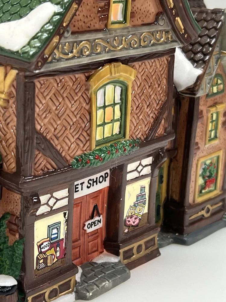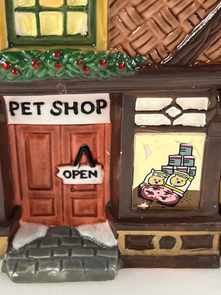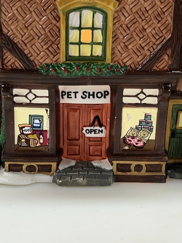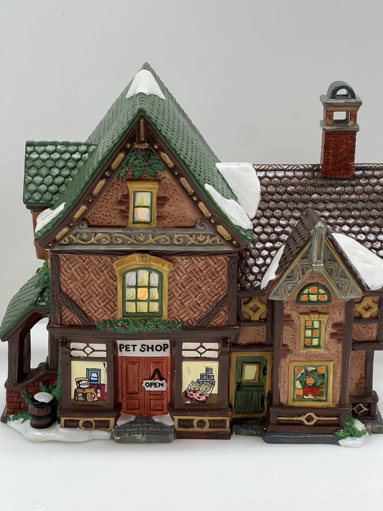 The Heartland Valley Village "Pet Shop" Deluxe Porcelain Limited Edition 1999 O'Well is a charming and collectible Christmas village piece from the late 20th century. This asymmetrical, hand-painted Victorian-style building features a pet shop theme, making it a delightful addition to any seasonal display. Handcrafted with a multicolor finish, this 8" long, 7" high, and 4" wide porcelain structure is both boxed and suitable for any room, adding a touch of nostalgia to your holiday decor. Incredible detail ! Excellent condition! Includes all original packaging including light & cord . Outer sleeve taped .