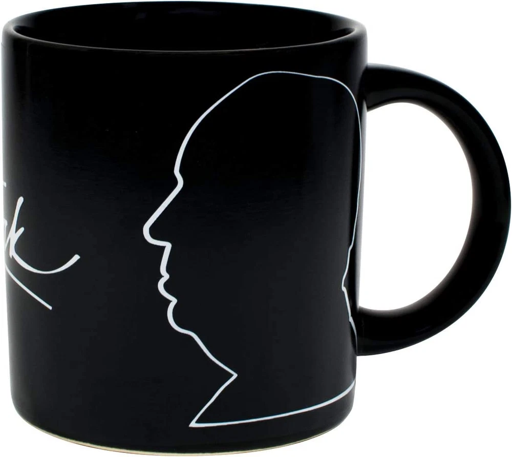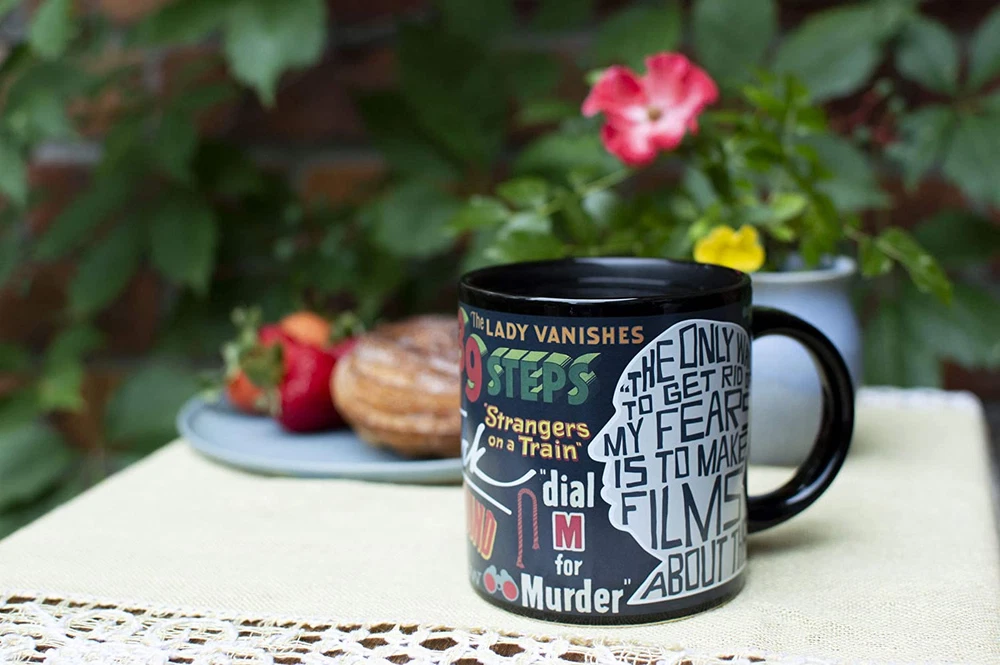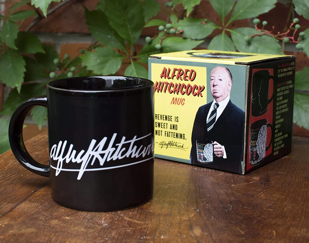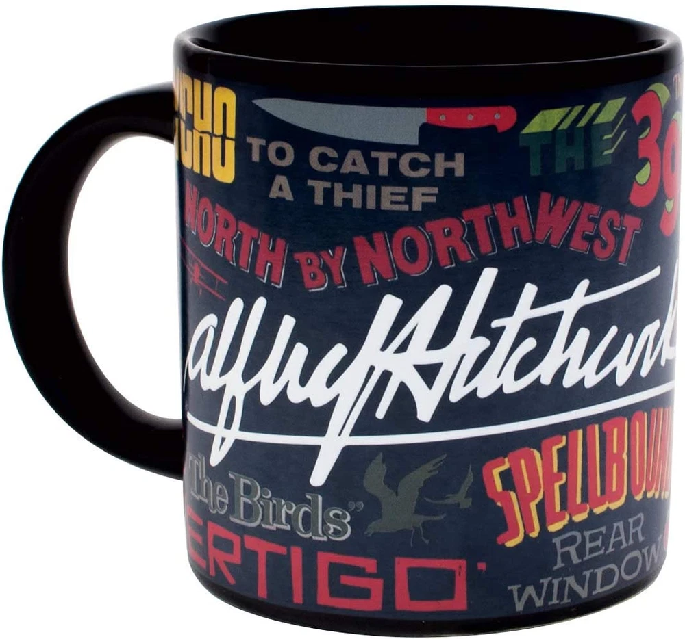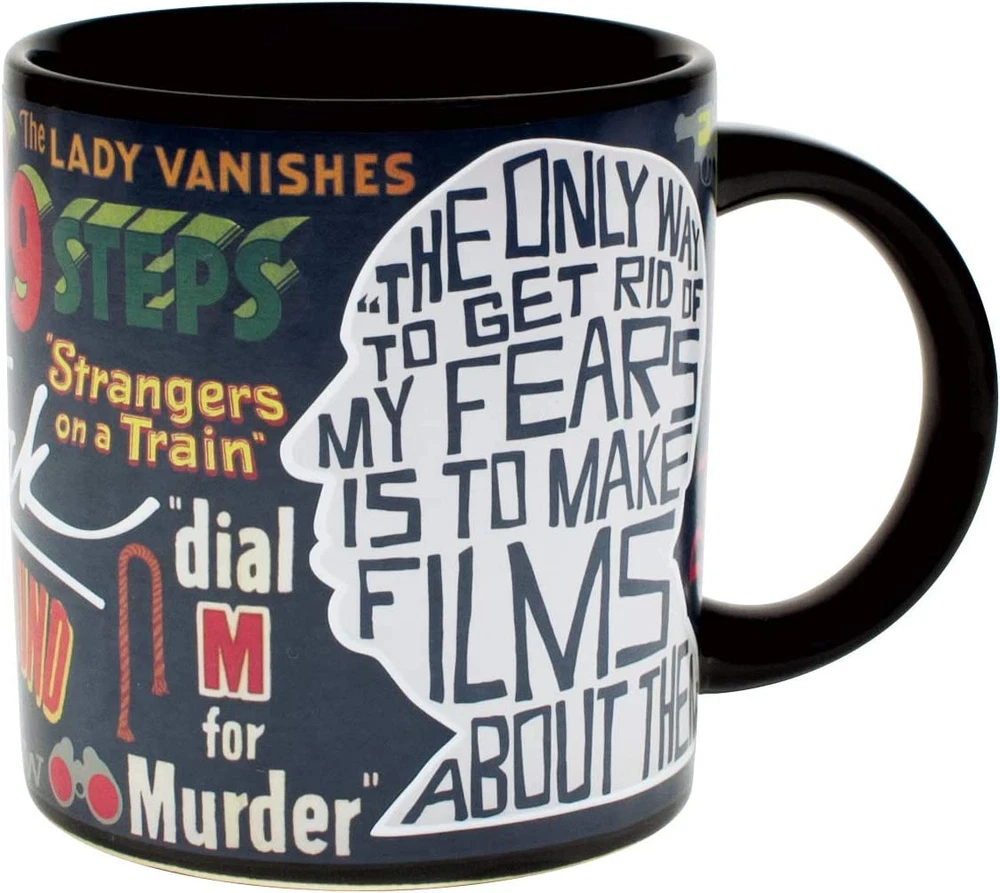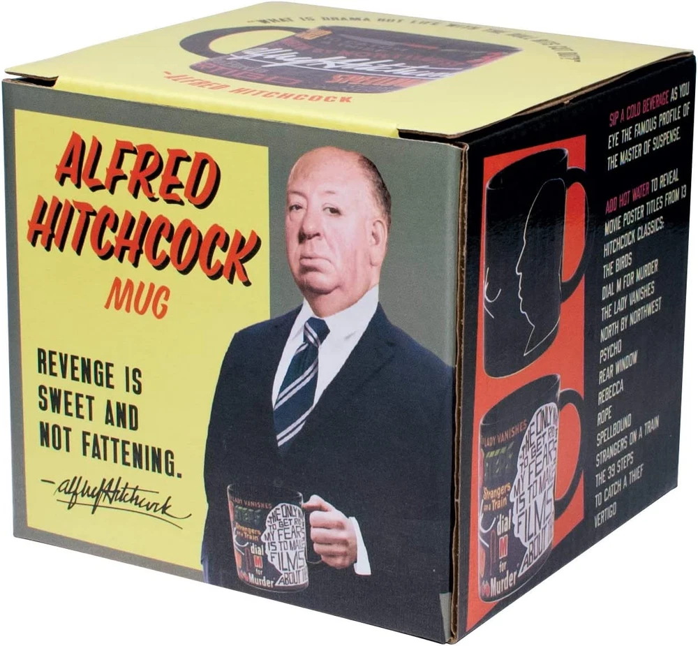 This mug will make you shiver (when you add ice) and perspire (when filled with boiling water). On the cold mug you'll admire the signature and iconic silhouette of Alfred Hitchcock, cinema auteur. Add a hot beverage and his famous works appear-13 movie poster titles-as well as a quote from the Master of Suspense. This mug is your own movie marquis! The Birds ~ Dial M for Murder ~ The Lady Vanishes ~ North by Northwest Psycho ~ Rear Window ~ Rebecca ~ Rope ~ Spellbound ~ Strangers on a Train The 39 Steps ~ To Catch a Thief ~ Vertigo. Officially Licensed by MTK Company. 10 oz. ceramic coffee cup with a comfortable handle. All of our disappearing mugs come in a beautifully designed, colorful box. Heat activated color changing mugs are microwave safe, but not dishwasher safe. Hand wash only. Don't soak. Click the store link near the product title for more great gifts. UPG has presents of mind. This mug will make you shiver (when you add ice) and perspire (when filled with boiling water). On the cold mug you'll admire the signature and iconic silhouette of Alfred Hitchcock, cinema auteur. Add a hot beverage and his famous works appear â - 13 movie poster titles â - as well as a quote from the Master of Suspense. This mug is your own movie marquis! The Birds ~ Dial M for Murder ~ The Lady Vanishes ~ North by Northwest Psycho ~ Rear Window ~ Rebecca ~ Rope ~ Spellbound ~ Strangers on a Train The 39 Steps ~ To Catch a Thief ~ Vertigo 12 oz / 350mL. Disappearing mugs are not dishwasher safe but are microwave safe.