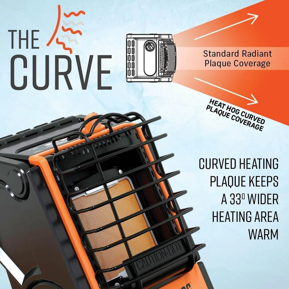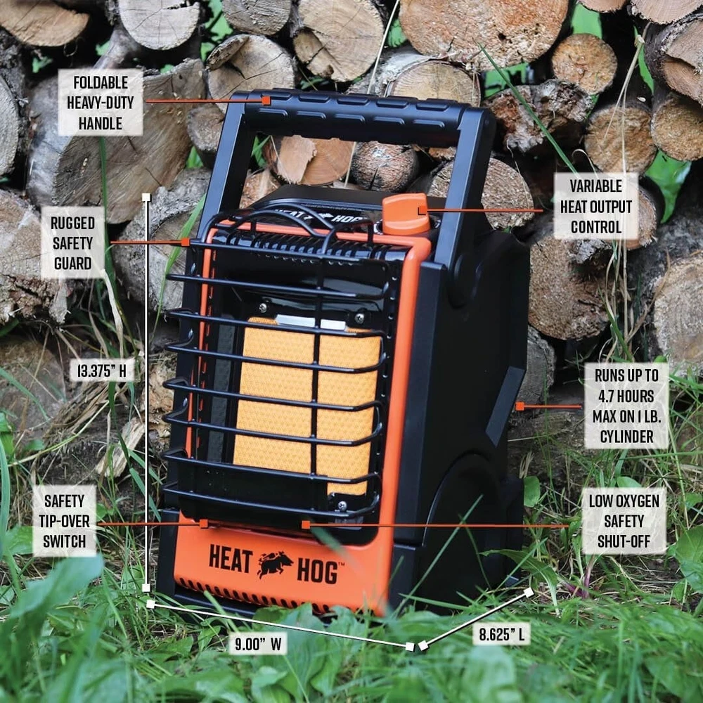 Heat Hog 9,000 BTU Portable Propane Heater The Heat Hog 9,000 BTU Portable Propane Heater is built for convenience, mobility, and efficiency. Running on 1lb propane cylinders, it requires no electricity, making it an excellent heating solution for both indoor and outdoor use. Whether you're camping, hunting, fishing, tailgating, working at a construction site, or warming up a garage, this heater provides reliable warmth wherever you need it. With an adjustable 30° heat angle and a tilting feature, you can easily direct the heat precisely where it’s needed—not just toward your feet. Its curved plaque technology expands the heating area by 33% compared to standard models, ensuring better warmth distribution for greater comfort. Designed for maximum propane efficiency, the built-in warming dock keeps the fuel warm, optimizing energy use and allowing you to get the most BTUs from each tank. This feature ensures consistent heat output, even in colder temperatures. Durable and dependable, the Heat Hog 9,000 BTU heater is made for long-lasting performance. It comes with a 1-year limited warranty for added peace of mind. LP cylinder not included.