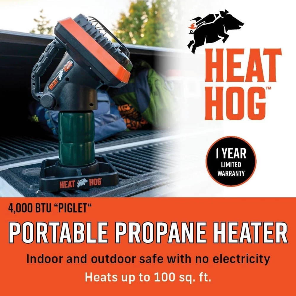 Heat Hog Piglet 4,000 BTU Indoor/Outdoor Portable Propane Heater The Heat Hog Piglet 4,000 BTU portable propane heater is a compact and efficient heating solution designed for both indoor and outdoor use. Whether you're in the garage, tailgating, ice fishing, hunting, camping, or simply need a quick heat source, this lightweight and portable heater delivers reliable warmth without requiring electricity. With a powerful 4,000 BTU output, this heater can effectively warm up to 100 square feet. Running on a 1lb propane cylinder, it provides up to 5.3 hours of continuous heat, making it an ideal choice for on-the-go warmth in any setting. (Propane tank not included.) The adjustable 45-degree tilt head allows you to direct heat exactly where you need it, ensuring maximum efficiency. A mountable base provides stability on rough terrain, making it a practical choice for outdoor adventures. Safety is a top priority with the Heat Hog Piglet. It includes a built-in safety tip-over switch, an Oxygen Depletion Sensor (ODS), and a rugged safety guard for added protection. The heater features a quiet piezo ignition system with a push-button start for effortless operation. Designed for convenience, this heater is light and easy to transport, featuring a heavy-duty carry handle. With its durable construction and user-friendly design, the Heat Hog Piglet is a reliable choice for staying warm in any environment.