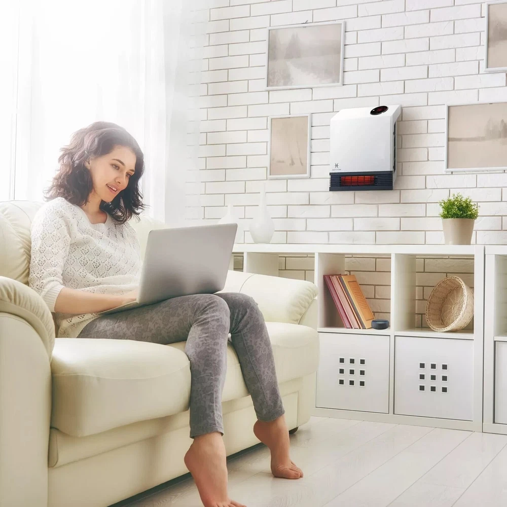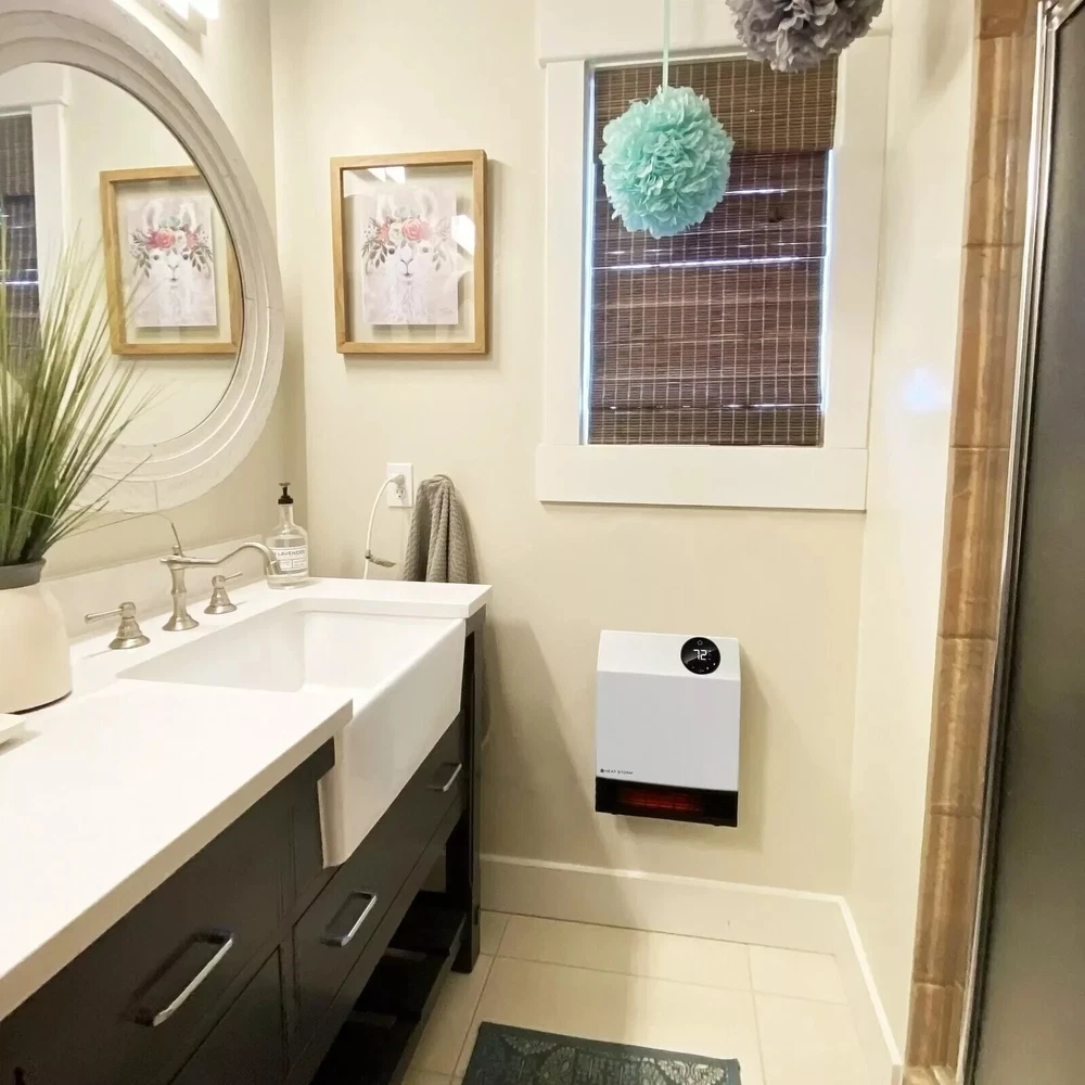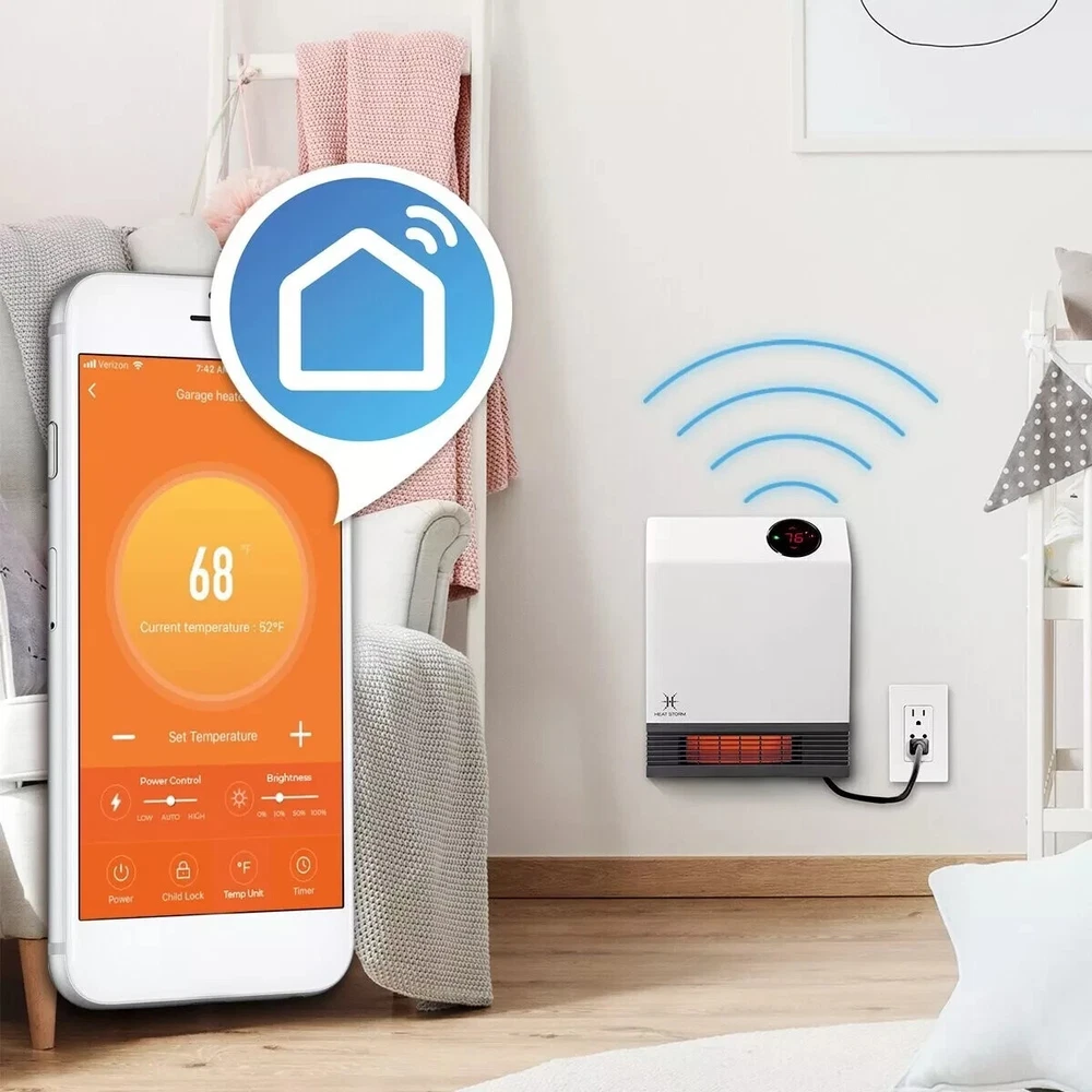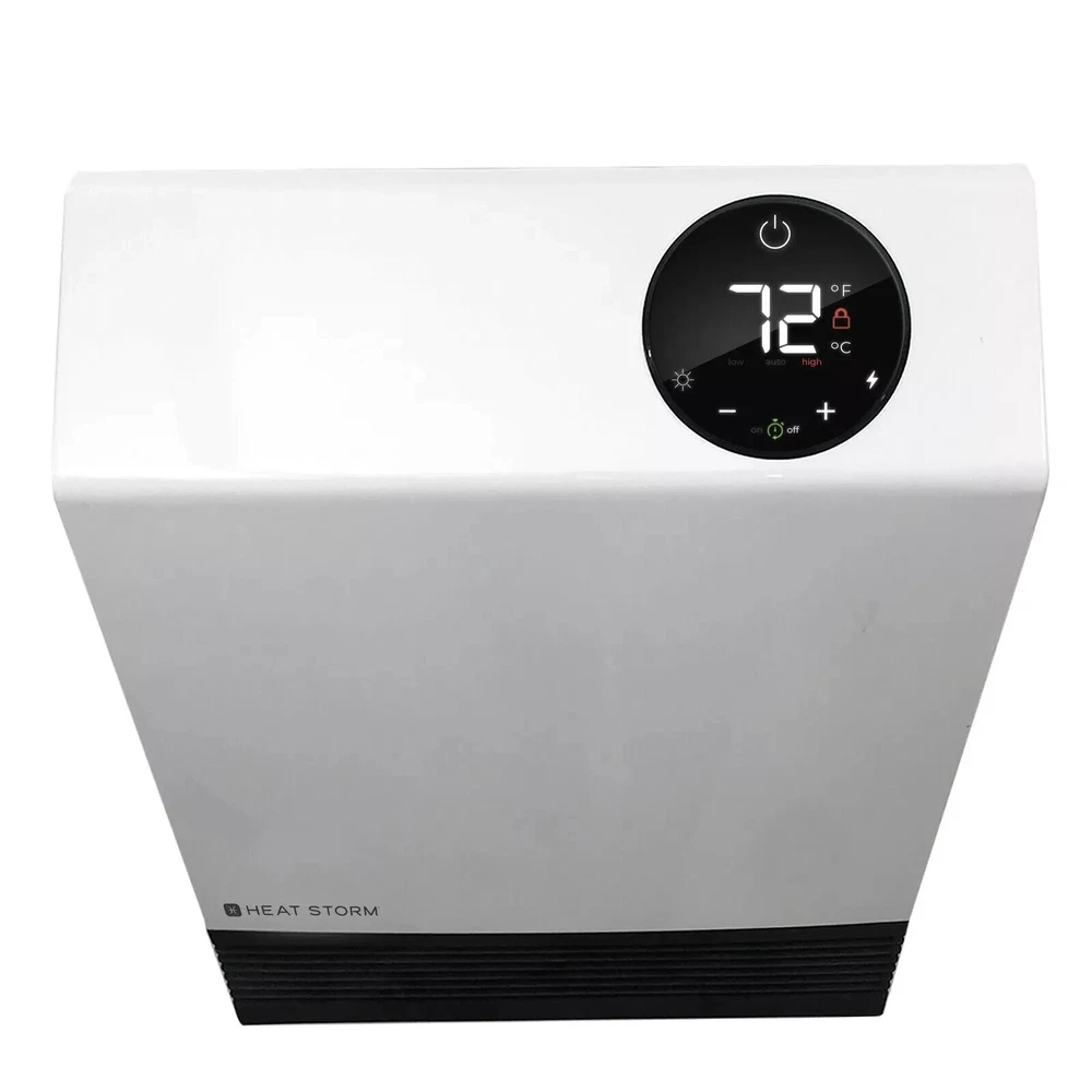 The Heat Storm Deluxe Wall Unit is a great solution for any bedroom or small room where there is not much floor space. At 1,000-Watt this heater will easily heat up your room, but you will not have issues tripping your breaker if you want to run other electronics. This heater is safe to touch, even on the grill, making an excellent choice for anyone. This unit has two power modes, one uses the full 1,000-Watt, while the second mode uses only 500-Watt. Each unit contains our Patented Heat Exchanger with HMS Technology that allows maximum heat from the infrared quartz bulbs without any heat loss from the unit. Highlights Safe to the touch grill, 1000-Watt of power and 3400 BTUs means you can heat up to 500 sq. ft. with supplemental heating Space saving wall mount design means you don't lose floor space, perfect for bedrooms, kitchens, offices and more 1000-Watt Built in thermostat with Wi-Fi capabilities and led display shows you what the ambient temperature is and helps regulate the temperature efficiently, included remote control allows you to control the temperature with ease