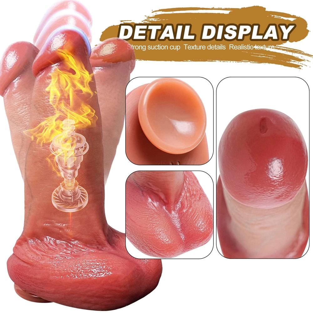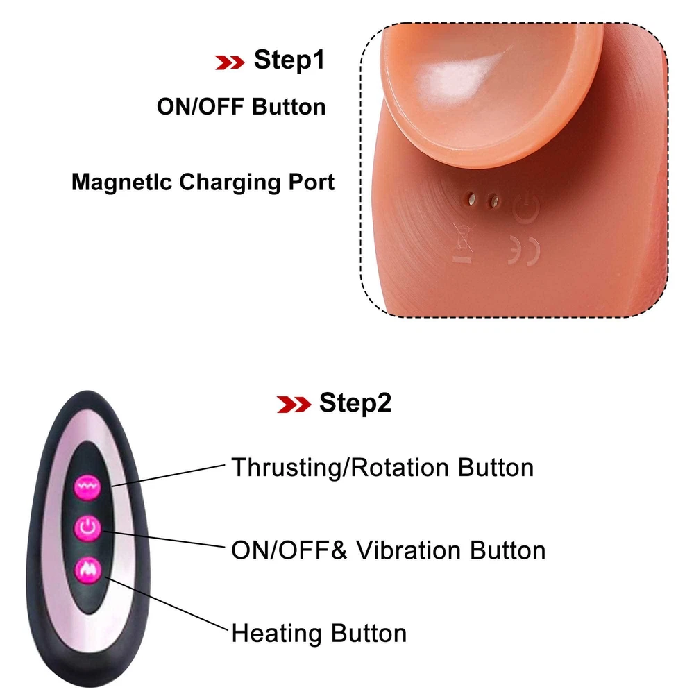 Discreet Package Vibrating&Thrusting&Rotation&Heating&Dildo with Remote Control Features: 【10 Vibration Modes 】 Dildo built-in powerful motor in the glans part, featuring 10 vibration modes , providing intervals, continuous patterns, and high frequency but minimal noise .Ensuring intense and screet stimulation. 【5 Thrusting & 5 R otation】 Short press thrusting /Rotation button to cycle through the thrusting and Rotation vibration mode .5 thrusting and rotation modes can be selected. 【 Heating Function】 Short press the heating button to start the heating function . 【Gentle & Liquid Silicone】 Vibrator dildo crafted from body-safe liquid silicone, ensuring a soft and gentle touch that won't harm sensitive body parts, providing peace of mind during your intimate moments. 【Realistic 】 I ntense lifelike texture, including skin-like veins, juicy balls and a pronounced head, ensures a highly stimulating and authentic experience with every use. 【Easy to Charge】 This multifunctional vibrating dildo is charged using a USB charger. It takes about 2 hours to fully charge and can be used continuously for about 1 hour. Specifications : 1. Rated voltage 3.7V, rated current 8A 2. Material: Liquid silicone 3. Waterproof: life waterproof 4. Charging time: about 2 hours to full , can be used continuously for about 45-60 minutes 5. Remote control battery: 12V 27A 6.Size: Total length: 24cm/9.44in Insertable length: 19.5cm/7.67in Penis Diameter: 5.7cm/2.24in Weight: 768g/1.69lb Package Content : Vibrator *1 Charging cable *1 Remote control *1 Manual *1 Discreet Packaging & Customer Service: Your privacy is extremely important to us. Package is packed in totally discreet so you could order in complete confidence. If you need any help, be sure to tell us promptly, we are always online to give you the most satisfactory customer service.