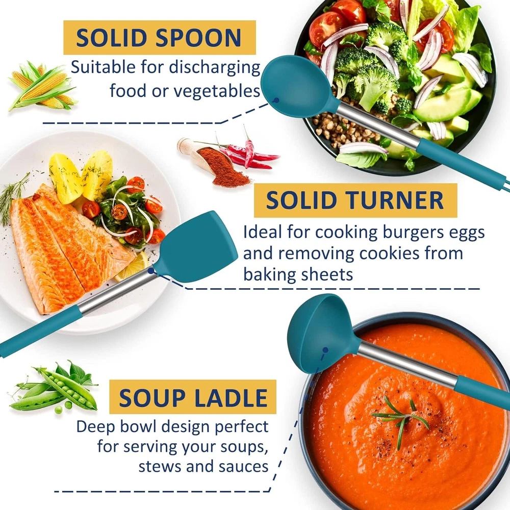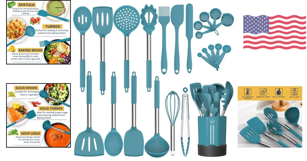 Heat-Resistant Silicone Cooking Utensil Set with Stainless Steel Handle - 24 Pcs ‹ › ‹ › ‹ › ‹ › ‹ › ‹ › ‹ › ‹ › Heat-Resistant Silicone Cooking Utensil Set -24 Pcs with Stainless Steel Handle Features: Includes 5pcs Measuring Spoons and 5pcs Measuring Cups Slotted Spatula, Slotted Spoon, Flexible Spatula, Slotted Turner, Solid Turner, Pasta Server, Solid Spoon, Kitchen Tongs, Draining Spoon, Whisk, Deep Soup Ladle, Spatulas, and Brush Made of food-grade silicone and stainless steel handle Heat-resistant up to 446°F/230°C Easy to clean with stainless steel core Comes with an extra utensil holder for convenient storage Benefits: 24 different utensils for a variety of cooking tasks Firm silicone heads and sturdy stainless steel handle for a fantastic grip No rust, breaking, or bending Silicone head protects cookware surfaces from scratches Great gift for anyone who loves to cook Convenient storage with utensil holder Why choose our Heat-Resistant Silicone Cooking Utensil Set? Upgrade your kitchen with our professional 24-piece silicone utensil set. Made of food-grade silicone and stainless steel, these utensils are heat-resistant, easy to clean, and durable. With a variety of utensils for all your cooking needs, you'll be prepared for any recipe. Plus, the included utensil holder keeps everything organized and within reach. Say goodbye to flimsy kitchen utensils and invest in quality tools that will make cooking easier and more enjoyable. Order your Heat-Resistant Silicone Cooking Utensil Set today! Shipping Free & Fast Shipping - We offer free shipping to most of the USA with a normal delivery time of 3-7 days. However, due to the current situation, additional delivery time (up to 3 weeks) may be required for some items. Alternative Carriers - We may use alternative carriers (e.g. USPS, FedEx, UPS, etc.) to ensure your package arrives safely and on time. Due to the use of multiple carriers, we are unable to provide a tracking number automatically. Handling Time - Orders are processed and shipped within 1-2 business days of receiving cleared payment. Shipping Restrictions - Shipping to Alaska, Hawaii, Puerto Rico, Guam, and other US territories may incur shipping charges or delivery restrictions. Please contact us before ordering, or your order can be refunded/cancelled. State Restrictions - There may be restrictions based on your state of purchase. For example, certain items may not be shipped to California due to state regulations. Contact for Tracking Updates - If you require tracking updates or have any concerns about the delivery of your order, please feel free to contact us, and we will be happy to assist you. Return 30-Day Hassle-Free Returns - We want you to be completely satisfied with your purchase. If you are not, you can return the item within 30 days of receiving it for a full refund or exchange. Easy Return Process - To start a return, simply contact us and we will provide you with a prepaid return shipping label and detailed instructions. Restocking Fee - There are no restocking fees for returns. However, the buyer is responsible for return shipping costs if the return is not due to a seller's error. Refund Processing Time - Refunds will be processed within 5 business days of receiving the returned item in its original condition. Payment We accept all major credit cards, PayPal, and Apple Pay for your convenience. Your payment information is secure and encrypted to ensure a safe and seamless transaction. Please complete your payment within 3 days of purchase to avoid any delays in shipping. Feedback Your feedback is extremely important to us. We strive to provide the best products and customer service possible. If you are satisfied with your purchase, please take a moment to leave us a positive review. If you have any concerns or issues with your order, please contact us before leaving negative feedback. We are committed to resolving any problems and ensuring your satisfaction. Contact Us If you have any questions or concerns, please feel free to reach out to our customer support team. You can contact us through the eBay messaging system. We are available Monday to Friday, 9:00 am to 5:00 pm EST, and we will do our best to respond to your inquiry within 24 hours. Thank you for supporting our small family business!