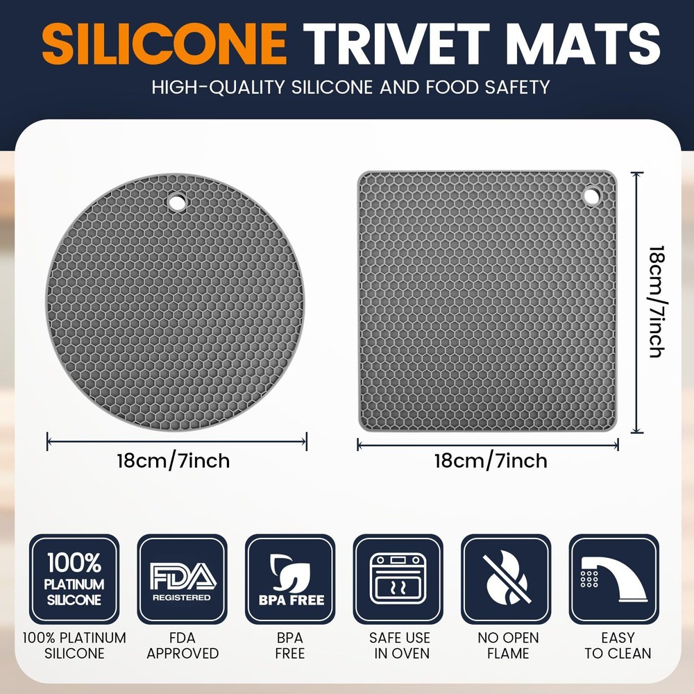 Silicone Trivet Mats 4 Heat Resistant Pot Holders Multipurpose Non-Slip Hot Pads for Kitchen Potholders, Drying mat, Jar Opener, Spoon Holder, Coaster.(Dark Grey) 1、High-quality silicone and food safety: Silicone pot holders for hot pots made of food grade silicone, BPA free, flexible and long-lasting,premium silicone material ensure that they won't rust. 2、Non-slip and high heat resistant: These trivets for hot dishes are heat-resistant from -104℉ to 446℉, Protect your countertop or table from hot pots, hot pans coming out from the microwave or stove. Silicone trivet is non-slip to make nothing slide off. 3、Easy to clean and store: The pot holder is hand and dishwasher washable. Almost everything can easily wash off the non-stick surface and quickly dry. You can stack, roll up or hang on to store,easy and save space.A must-have kitchen essentials you will need. 4、Multi-Purpose Trivets: Our silicone tripod is non-slip and flexible, making it an indispensable cooking accessory in the kitchen.It can be used as silicone mats, potholders, drying mat, jar opener, spoon holder, coaster, microwave Mat…one pad can help you solve many tasks. 5、Protect Your Tabletop: Our placemats are designed to protect your table or countertop from damage caused by hot dishes, pots, or pans. They also help prevent scratches and stains, keeping your surfaces stay looking as good as new. Shipping We offer FREE shipping on all orders! We ship within Three business days of payment, usually sooner. We use a selection of shipping services such as UPS, FedEx, USPS etc. We only ship to the lower 48 states, no APO/FPO addresses or PO Boxes allowed. Local pickups and combined shipping options are not provided at this time. Return You can return a product for up to 30 days from the date you purchased it. Any product you return must be in the same condition you received it and in the original packaging. Please keep the receipt. Payment We accept payment by any of the following methods: PayPal Please pay as soon as possible after winning an auction, as that will allow us to post your item to you sooner! Feedback Customer satisfaction is very important to us. If you have any problem with your order, please contact us and we will do our best to make you satisfied. Contact Us If you have any queries, please contact us via ebay. We usually respond within 24 hours on weekdays. Please visit our eBay store to check out other items for sale! Thank you for shopping at our store.