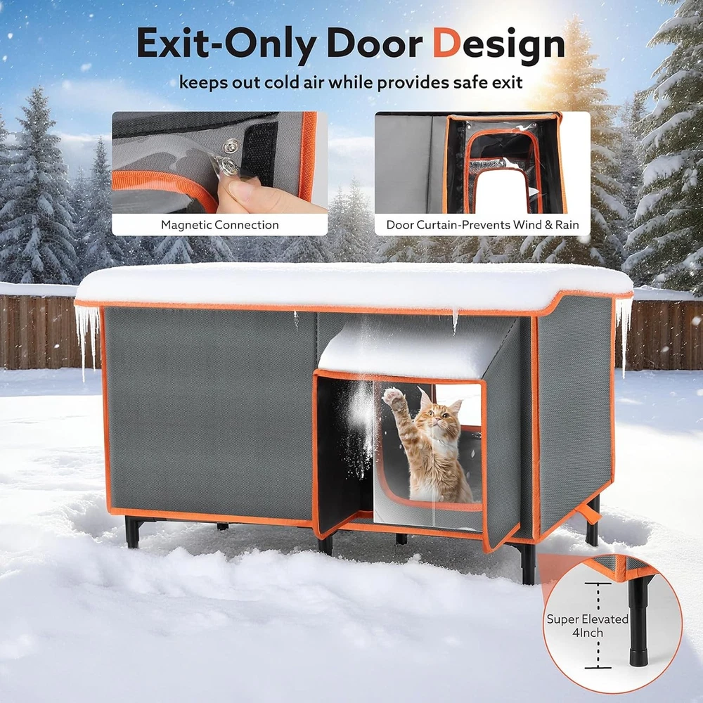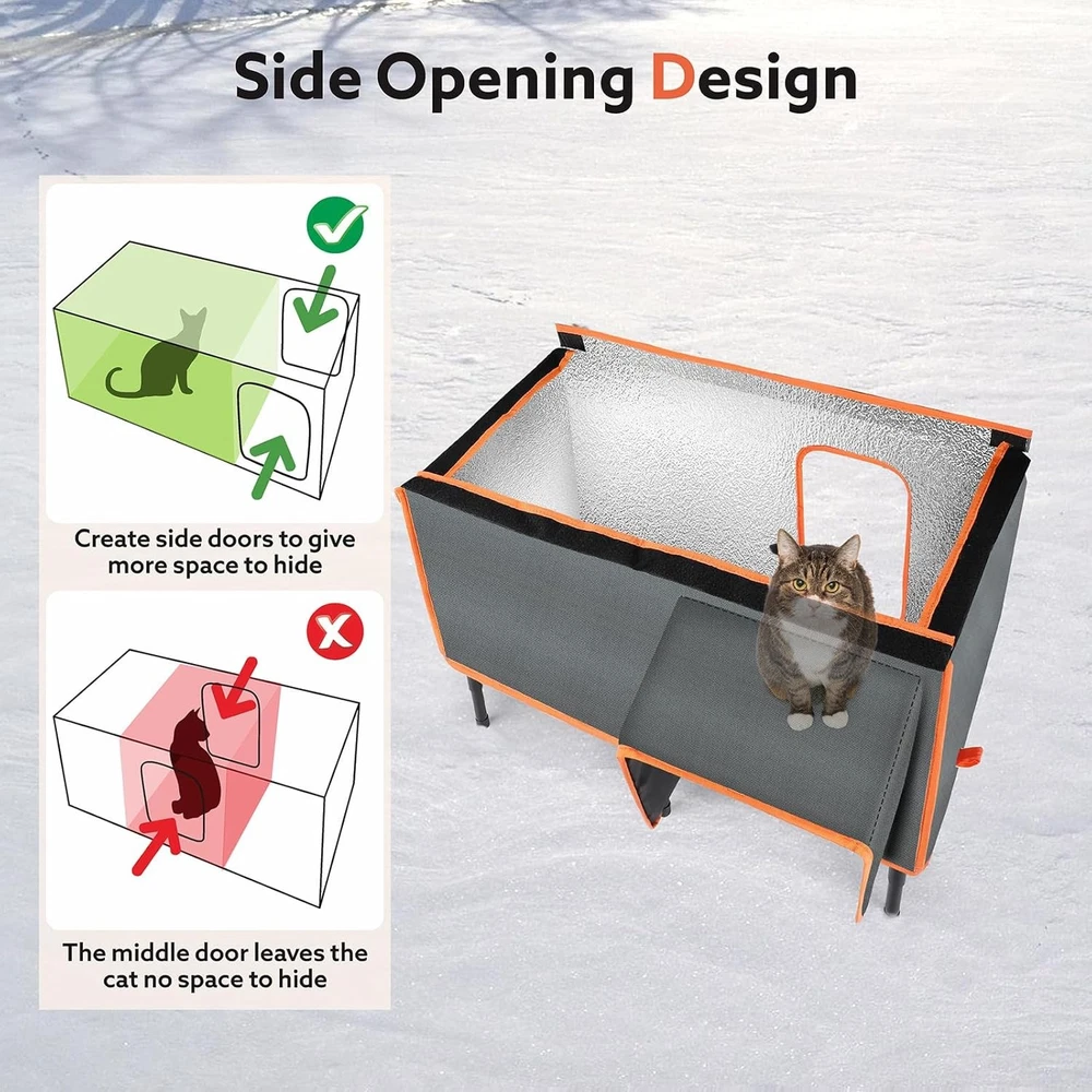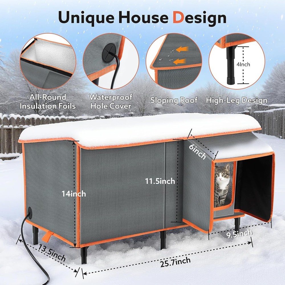 About this item Safe Heating Pad:The heated cat house with a heating pad which protect cats from chewing wires with dual resistant cord protection to ensure safety. Ultra-soft, machine-washable cover for comfort and convenience. It effectively keeps your pets toasty warm in cold days. Unique design: The roof is inclined to avoid water backlog and collapse on the roof. The elevated base is attached to prevent the cat house from changing. The front and rear exits escape from the back door when the cat is in danger. Fully Weatherproof & Insulation-The heated cat house for outside, made of 5 layers of waterproof and insulating materials, can protect cats from any extreme outdoor conditions. Super Large Sizes: Our outdoor feral cat house is large, measuring 25.7" Lx13.5" Wx18" H, accommodate multiple kittens, puppies, making it an ideal outdoor house for pets weighing about 25 pounds. Easy to Install:you only need to follow the simple steps in the manual to install it. And the cat roof can be opened for daily cleaning. Brand: Product Dimensions: 25.7"D x 13.5"W x 18"H Material: Aluminum, Polypropylene (PP), Polyvinyl Chloride (PVC) Color: Grey Style: Modern