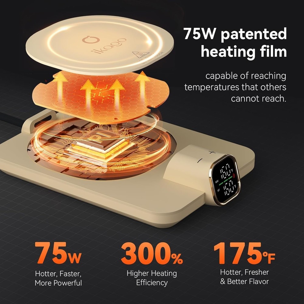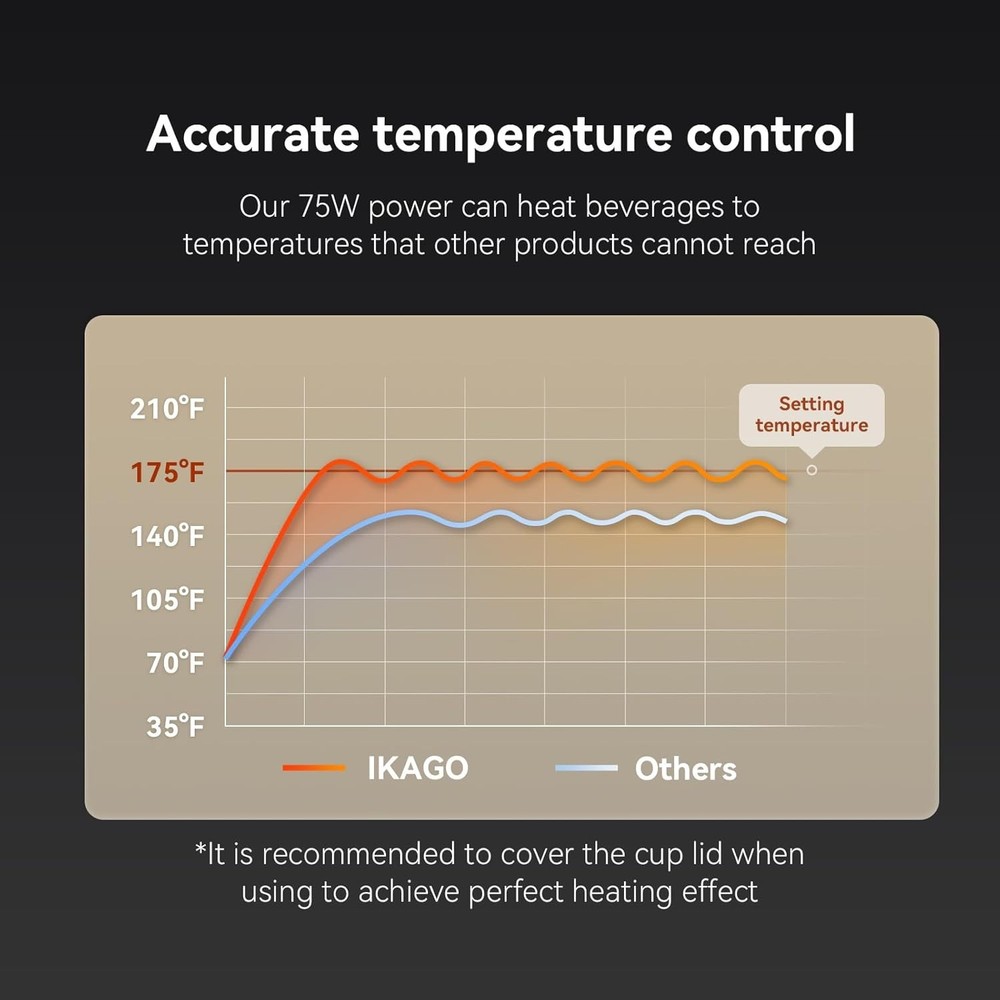 Perfect Gift Set for Any Occasion: Celebrate Birthdays, Father’s Day, Mother’s Day, Valentine’s Day, Teacher's Day, Christmas, Graduation, and more with the Ikago Smart Coffee Warmer Set. It’s a practical and stylish gift for anyone who enjoys a warm cup throughout the day — at home or at work Real-Time Temperature Control: Our smart heated coffee mug warmer uses dual infrared sensors and digital display to show & control real-time drink temperature. Keep your coffee, tea, or cocoa at the perfect warmth, anytime 1°F Adjustable Customizable Heat: Choose your ideal temperature from 105°F to 175°F, adjustable in 1°F increments. Perfect for crafting the best cup of coffee, tea, milk, or hot chocolate at home/at the office. Support change into ℃ Fast Heating & Energy Efficient: Powered at 75W, Ikago warmer heats 50% faster and reaches 175°F quickly. Smart power control maintains ideal warmth without overheating — saving energy while keeping every sip just right Smart Auto On/Off Safety: Thanks to dual infrared sensors, the warmer automatically shuts off when no cup is detected for 15 minutes, or after 2 hours of inactivity — ensuring safe, worry-free use at home or the office Universal Compatibility: Designed for most ceramic mugs, it's perfect for coffee, tea, milk, or cocoa. (Note: Not recommended for glass, metal, paper, or insulated cups.) This warmer set thoughtfully packaged with a 15oz ceramic mug, matching lid, stirring spoon, and smart warmer