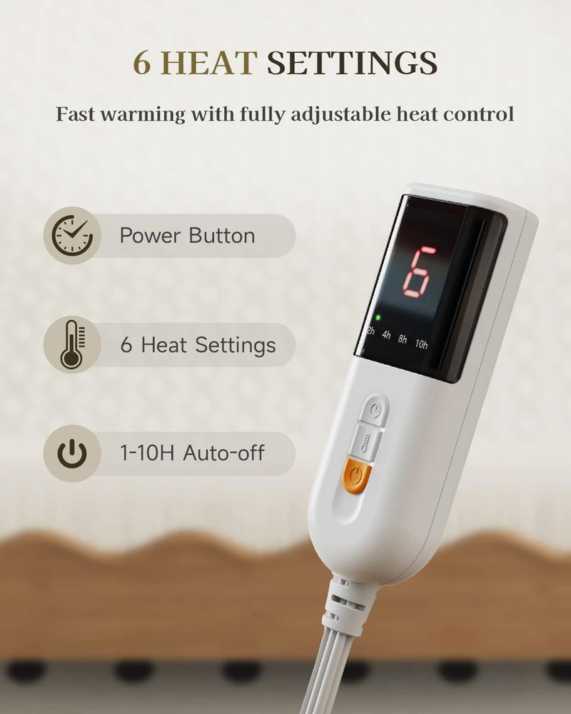 Extremely Comfortable: This heated Mattress pad has luxury qulited air fabric with high quality heating filament that runs throughout the heated mattress pad to provide you with the maximum warmth and comfort. electric mattress pad is perfect for keeping you cosy in bed and on both freezing cold winter nights. 6 Heating Levels & Automatic Shutdown: 6 heat settings 2-10-Hours automatic shut-off function programable digital controllers for you easy push button design to set temperature.Queen size heated mattress pad with Dual controllers allow for custom heat for better comfort. you can choose the temperature that suits you best. Perfect for when you fall asleep or if you forget to unplug your heated mattress pad,The even and continuous heat allows you to sleep all night peacefully. Overheat Protection: This electric mattress pad comes with great reliable system including overheat protection system and automatic safety shut off system, which can constantly monitors the temperature of the electric mattress pad, If the heated mattress pad reaches a certain dangerous temperature, the system will automatically turn off the mattress cover, the quality of the electric mattress pad are certified by ETL&FCC Certification. Fitted Sheet Style Design: Our heated mattress pad are designed for all types of mattresses.With a stretchy skirt and elastic band,our electric mattress pad can perfect fit your mattress without being too loose or too tight.Our heated mattress pad Queen size heated mattress pad provides you a smooth and neat surface,no crinkle feeling or sound when sleeping,.Don't worry about “slip off”.This Queen size heated mattress pad measures 60’’x80'' and has deep pocket fits up to 15". Easy to Maintain: Our Queen size electric mattress pad is machine washable and dryer for your convenience.this Queen size heated mattress pad can be machine washed in cold water , tumble dry at low heat.DO NOT iron,bleach or dry clean. Remove the controller and cool it down before cleaning. Important: Read user manual for complete care instructions.