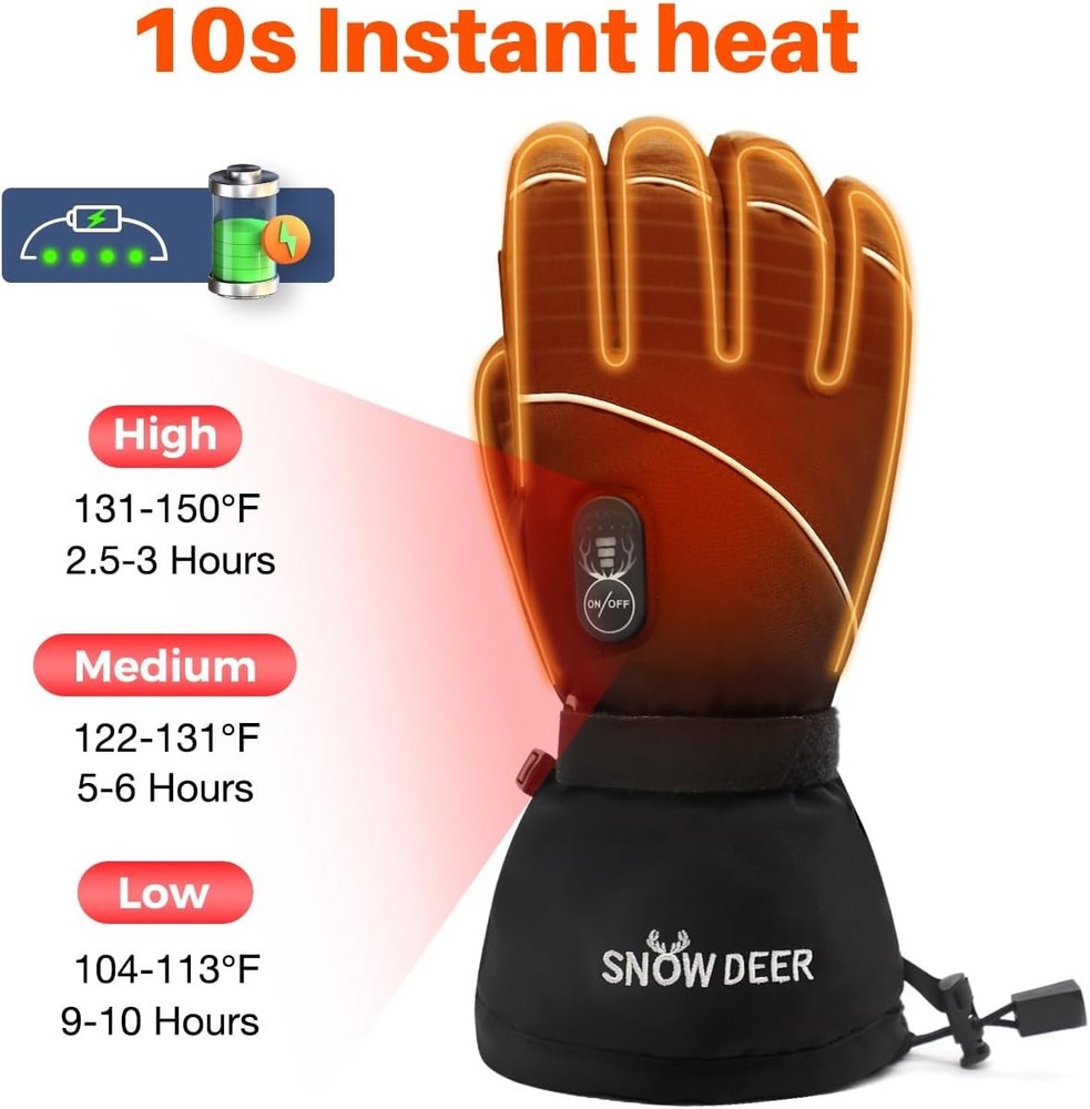 【3 Temperature Settings& Thumb Double Heating】The electric heating gloves with 3 heat setting controllers, there are 3 heating level. You can adjust the temperature whatever you like. Heating Elements Covers Back of hand and whole fingers till finger tips. The thumb use double heating, no more cold. The electric heating gloves Included a pair of 7.4V 2200mah rechargeable lithium polymer batteries. It can be heating up to 5-6 hours after fully charged by 3-4 hours 【Sensitive Touch Screen Function】This new Electric Glove mitten with new design for the touch screen function, as you can see there is an U shape design on the thumb which makes you can touch your Phone/I pads without taking off the gloves in the cold weather. The touch screen material is very sensitive and comfortable, so no worry for the quality. 【Comfortable Material】The rechargeable heated mittens are made of insulated Cotton,breathable comfort Fleece inside.The special quality material can storage thermal efficiently and provides nearly twice warmth of other materials, it can keeps your hands more cosy warm from cold weather outside.It is stimulate your hand blood circulation when you put on gloves, and it is also great for people who suffers from Raynaud’s, Arthritis, Bad Circulation, Stiff Joints. 【Excellent performance】Those electric skiing gloves are good for Skiing,Motorcycling,Hiking,Cycling, Hunting, Fishing, Walking your dogs, Climbing, Shoveling snow, Outdoor work,heating and durable.Give you warmth and comfort for a long time. 【The Ultimate Cold Weather Solution】 The Far Infrared Fiber heating elements provide superior heat dispersion, ensuring your hands stay warmer for longer. Say goodbye to the discomfort of cold hands. Our Battery Heated Gloves are here to elevate your cold weather experience, providing warmth, comfort, and improved circulation. Rediscover the joy of cold-weather activities with gloves that are engineered to perfection.