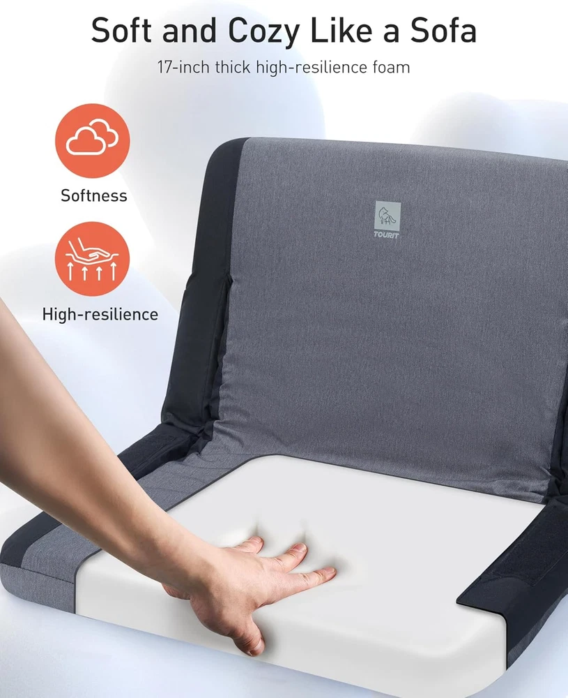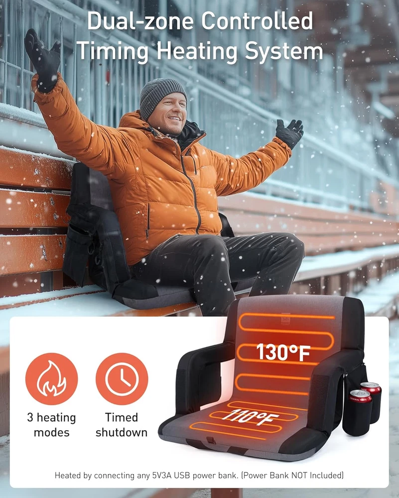 Dual Heating & Adjustable Temp: Our heated stadium seats come with an impressive dual heating system that warms both the seat and backrest(one battery is required each). With three adjustable heat settings reaching up to a cozy 140°F, you’ll stay toasty while enjoying a concert. The user-friendly remote lets you switch between settings with ease, so you can focus on the action, not the chill. Please note that you'll need two 5V battery to power the heated bleacher seats (not included) Unmatched Comfort Experience:Designed for those who love to bask in the excitement of outdoor sports, these seats feature six adjustable reclining positions from 90° to 180°. Whether you're sitting upright to catch every thrilling moment or reclining back to relax during a camping trip, you can customize your seating to fit your mood. The plush cushioning provides luxurious support for long hours at the stadium, making these heated stadium seats your new best friends for any outdoor adventure Built to Last in All Conditions:Our heated bleacher seat is made from waterproof Oxford fabric that can brave unexpected splashes or light rain. You can enjoy your favorite outdoor sport without worrying about the weather ruining your fun! The strong leather base adds grip and stability, ensuring you remain secure, even when jumping up in joy as your team scores the winning goal. Plus, our chair’s robust framework supports various body types, promising reliable comfort for everyone Easy Setup & Secure Guaranteed:No more sliding around when you leap up to cheer! Our stadium chair comes with convenient bottom straps designed to keep your seat firmly anchored to the bleachers. This ensures safety and stability while reducing movement, allowing you to focus entirely on the excitement of the game or concert. Enjoy peace of mind knowing that your heated bleacher chair isn’t going anywhere, even during the most thrilling moments Portable & Multi-Pocket Convenience:Our heated stadium seats for bleachers are equipped with multiple pockets designed for ultimate convenience. Store your water bottle, snacks, or personal items in the handy side pockets and zippered back compartment—perfect for those chilly evenings! With two shoulder straps, carrying your heated bleacher chair is as easy as slinging on a backpack Multi-scene application:The TOURIT Heated Stadium Seat is the perfect choice for watching a variety of sporting events like football, baseball, basketball, the Olympics, and the World Cup, as well as outdoor activities like camping and fishing. It’s especially great for parents watching their kids practice or waiting on the sidelines during games. Say goodbye to cold, hard bleachers Product Description