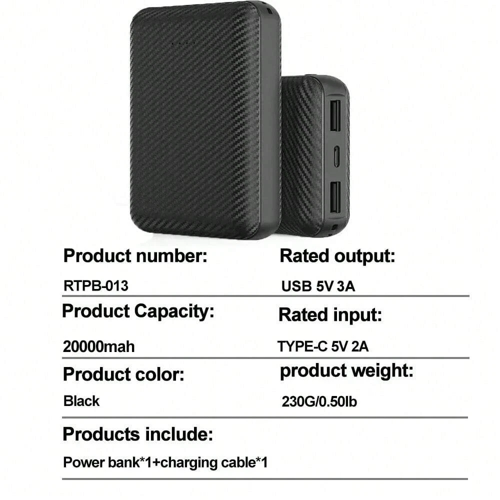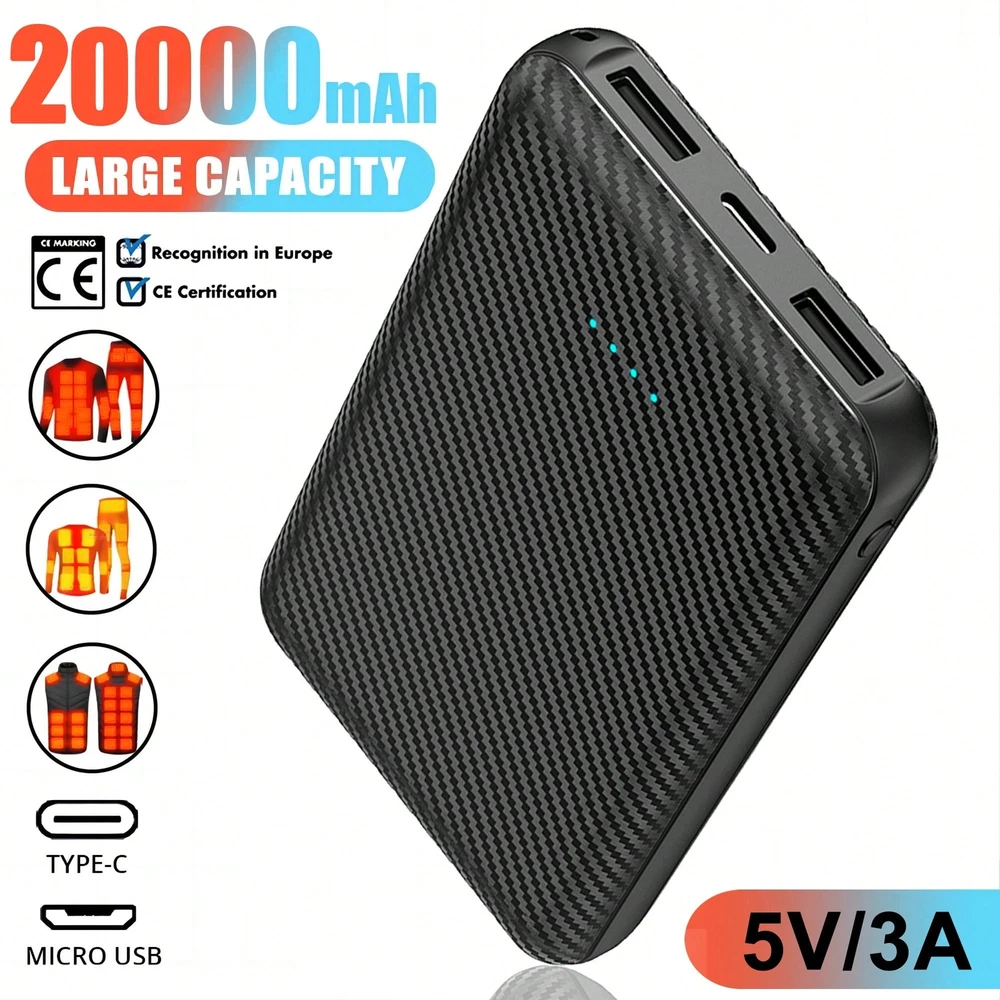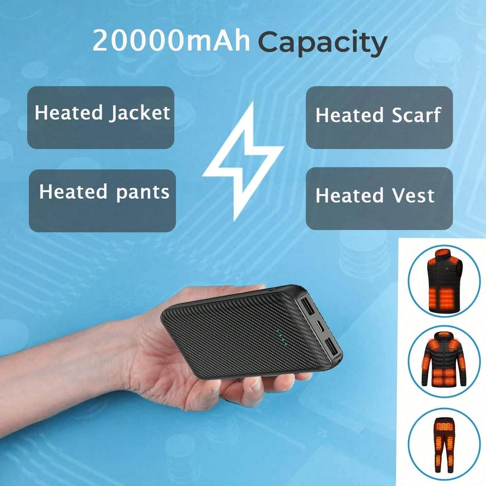 20000mAh Power Bank Portable Charger External Battery Pack for Heating Vest Jacket Scarf Socks Gloves Electric Heating Equipment Description: *1. Material: ABS *2. Type-c input: 5V 2A *3. USB output: 5V 3A *4. Battery: Li-polymer battery Features: *1. Compatible with heating vest, scarf, socks and gloves Phone. *2. 20000mAh large capacity, 5V 2A power output, providing lasting battery life. Package Includes: 1x Power Bank
