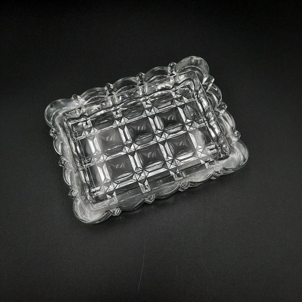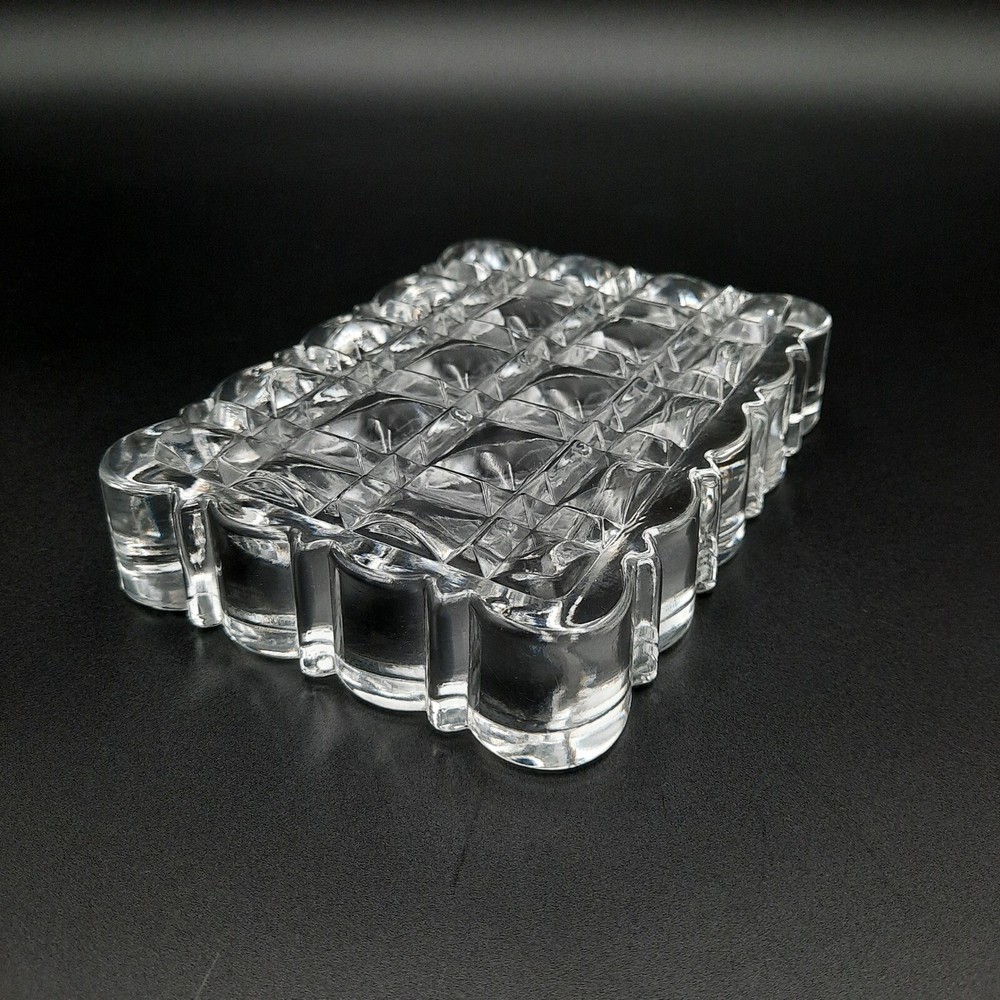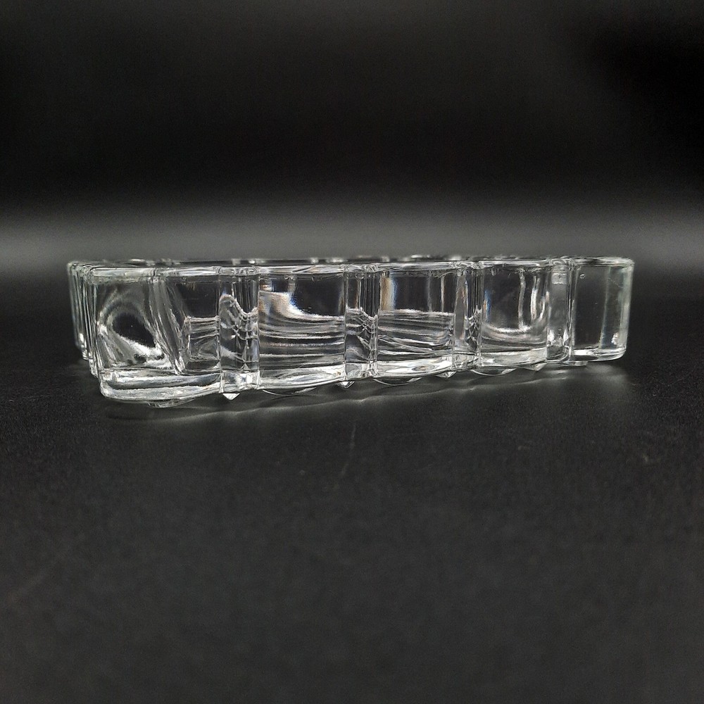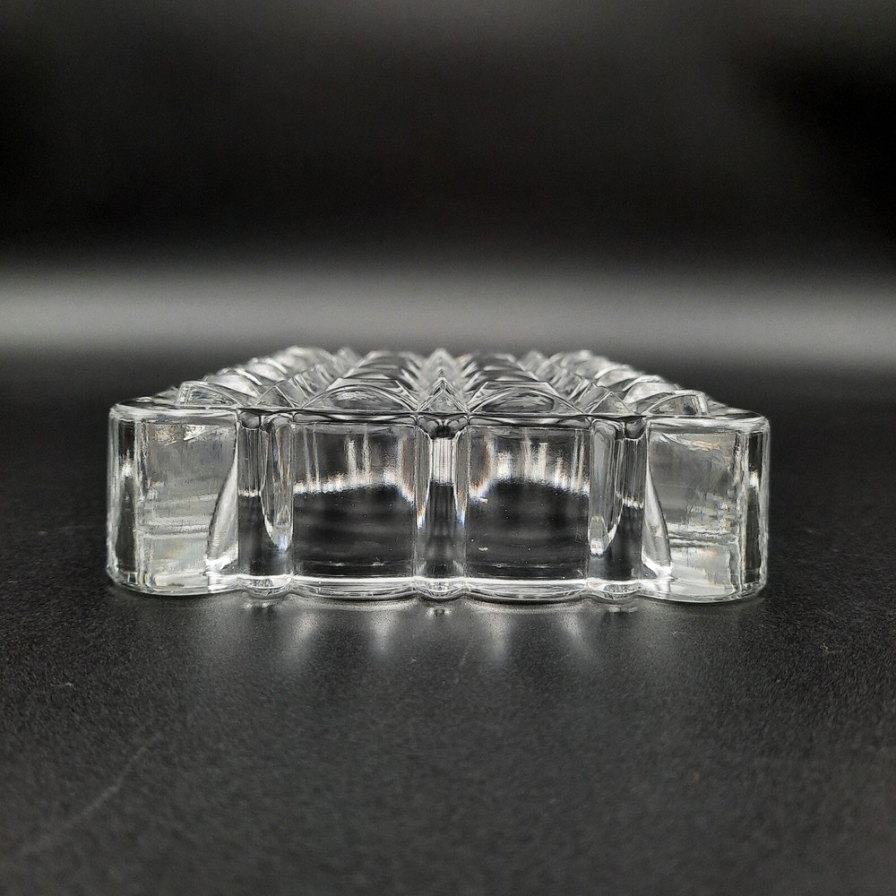 A clear glass dish, perfect for serving candy, nuts, or as a decorative trinket tray. This piece features a heavy, substantial feel and a brilliant cut glass design with a diamond pattern on the base. The edges are uniquely shaped with a scalloped, multi-faceted design, adding to its visual appeal and elegance. Its clear glass construction allows it to complement any decor style, making it a versatile addition to any home. Type: Serving Tray Material: Glass Color: Clear Features: Tray, Chip Resistant Shape: Rectangle Pattern: Diamond Finish: Glossy Keywords: crystal dish, glass candy dish, nut dish, trinket tray, cut glass, clear glass dish, diamond pattern, decorative dish, vintage glassware, home decor, table decor, serving dish, glass tray, glass bowl