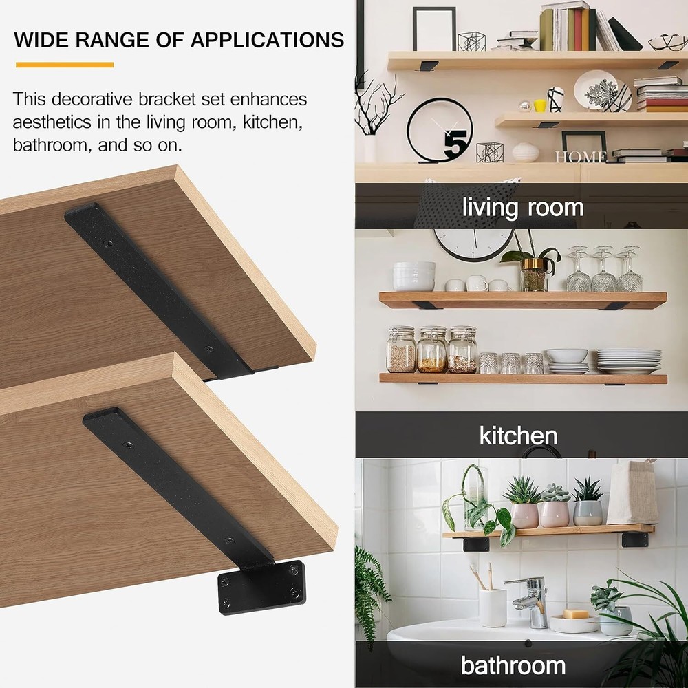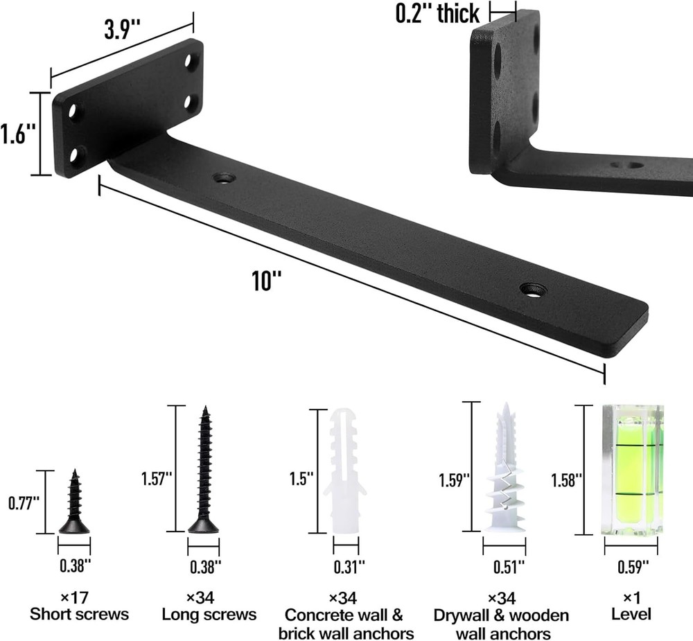 Store New Arrivals Add to Favorite View Feedback Contact Heavy Duty Floating Shelf Brackets, 10-Inch (1/5'' Thick) Hidden Shelves Hardware, Cast Iron L Brackets, Rustic Industrial Black Metal Wall Shelving Supports, 8 Pack Description Item model number ZJ-01 Part Number ZJ-01 Style 8 Pack Finish Matte Mounting Type Wall Mount Color Black Product Dimensions 10 x 6 x 2 inches Material Cast Iron Country of Origin China Item dimensions L x W x H 10 x 6 x 2 inches Item Weight 9.17 pounds Batteries Included? No Batteries Required? No Size 10 Inch Finish Type Matte Included Components not_applicable 【Heavy-Duty & 90° Angle】Each pair of the 1/5-inch thick brackets, crafted from high-quality steel, can support up to 150 lbs when used with the included high-strength screws. The precise bend ensures a perfect 90° angle, preventing any tilt. 【Hidden & Countersunk Design】With a height of just 1.6 inches, the bracket can be easily hidden between the wall and shelf. It's designed for both upward & downward use, while the countersunk feature guarantees smooth drilling and invisible screws. 【Matte Finish】The matte black finish on these cast iron shelf brackets mixes modern sleekness with industrial aesthetic. Serving as blind shelf supports, these mounting brackets offer a textured surface for rust resistance and lasting performance. 【DIY Storage Rack】This set includes 8 decorative L brackets for wood, perfect as holders for DIY wall-mounted open shelves. Versatile in application, they're suitable for kitchens, bathrooms, bedrooms, offices, garages, studies, and powder rooms. Step-by-Step Installation Guide 1.Mark Points: Identify where the holes will go and mark them accurately. 2.Insert Anchors: Use a screwdriver to secure the anchors in the drywall easily. 3.Attach Brackets: Use the long screws included to fasten the shelf brackets to the wall. 4.Repeat for Other Brackets: Follow the same steps to install any additional brackets. 5.Secure Planks: Finally, use the short screws to attach your shelf to the installed brackets. ABOUT US We offer the best prices around on high quality products. Our E-store includes media such as books, movies, music and games while offering electronics, toys, sporting apparel, clothing, tools, general home, garden items and more. SHIPPING We are always working hard to ensure your package arrives as soon as possible. Please understand that some factors like weather, high postal traffic, and the performance of shipping companies are outside of our control. We offer free shipping to the lower 48 states and ship within 2 business days of payment, usually sooner. We do not accept P.O. Boxes. Please provide a physical address. RETURNS We offer a 30-Day Return Policy on items which you are not completely satisfied with. You have the option for a full-refund or an exchange of the item. No returns are available on items shipped outside of the USA. PAYMENT We accept PayPal. CONTACT US This page content is yet to come Please ad us to your favorite seller and visit again later Thank You CUSTOMER SATISFACTION We try our very best to make sure every customer is completely satisfied. If there's a problem, message us! We're happy to help.