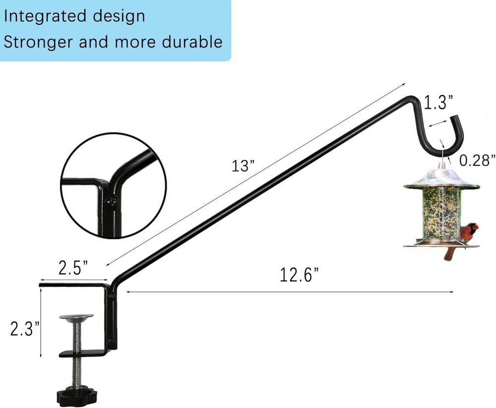 STURDY AND HEAVY DUTY-Integrated desig make the deck hook more stronger and reliable.The reliable weather-proof powder-coated metal maintains its subtle black color and quality. Adjustable non-slip accommodates railings up to 2 inches thick. Suggested max hanging weight: 20 lbs. 4 PACK 13 INCH DECK RAILS HOOKS-Our Deck Hook set includes 4 Clamp-On Deck Rail Hooks, It is really competitive pricing and quality product. WIDELY USE-You can use it for handling bird feeders,hummingbird feeder ,wind chimes,heavy hanging plant/flower baskets,halloween decoration, thanksgiving decoration, christmas decoration etc.It is very sturdy throughout the seasons. EASY TO INSTALL- Clamp-on Deck Hook quickly and easily adjusts to hold securely to your deck railing. Absolutely no tools are needed, adjustable hand knob can be tightened and loosened quickly for easy installation and removal. SAFE AND WORRY-FREE SHOPPING EXPERIENCE because we stand behind our products! If you are not satisfied with any reason, just and we will make it right. Product Description Multifunction For hanging flower pots. For hanging suet baskets. For hanging wind chimes. For hanging decorative lighting For hanging lanterns and solar lights. For hanging bird feeders or bird bathplants.