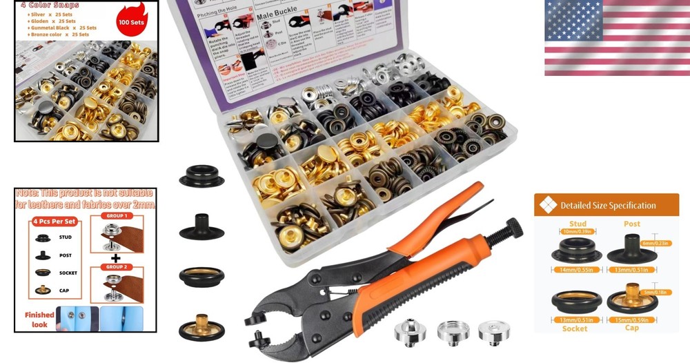 Heavy Duty Snap Buttons Kit Brass 15mm for Clothing Leather Canvas Craft ‹ › ‹ › ‹ › ‹ › ‹ › ‹ › ‹ › ‹ › Heavy Duty Snap Buttons Kit Perfect for Clothing, Leather, Canvas, and Craft Projects Package Includes: 4 vibrant colors, with 25 sets for each color, totaling 100 sets. One heavy-duty snap fastener tool with 3 interchangeable dies. Comprehensive instruction manual for easy operation. 100 caps, 100 sockets, 100 studs, and 100 posts, all neatly organized in a clear plastic storage box for convenience. High-Quality Material: Constructed from #62 brass, renowned for its durability and superior rust prevention. Offers excellent oxidation resistance while maintaining button hardness, ensuring longevity and performance. Designed for both indoor and outdoor applications, these snaps are ideal for a variety of environments. Product Specification: Each button set includes four parts: cap, socket, stud, and post. The cap diameter measures approximately 15mm/0.59 inch, making it a versatile choice for multiple projects. Wide Application: Perfect for DIY crafts, shoes, hats, clothing, canvas, tarpaulin, tents, awnings, and leather goods. Harmoniously suited for both casual and professional crafting needs, catering to a range of styles. Easy to Operate: The newly upgraded tool simplifies the installation process with adjustable pliers for enhanced leverage. Complete punching holes and installing snap buttons effortlessly—say goodbye to traditional hand knock installations! Note: The stud depth is only 5mm/0.2 inch, making it unsuitable for materials thicker than 2mm. Additional Instructions: Please watch the instructional video and FAQ video provided for tips on perfect usage. Practice makes perfect! For any issues encountered, our dedicated support team is ready to assist you within 24 hours. Elevate your crafting experience with our Heavy Duty Snap Buttons Kit—order now and create flawlessly! Shipping Free & Fast Shipping - We offer free shipping to most of the USA with a normal delivery time of 3-7 days. However, due to the current situation, additional delivery time (up to 3 weeks) may be required for some items. Alternative Carriers - We may use alternative carriers (e.g. USPS, FedEx, UPS, etc.) to ensure your package arrives safely and on time. Due to the use of multiple carriers, we are unable to provide a tracking number automatically. Handling Time - Orders are processed and shipped within 1-2 business days of receiving cleared payment. Shipping Restrictions - Shipping to Alaska, Hawaii, Puerto Rico, Guam, and other US territories may incur shipping charges or delivery restrictions. Please contact us before ordering, or your order can be refunded/cancelled. State Restrictions - There may be restrictions based on your state of purchase. For example, certain items may not be shipped to California due to state regulations. Contact for Tracking Updates - If you require tracking updates or have any concerns about the delivery of your order, please feel free to contact us, and we will be happy to assist you. Return 30-Day Hassle-Free Returns - We want you to be completely satisfied with your purchase. If you are not, you can return the item within 30 days of receiving it for a full refund or exchange. Easy Return Process - To start a return, simply contact us and we will provide you with a prepaid return shipping label and detailed instructions. Restocking Fee - There are no restocking fees for returns. However, the buyer is responsible for return shipping costs if the return is not due to a seller's error. Refund Processing Time - Refunds will be processed within 5 business days of receiving the returned item in its condition. Payment We accept all major credit cards, PayPal, and Apple Pay for your convenience. Your payment information is secure and encrypted to ensure a safe and seamless transaction. Please complete your payment within 3 days of purchase to avoid any delays in shipping. Feedback Your feedback is extremely important to us. We strive to provide the best products and customer service possible. If you are satisfied with your purchase, please take a moment to leave us a positive review. If you have any concerns or issues with your order, please contact us before leaving negative feedback. We are committed to resolving any problems and ensuring your satisfaction. Contact Us If you have any questions or concerns, please feel free to out to our customer support team. You can contact us through the eBay messaging system. We are available Monday to Friday, 9:00 am to 5:00 pm EST, and we will do our best to respond to your inquiry within 24 hours. Buy it now and enjoy a pleasant shopping experience! Unit Quantity: 100 Sets Suitable For: Blazers & Suits,Costumes,Crafts,Drapery,Jackets & Coats,Shirts & Blouses,Upholstery,Clothing,Leather,DIY,Canvas,Tarpaulin,Tents,Awnings,Shoes,Hats Color: Multi-Color Material: Brass Type: Snap Buttons Shape: Round Unit of Sale: Pack