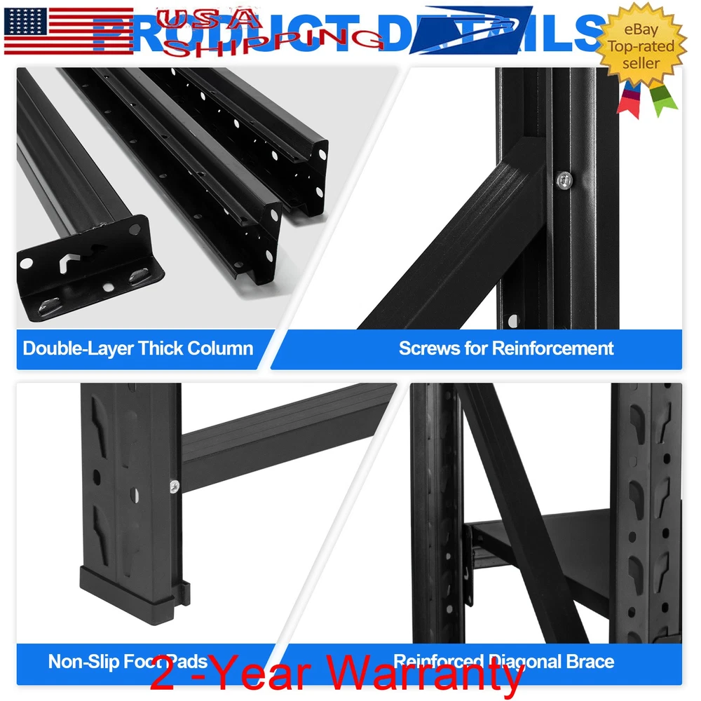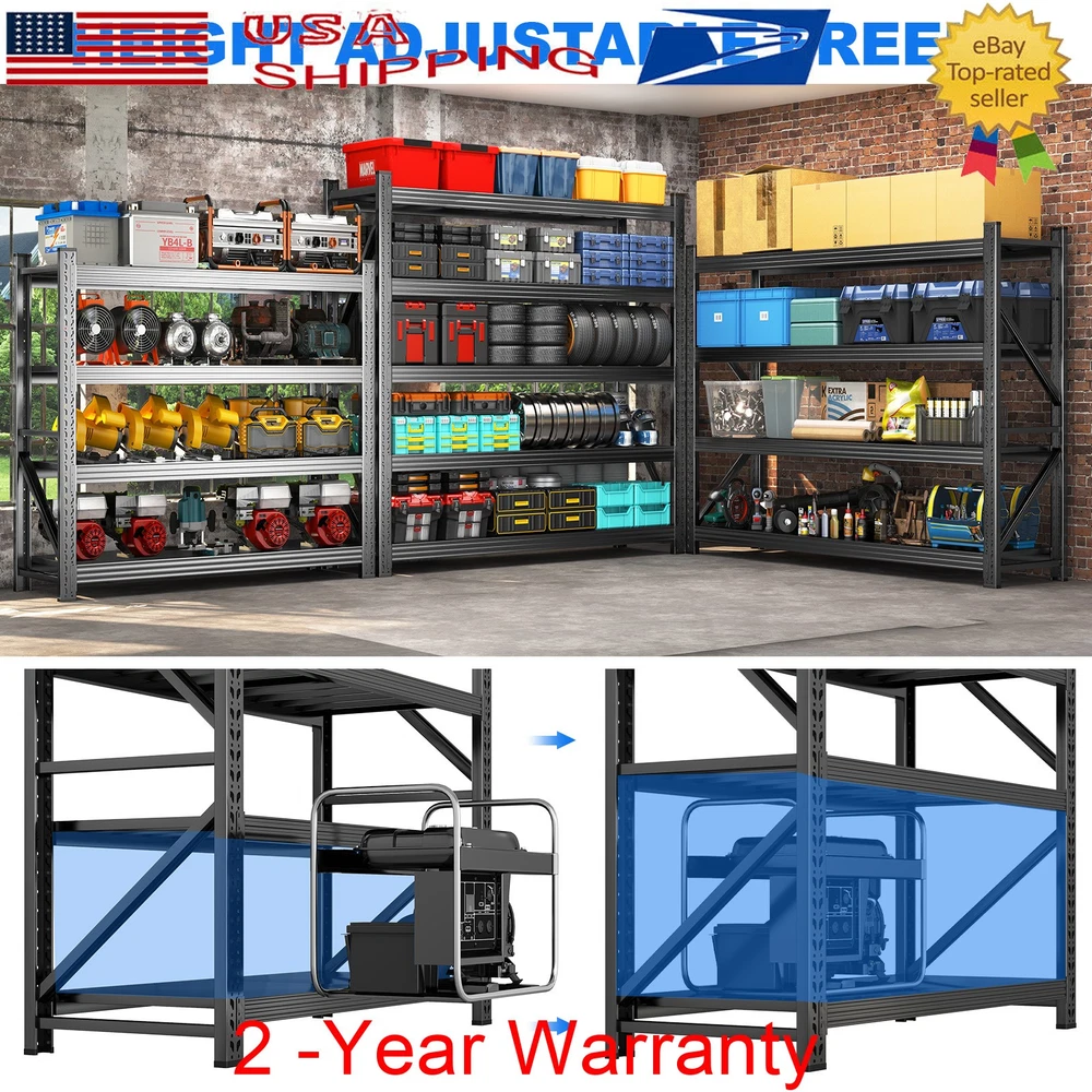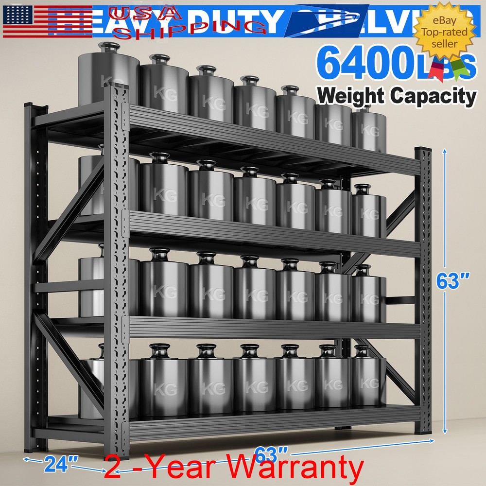 Heavy Duty 4 Tier Adjustable Metal Shelves Storage Garage Rack 63" For Warehouse Product Description Say goodbye to wobbling shelves and weak joints. Our Garage Shelving features four one-piece steel columns, thick steel shelves reinforced with ribs, and extra-wide beams for superior durability and strength. It’s perfect for storing tires, generators, tools, and more. Adjustable shelf heights let you create the setup you need, while the quick, 10-minute installation makes organization effortless. About this item 【Heavy Duty Garage Shelving Load 6000LBS 】 Designed to handle even the toughest storage challenges. With a total weight capacity of 6000 lbs and 1500 lbs per shelf, this shelving unit is built to withstand heavy-duty use. Featuring one-piece columns, dual Reinforcing Diagonal Supports, reinforced Steel shelves with three support ribs, and extra-wide beams, it offers unparalleled strength and durability. 【One-Piece Columns with Diagonal Supports 】 No seams, no weak spots. Our four one-piece columns, reinforced with diagonal supports, are the key to a sturdier, more reliable garage shelves. The seamless design, combined with the diagonal braces, eliminates wobbling and sagging, offering enhanced stability and durability for heavy-duty storage., unlike split column garage shelf that can suffer from weak joints and instability. 【Thick Steel Shelving with Reinforcement Rib】 Our shelf’s thick steel shelves, reinforced with ribs and supported by extra-wide beams, provide unmatched durability for all your storage needs. The reinforced ribs help spread the weight evenly across each shelf, while the extra-wide beams ensure maximum load-bearing capacity, preventing any bending or sagging over time. 【Adjustable Metal Shelf】 Our heavy duty shelving features adjustable shelves, allowing you to create the perfect storage system for your unique needs. Adjust the height of each shelf to fit everything from large appliances to smaller tools, and enjoy a customizable storage experience. Whether it’s for home or commercial use, this shelving unit is versatile and practical. 【Garage Shevleing with Monster Storage Space】 This extra-wide garage shelving is perfect for garages, warehouses, basements, and shops. It’s not just for home use – this shelving unit is also ideal for industrial and commercial applications. Perfect for storing heavy-duty items like tires, generators, and motor oil crates, it's built for mechanics, warehouse professionals, and anyone who needs reliable, heavy-duty storage. 【10-Minute Solo Assembly】 We’ve simplified assembly with a comprehensive installation guide and clearly labeled parts for each step. And if you run into any issues, our professional customer service is always ready to offer guidance and support, ensuring a flawless experience. Product Sizes 1PCS --- 4 Tier - 63" W x 24" D x 63" H