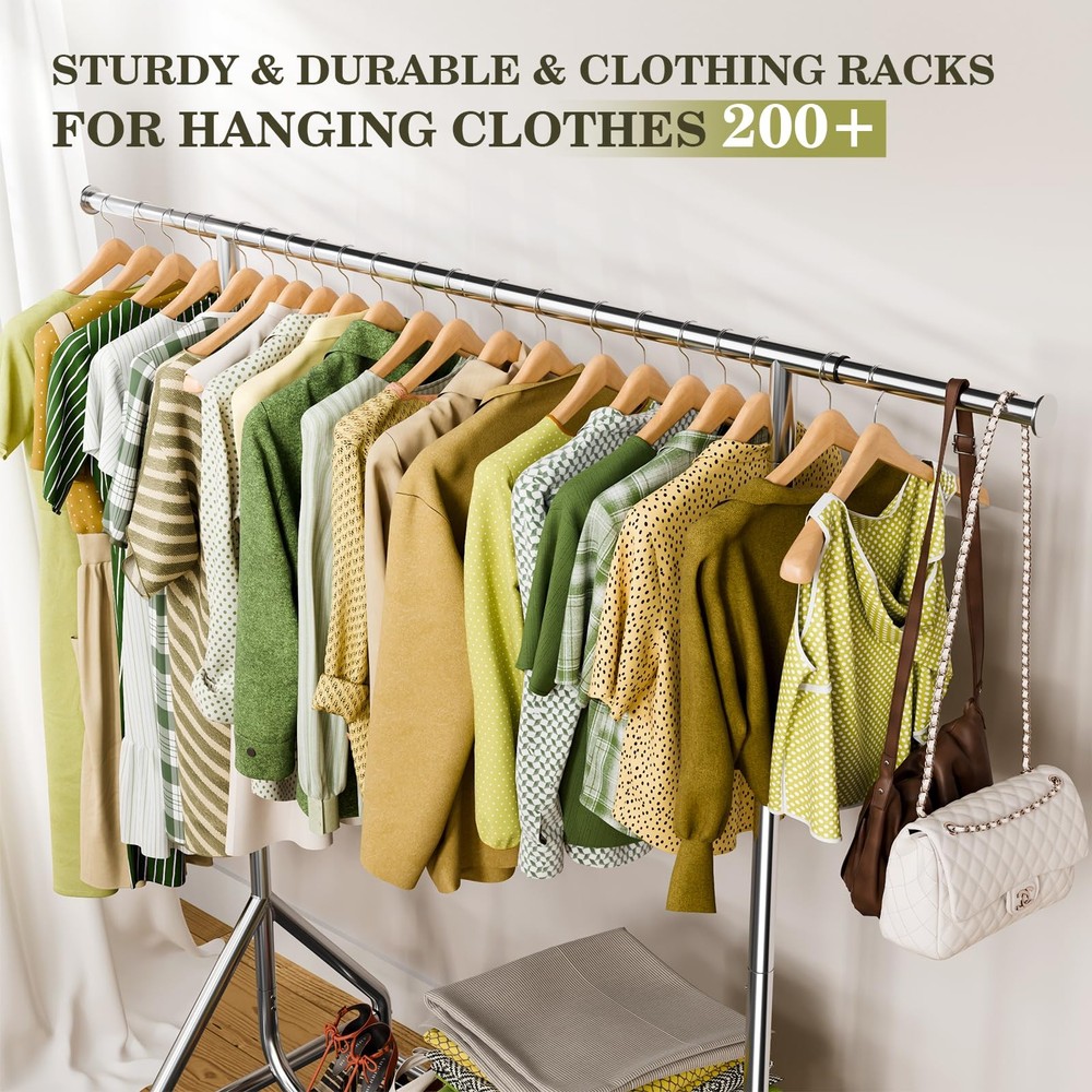 Elevate your storage and display solutions with our Heavy-Duty Garment Rack on Wheels—a robust, mobile organizational powerhouse designed for both commercial and residential use. Built with industrial-grade steel and reinforced crossbars, this rack effortlessly supports up to 500 lbs, making it ideal for hanging bulky winter coats, designer garments, retail inventory. The 4 smooth-swivel casters ensure seamless mobility across any floor type, allowing you to rearrange spaces in seconds—perfect for busy boutiques, event setups, warehouses, or cluttered home closets. Heavy-Duty & Sturdy: Made from premium-grade steel, this clothing rack supports up to 450 lbs. Ultra-Stable Triangle Design, Engineered with a 1-inch metal rod and triangular bracing, securely holding your heaviest garments without bending or wobbling, ensuring your clothes stay organized and the rack remains sturdy even under heavy loads. Versatile Retractable Clothing Rack: The horizontal rod of the Holiwei adjustable clothes rack can be extended from 45 inches to 67 inches, providing enough space for your clothes, and sturdy mesh shelves provide you with larger storage space, ensuring a perfect fit for any space. Lockable Wheels Enhanced Mobility: The Holiwei rolling clothing rack features premium lockable wheels for enhanced mobility, constructed from durable materials for silent, smooth rolling. Two of the wheels have convenient foot-operated locks, letting you easily secure your rack in place with just a step, then release it instantly when you need to move it. The sturdy wheel design ensures long-lasting performance while protecting your floors. Quick & Tool-free Assembly: Our metal clothing rack features innovative snap-together design that eliminates frustrating bolts, screws or nuts. With clear step-by-step instructions, you'll have it fully set up in under 5 minutes with no tools required. Multi-Purpose Versatility: From home closets to industrial workshops, this all-in-one organizer excels in any setting! Use it as a rolling clothing rack, trade show display, garage tool station, or event decor hub. Compact yet rugged, it seamlessly adapts to residential, commercial, or industrial needs!
