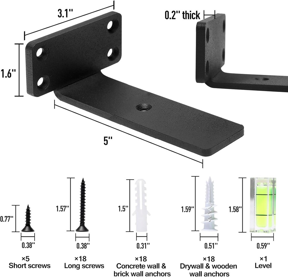 Store New Arrivals Add to Favorite View Feedback Contact Heavy Duty Floating Shelf Brackets, 5-Inch (1/5'' Thick) Hidden Shelves Hardware, Cast Iron L Brackets, Rustic Industrial Black Metal Wall Shelving Supports, 4 Pack Description Item model number ZJ-04 Part Number ZJ-04 Style 4 Pack Finish Matte Mounting Type Wall Mount Color Black Item Depth 0.2 inches Product Dimensions 5 x 3 x 2 inches Material Steel Country of Origin China Item dimensions L x W x H 5 x 3 x 2 inches Item Weight 2.9 pounds Batteries Included? No Batteries Required? No Size 5 Inch Finish Type Matte Included Components not_applicable 【Heavy-Duty & 90° Angle】Each pair of the 1/5-inch thick brackets, crafted from high-quality steel, can support up to 150 lbs when used with the included high-strength screws. The precise bend ensures a perfect 90° angle, preventing any tilt. 【Hidden & Countersunk Design】With a height of just 1.6 inches, the bracket can be easily hidden between the wall and shelf. It's designed for both upward & downward use, while the countersunk feature guarantees smooth drilling and invisible screws. 【Matte Finish】The matte black finish on these cast iron shelf brackets mixes modern sleekness with industrial aesthetic. Serving as blind shelf supports, these mounting brackets offer a textured surface for rust resistance and lasting performance. 【DIY Storage Rack】This set includes 4 decorative L brackets for wood, perfect as holders for DIY wall-mounted open shelves. Versatile in application, they're suitable for kitchens, bathrooms, bedrooms, offices, garages, studies, and powder rooms. Step-by-Step Installation Guide 1.Mark Points: Identify where the holes will go and mark them accurately. 2.Insert Anchors: Use a screwdriver to secure the anchors in the drywall easily. 3.Attach Brackets: Use the long screws included to fasten the shelf brackets to the wall. 4.Repeat for Other Brackets: Follow the same steps to install any additional brackets. 5.Secure Planks: Finally, use the short screws to attach your shelf to the installed brackets. ABOUT US We offer the best prices around on high quality products. Our E-store includes media such as books, movies, music and games while offering electronics, toys, sporting apparel, clothing, tools, general home, garden items and more. SHIPPING We are always working hard to ensure your package arrives as soon as possible. Please understand that some factors like weather, high postal traffic, and the performance of shipping companies are outside of our control. We offer free shipping to the lower 48 states and ship within 2 business days of payment, usually sooner. We do not accept P.O. Boxes. Please provide a physical address. RETURNS We offer a 30-Day Return Policy on items which you are not completely satisfied with. You have the option for a full-refund or an exchange of the item. No returns are available on items shipped outside of the USA. PAYMENT We accept PayPal. CONTACT US This page content is yet to come Please ad us to your favorite seller and visit again later Thank You CUSTOMER SATISFACTION We try our very best to make sure every customer is completely satisfied. If there's a problem, message us! We're happy to help.
