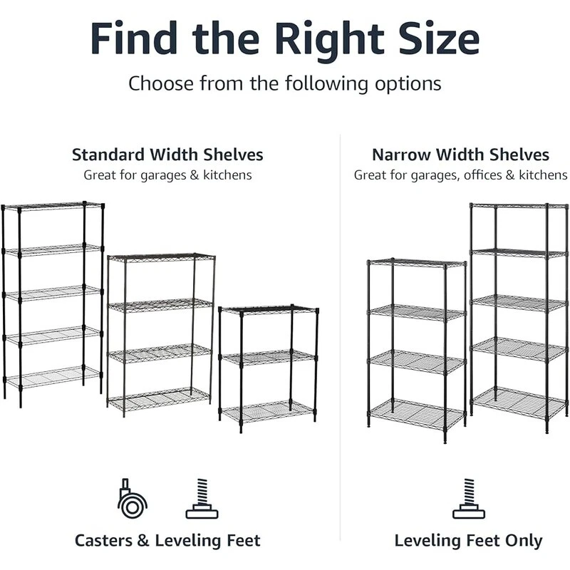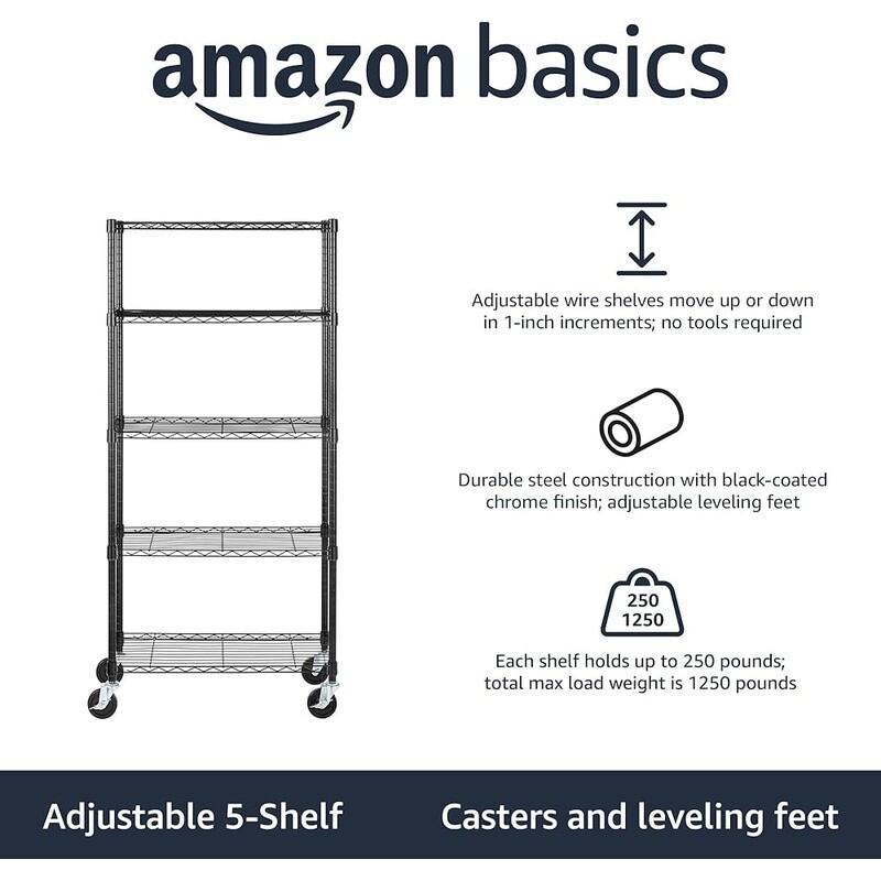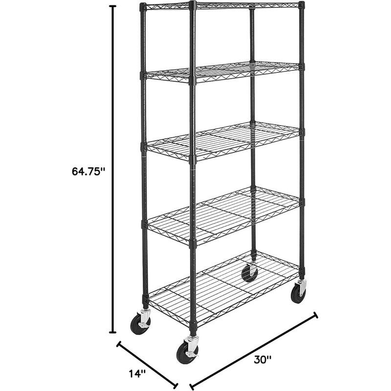 5 shelf wire rack offers handy storage space and easy access to tools and supplies Durable steel construction with a Black finish; weight capacity per shelf: 300 pounds with leveling feet, 132 pounds with wheels not in motion, and 88 pounds with wheels in motion; weight capacity overall: 1500 pounds with leveling feet, 661 pounds with wheels not in motion, and 441 pounds with wheels in motion (based on evenly distributed weight) Multi-purpose versatility; use in a garage, laundry room, kitchen, playroom, or other living or work space Assembles quickly and easily; no tools needed Product Dimensions: 30 x 14 x 64. 75 inches (LxWxH)