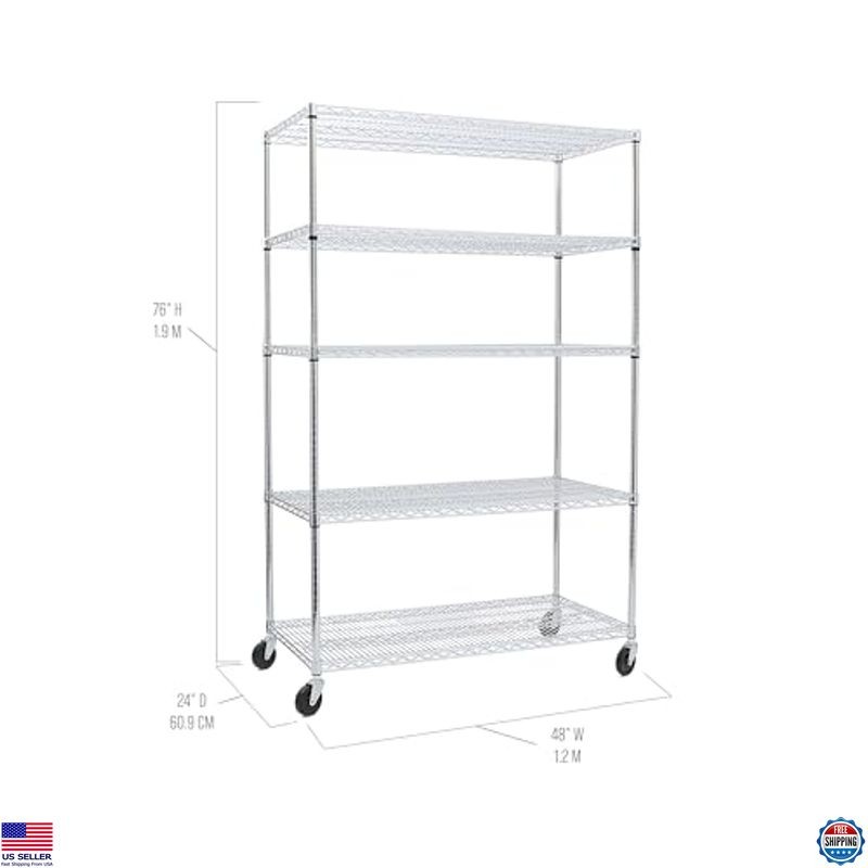 Seville Classics UltraDurable Heavy Duty NSF Solid Steel Wire Rack Storage Unit Organizer for Garage, Warehouse, Office, Restaurant, Classroom, Kitchen, 5-Tier Shelving, 48" W x 24" D Description Maximize your storage potential with the Seville Classics UltraDurable® 5-Tier Commercial-Grade Steel Wire Shelving System. Crafted from industrial-strength, NSF-certified steel, this versatile shelving unit measures 60”W x 24”D x 76”H and supports up to 800 lbs. per shelf, making it perfect for any workspace. Easily adjustable and equipped with heavy-duty wheels, this system combines durability and convenience for all your organizing needs. Product reference: B07BT69ZKS. Features Ultradurable DIMENSIONS - Overall dimensions are 48"W x 24"D x 76"H (72”H on leveling feet). 5 ADJUSTABLE SHELVES - 48" x 24" commercial-grade heavy-duty shelves are height adjustable at 1” increments. WEIGHT CAPACITY – 800 lbs. per shelf (4,000 lbs. total on leveling feet and 500 lbs. total on wheels). NSF-CERTIFIED STORAGE - Certified by the NSF to NSF/ANSI Standard 2 - Food Equipment for use in dry environments. INDUSTRIAL GRADE STEEL – Solid steel construction for both home, business, and commercial use. CONVENIENTLY MOBILE – Durable 4" wheels (2-locking) with metal hardware allow for easy mobility; bonus leveling feet included. Shipping Free & Fast Shipping: We offer free shipping to most of the USA with a normal delivery time of 3-7 days. However, due to the current situation, additional delivery time (up to 3 weeks) may be required for some items. Alternative Carriers: We may use alternative carriers (e.g., USPS, FedEx, UPS) to ensure your package arrives safely and on time. Due to the use of multiple carriers, we are unable to provide a tracking number automatically. Handling Time: Orders are processed and shipped within 1-2 business days of receiving cleared payment. Shipping Restrictions: Shipping to Alaska, Hawaii, Puerto Rico, Guam, and other US territories may incur shipping charges or delivery restrictions. Please contact us before ordering, or your order can be refunded/cancelled. State Restrictions: Certain items may not be shipped to California due to state regulations. Contact for Tracking Updates: If you require tracking updates or have any concerns about the delivery of your order, please feel free to contact us, and we will be happy to assist you. Return Policy 30-Day Hassle-Free Returns: If you are not completely satisfied with your purchase, you can return the item for free within 30 days of receiving it for a full refund or exchange. Easy Return Process: Contact us, and we will provide you with a prepaid return shipping label and detailed instructions. No Restocking Fee: There are no restocking fees for returns. However, the buyer is responsible for return shipping costs if the return is not due to a seller's error. Refund Processing: Refunds will be processed within 1 business day of receiving the returned item in its original condition. Payment We accept all major credit cards, PayPal, and Pay for your convenience. Your payment information is secure and encrypted to ensure a safe and seamless transaction. Please complete your payment within 3 days of purchase to avoid any delays in shipping. Feedback Your feedback is extremely important to us. We strive to provide the best products and customer service possible. If you are satisfied with your purchase, please take a moment to leave us a positive review. If you have any concerns or issues with your order, please contact us before leaving negative fee...
