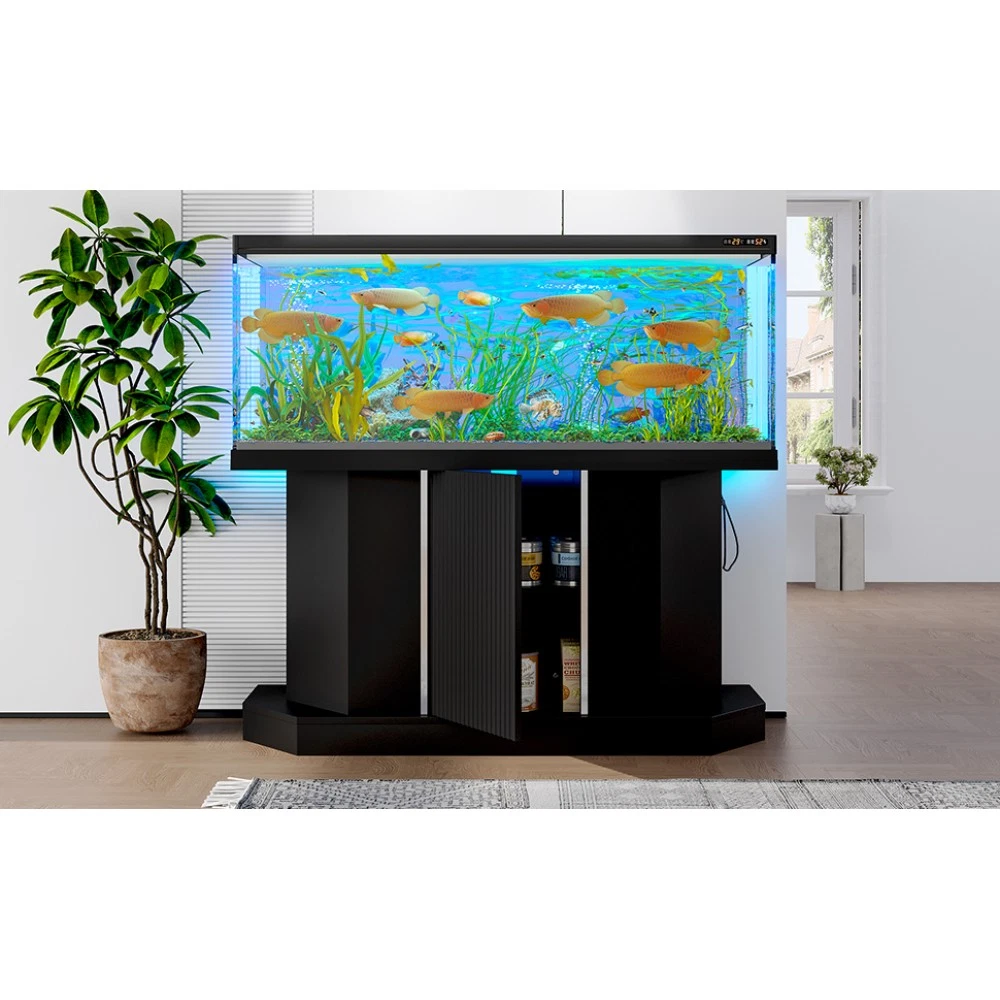 Modern 55-75 Gallon Fish Tank Stand with Power Outlet (4 AC 2 USB Ports), Heavy Duty Aquarium Stand with Cabinet Storage Upgrade your aquarium setup with this heavy-duty fish tank stand, designed to support 55-75 gallon tanks and elevate your space with both functionality and style. Perfect for fish tanks, turtle tanks, and reptile terrariums, this stand combines robust construction, convenient features, and ample storage to meet all your aquatic needs. Key Specifications Assembled Dimensions: 47.64 inches (L) × 14.17 inches (W) × 28.70 inches (H) | Assembled Weight: 57.43 lbs Packaging Dimensions: 58.19 inches (L) × 19.29 inches (W) × 6.69 inches (H) | Packaging Weight: 64.82 lbs Weight Capacity: 880 lbs | Color: Black | Material: MDF Premium Features 880LBS Heavy-Duty Support: Built to safely hold 55-75 gallon aquariums, with a sturdy MDF construction that ensures long-lasting stability. The 47.64×14.17 inch desktop provides ample space for your tank setup—please measure your tank before purchasing to ensure a perfect fit. Built-in Charging Station: Never run out of power for your aquarium equipment! Features 4 standard AC outlets and 2 USB ports, making it easy to connect heaters, filters, LED lights, and other essential devices in one convenient, organized spot. Spacious Storage Solution: Equipped with a built-in cabinet and shelf, this stand offers plenty of space to store fish food, cleaning tools, and all your aquarium supplies. Keep your setup neat, tidy, and everything within easy reach. Moisture-Resistant Finish: The sleek black laminated surface adds a modern touch to any room while protecting against moisture damage—preventing warping, swelling, or discoloration over time, so your stand stays durable and looks great for years. Hassle-Free Assembly: No complex tools or advanced skills required! Clear instructions and simple steps allow for quick and easy assembly, so you can set up your stand and enjoy your aquarium sooner. Important Notes This product includes the aquarium stand ONLY. The fish tank and any accessories shown in product images are not included. Customer Guarantee We stand behind our product with a 1-Year Quality Warranty —providing you with peace of mind against any manufacturing defects. Additionally, enjoy a 30-Day Free Return & Exchange Policy : if you’re not completely satisfied with your purchase, you can return or exchange it within 30 days, no questions asked.