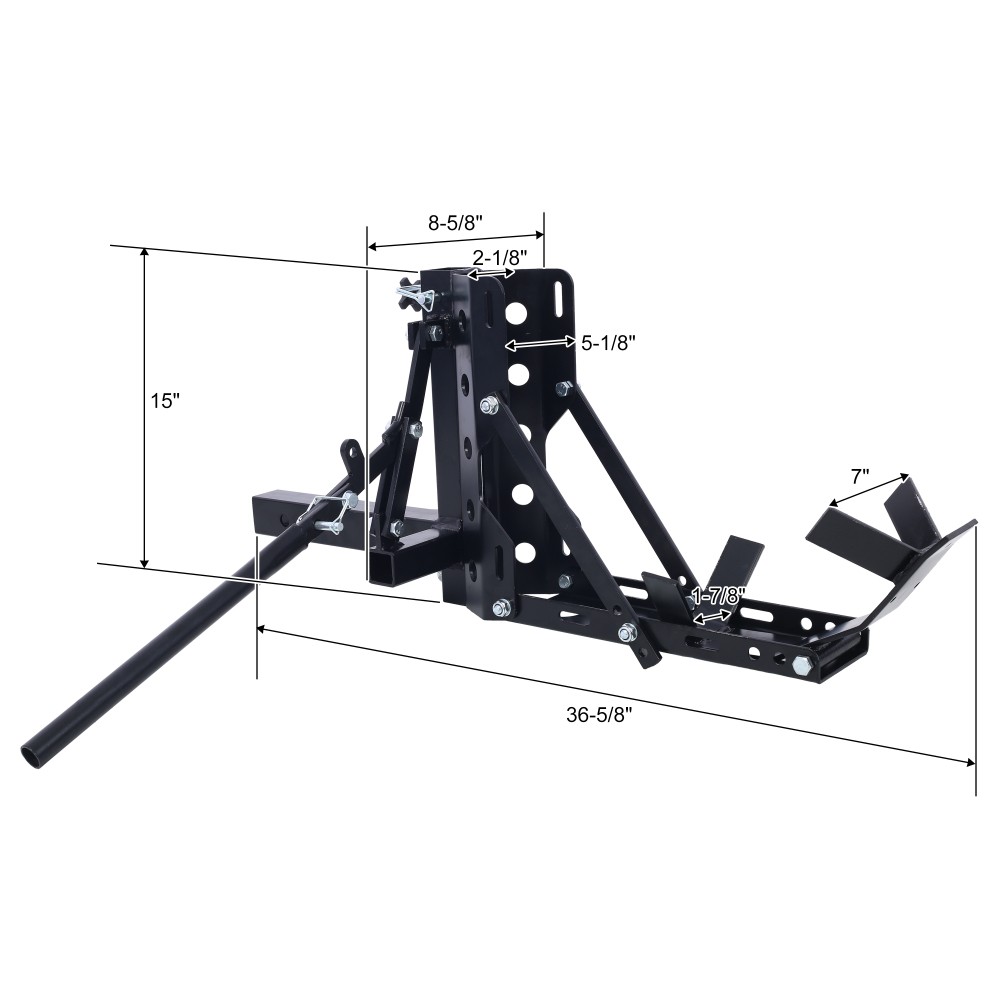 đ Key Features & Why Youâll Love It Broad Compatibility with 2" Hitch Receivers Designed to fit most motorcycles/scooters, attaching securely to standard 2" hitch receivers. It holds the front wheel firmly, making it versatile for various vehicle models. 800 LBS Capacity & Secure Tire Hold Supports up to 800 lbs and accommodates tires up to 4-3/8" wideâno trailer needed! Included locking straps fasten the front wheel tightly, ensuring stable, safe towing. Adjustable Crank Handle for Custom Fit The crank handle lets you raise/lower the stand height to fit different front wheel sizes. Tailor the rack to your motorcycle for a snug, secure hold every time. Durable Rust-Resistant Steel Build Crafted from heavy-duty steel with a black powder coat finishâresists rust, scratches, and wear for long-lasting reliability, even with frequent use. Complete Kit with Easy Storage Includes the hitch rack, locking straps, and all installation hardware. Assembly is simple, and the rack detaches easily to store in your trunk when not in use. đ Product & Package Details Assembled Dimensions : 36.60â L x 8.60â W x 15.00â H Product Weight : 30.80 lbs (sturdy, heavy-duty build) Package Dimensions : 16.90â L x 14.60â W x 7.90â H Package Weight : 33.00 lbs (securely packed for transit) Color : Black (sleek, durable finish) Material : Steel (industrial-grade, long-lasting construction) ⨠Hassle-Free Shopping Guarantees 1-Year Warranty : We stand behind our product! Enjoy a 1-year warranty against manufacturing defectsâweâll repair or replace if anything goes wrong. 30-Day Free Return & Exchange : Not satisfied? Return or exchange within 30 days for free (just keep the product in original conditionâno questions asked). đ Perfect for Motorcycle Owners, Riders, & Outdoor Enthusiasts This hitch rack is a must-have for anyone needing to haul their motorcycle/scooterâideal for road trips, moving, or as a practical gift for fellow riders. Order now and transform your beauty space-with our warranty and free return policy, you have nothing to lose!
