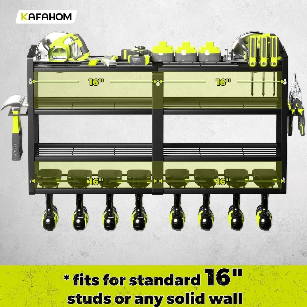 KAFAHOM Power Tool Organizer-8 Drill Holder Wall Mount,4 Layer Heavy Duty Metal Power Tool Storage Rack,Garage Tool Organizer and Storage with Screwdriver Holder/Plier Holder/Hammer Holder 100% 【Extra Large 8 Drill Holders and 4 Layers High Capacity Design】This wall-mounted power tool organizer uses the latest four-tier high-capacity design. The bottom layer can store 8 cordless drills, the upper three layers can store other heavy tools or various small tools, and a hammer holder, pliers holder and screwdriver holder are added to the side. 【Perfect Helper In The Garage】With this tool box organizers and storage wall mount, we can make the most of wasted wall space and save time searching for tools.Power tool storage rack for garages, homes, workshops, sheds, backyard shops and more. 【Strong Weight Capacity】Floating toolbox is made of thickened heavy-duty steel metal for greater weight capacity and durability, while equipped with hexagonal Expansion Bolts for greater load bearing, never again worry about the shelf breaking or the tool rack falling from the wall up and down. 【Easy Installation】Tool organization and storage is removable design, refer to the installation manual, you can assemble a perfect tool rack wall mount in just a few minutes. The accessories include two sets of fixing screws, one set is 4 expansion anchors, 4 screws (use 8mm drill bit), a set of Hexagonal Expansion Bolts (use 10mm drill bit), please choose freely according to the fixing position ,Amazing christmas or father's day gift for men. 【Optimized Details】The edges of each metal plate of this power tool rack are polished and rounded, fingers will not be scratched.Each slot slopes upwards at the front to ensure your power tool doesn't slip out. If there is any problem with our utility rack for tool organization, please feel free to contact us for a return.