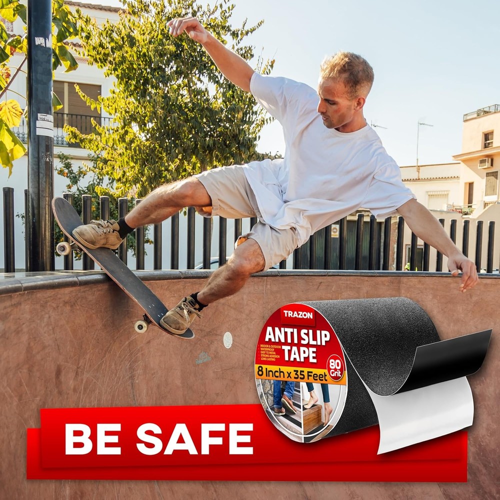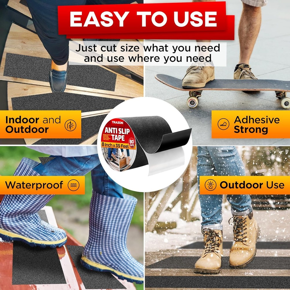 Grip Tape - Heavy Duty Anti Slip for Stairs 8 Inch x 35 Feet, Black Product Details Brand: Trazon Color: Black Material: Polyvinyl Chloride or Polyethylene Terephthalate Number of Items: 1 Recommended Uses For Product: Outdoor, Indoor Special Feature: Waterproof Surface Recommendation: Wood, Tile, Stone, Concrete, Metal, Plastic, Glass Water Resistance Level: Waterproof Size: 8 Inch x 35 Feet Compatible Material: Wood, Tile, Stone, Concrete, Metal, Plastic, Glass Unit Count: 35.0 Feet Manufacturer: Trazon Package Dimensions: 8 x 5.5 x 5.25 inches Item Weight: 3.29 pounds Item model number: 8 Inch x 35 Feet Black Professional grade anti slip adhesive tape: Durable waterproof anti skid tape for steps is perfect for outdoor and indoor use. We use premium heavy duty 80 grit tape which creates the ideal texture to fully prevent slipping. Non skid tape provides extra foot traction for your additional protection on any slippery surface, including stairs, patio, entryways, ladders, deck ramp, laminate, skateboard, scooters, tile, slippery floor, trailers, boats, sporting equipment, and forklifts. Waterproof, long lasting & peel resistant in any weather: Our abrasive grip tape roll for stairs was specifically designed to withstand heavy foot traffic and any weather conditions, including rain, snow, frost, sun, water, and heat. Stair tread tape creates an exceptional long term grip on all surfaces for many years. Works on multiple surfaces: Non slip tape strongly adheres to all surfaces, including smooth and rough coverings. You can stick this anti slip traction tape on wood, tile, stone, concrete, metal, plastic and glass, all of which require extra foot traction. Enjoy all around protection and ultimate comfort in your home, as well as in hotels, restaurants, businesses and educational establishments. Made for you safety: Our adhesive non slip tape for steps is designed specifically to make your home safe for you and your family. Superior anti skid tape for steps outdoor creates a safer environment for walking, working, stepping and standing. Reduce the risk of falls, trips and slips for your loved ones, especially the eldery, children and pets. Easy to use with our customer suport. Non skid tape measures 4 in by 35 ft - the perfect size for all your needs. Simply cut out a piece of any size, peel the protective film, and apply the tape on a clean surface. Designed in the USA and produced according to the highest quality standards. Your new favorite anti slip tape is just a few clicks away! If you have any problems, contact us. We will solve it for you! grip tape anti slip tape anti slip tape non slip tape non skid tape anti slip tape outdoor waterproof anti slip non slip traction tape skateboard tape grip tape roll non skid tape stair grips anti skid tape for steps outdoor non slip tape for outdoor steps stair grips for dogs stair tread tape antislip tape tread tape waterproof grip tape grip tape for stairs anti skid tape stair grip anti slip traction tape tread tape antislip tape for stairs adhesive grip grip tape for stairs outdoor stair grippers stair tape waterproof anti slip tape grip tape for stairs indoor anti slip traction tape anti slip tapes nonskid tape stair grip tape sandpaper tape grip tape for steps outdoor no slip tape grip strips for steps outdoor eden products anti slip stair treads non slip tape for steps