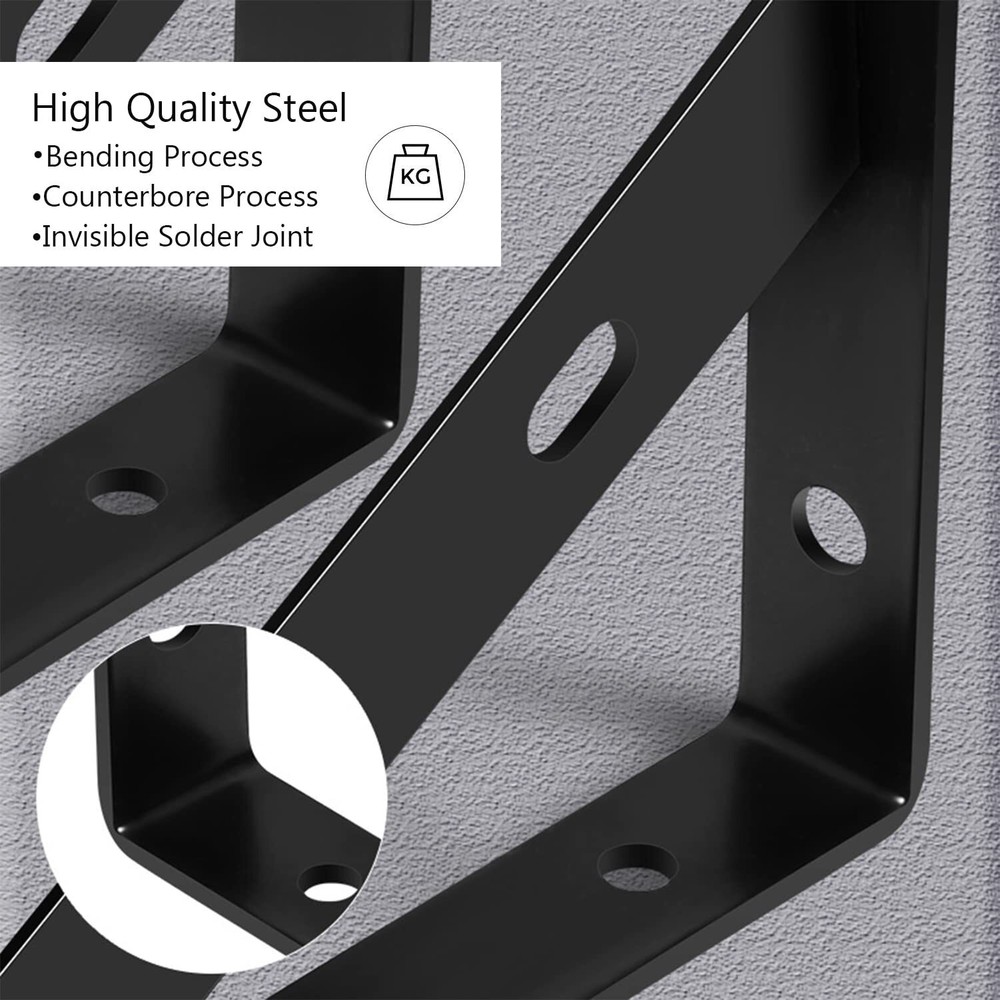 【8 Inches Shelf Brackets】: 4 Pack-7.8 x 4.7 inch shelf brackets,including Mounting Hardware.These brackets are designed to support shelves from 8 inches to 10 inches deep. 【Durable and High Quality】:Our shelf bracktets are made from premium steel, characterized by good impact resistance and no paint off. Widely used in a variety of rooms in a home, including the garage, kitchen, laundry room, backyard, and more. 【Rust-proof Coating】 Sturdy steel material with a black -coated finish is durable, chip- and corrosion-resistant. The smooth and rounded surface makes it easy to maintain. 【Easy to install】: The shelf brackets are easy to install, Each arm has 2 holes for screw intallation, you can use mounting hardware we provide to install it. 【Quality Services】:We have high efficiency after-sales service. If you have any questions in the process of using, please feel free to us. Our team will help you solve the issues ASAP