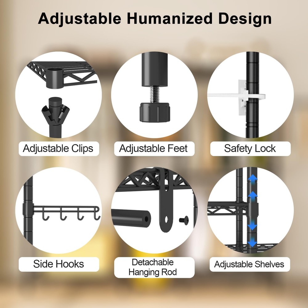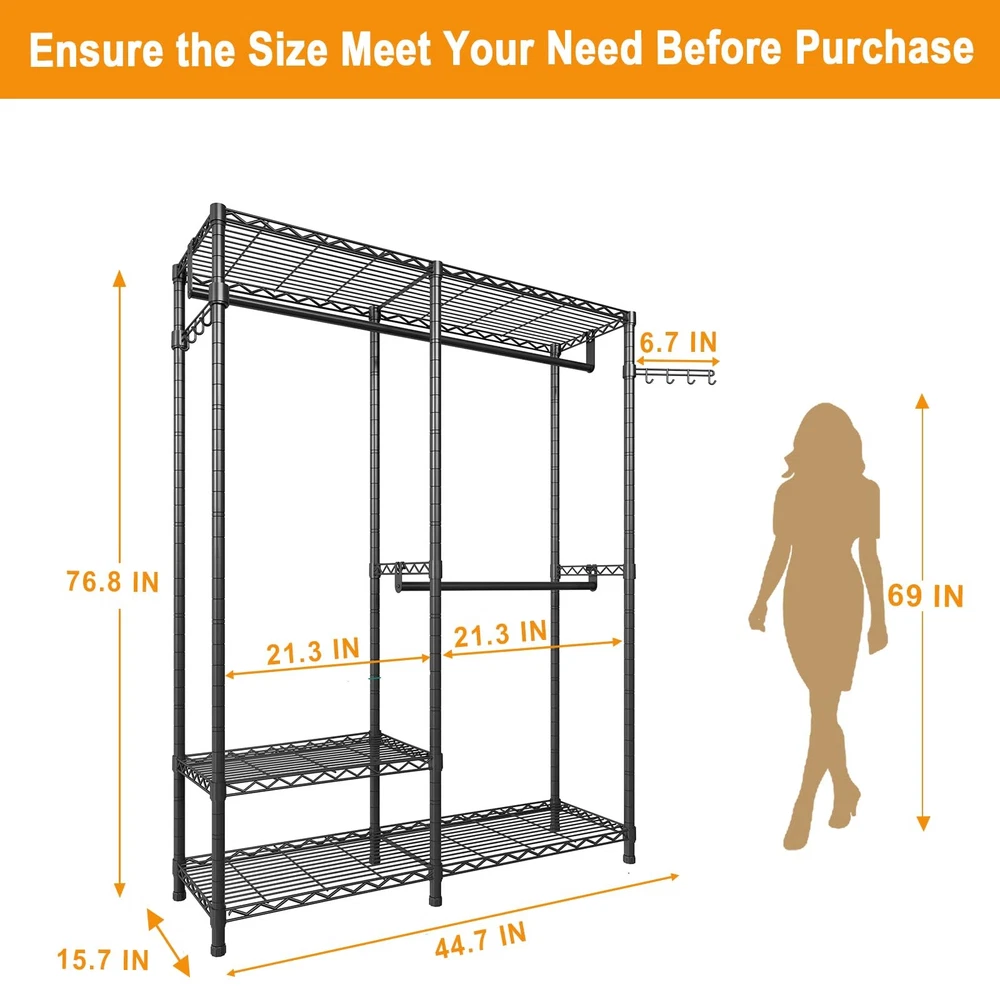 Elevate your storage and organisation game with this heavy-duty garment rail. Crafted with sturdy materials, it provides a reliable and convenient solution for hanging clothes, accessories, and more. Its robust construction ensures it can withstand the weight of even your heaviest garments, making it an ideal choice for both residential and commercial settings. With its sleek design, this garment rail seamlessly blends into any space, allowing you to keep your living or working area clutter-free and well-organised. Whether you need extra hanging space in your bedroom, a portable display for a retail shop, or a temporary wardrobe solution during renovations, this versatile garment rail has got you covered. Maximise your storage potential and experience the convenience of easy access to your belongings with this durable and practical addition to your home or workspace. Multi-functional Garment Rack - The heavy duty garment rack with 3 shelves, 2 hanging rods and side hook, it is designed to efficiently store and display your clothes, shoes, bags, and accessories. It provides ample space and it is a good space helper to keep your room tidy Durable & Dimension - Made of high-quality iron pipe with a surface spray treatment, which is rust and corrosion-resistant, scratch-resistant, and durable. The garment rack dimension is 72.4" L x 15.7" W x 76.8" H, please make sure the garment rack will fit your space Adjustable Wire Shelves & Straight and L Shape Installation - The shelves and hang rods are adjustable, you can DIY the installation height to meet your need. And The straight shape for large space and L shape for corner or small space. The portable closet allowing you to effortlessly create additional storage space in any room Easy to Assemble - Come with installation instruction, no tool required. The height can be adjusted with a slip-sleeve locking system by increments of 1 inch each time Satisfactory After-Sales Service - CHARYJOD provides professional before and after customer service. If you have any questions for our products after receiving the package, please feel free to contact us, we stand behind our product, we will provide you with satisfactory after-sales service
