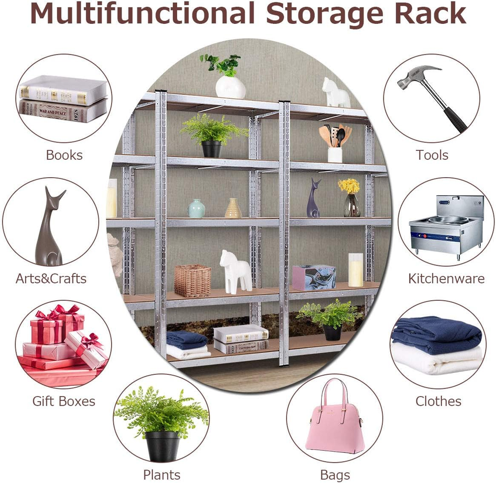 〖Assembly without Bolt 〗- 5 shelves make assembly straightforward and bolt-free. Rivets can be perfectly installed into the slots on the posts. Simply insert and lower enables joints to be securely locked into place. Shelves can be adjusted as needed to accommodate stored items in small or large size. Adjustable shelves also create customized storage space. 〖Garage Rack, Bookshelf & Display Stand〗: The shelf will be ideal for home, office or garage use. The shelving unit offers a considerate solution to everyday storage including files, other office supplies, kitchen appliances, canned goods, pantry items, garage or basement tools, seasonal household items and holiday ornaments. 〖Well-Organized Shelf with Adjustable-Height〗: Free-standing rack can play a practical role in kitchen, bathroom or dining room, and versatile function make it an ideal shelf home, garage, workshops, warehouse storage. Spacious storage space greatly help you organizes various stuff such as tools, kitchenware, toiletries etc. 〖Large Capacity〗- Max tier capacity is 385Lbs. Max total capacity can reach 1925Lbs. Rubber feet greatly protects floor from being scratched and makes the shelf itself stable. 〖Sturdy Metal Frame & Spacious MDF Board〗- This storage shelf rack is solid and durable enough not only to give the whole construction strong support but also keep rust-resistant. High-quality MDF board is thick and wide enough to load any stuff. Product Description 5-Tier Multifunctional Shelving Rack This is our Giantex sturdy but adjustable 5-shelf storage rack. It is an ideal storage shelffor you to effectively and reasonably organize your stuff and clear some clutter out of your utility room, workroom, or garage and keep all your toolsand supplies stay at right position. Characterized by no bolt and no nut designand with detailed manual, our five-layer storage shelf is easy to be assembled and disassembled. Equipped with the robust and strong construction and owning powerful capacity, our storage shelf ensures its safe usage and powerful loading capacity. The adjustable height design gives you much more freedom and choice to adjust height of each tier based on dimension of your stuff. Our rack perfectly optimizes your space and brings you much convenience. It will be worthy of your purchase! Multipurpose Storage Shelf & Display Stand Multipurpose Use 5-Shelf storage rack is ideal for home, office or garage use. The shelving unit offers a considerate solution to everyday storage including files, other office supplies, kitchen appliances, canned goods, pantry items, garage or basement tools, seasonal household items and holiday ornaments. Our shelving rack greatly helps keep all stuff well-organized and easy to reach. Multi-Changing Shape of Shelving Rack Our utility rack can be changed and assembled into several different shapes to suit your place or furniture layout. Free-standing design enables the rack to be put at kitchen, bathroom or dining room, and versatile function make it an ideal shelf home, garage, workshops, warehouse storage. Spacious storage space greatly help you organizes various stuff such as tools, kitchenware, toiletries etc. Powerful Capacity & Protective Rubber Feet Max tier capacity is 385Lbs. Max total capacity can reach 1925Lbs. This rack offers sufficient and safe feeling at time when the shelf helps you effectively and reasonably organize stuff. Rubber feet greatly protects floor from being scratched and makes the shelf itself stable. Adjustable-Height Shelves & Bolt-Free Assembly The rivet-lock design of 5-shelf rack makes assembly straightforward and bolt-free. The rivets on the shelves can be perfectly installed into the slots on the posts. Simply insert and lower enables joints to be securely locked into place. Shelves can be adjusted as needed to accommodate stored items in small or large size. The versatile adjustable shelves makes it convenient to create customized storage space. Solid & Thick MDF Board Each layer of this storage rack is crafted of high-quality MDF board which is thick and wide enough to load any stuff you put on it. Durable Galvanized Steel Frame The whole frame of this storage shelf rack is made of heavy duty galvanized steel which is solid and durable enough not only to give the whole construction and stuff on it strong support but also maintain rust-resistant and serve longer time. Dimension of Garage Rack Material: MDF& galvanizing steel Dimension:36"x 16"x 72"(L x W x H) Max. Tier Capacity: 385Lbs Max. Total Capacity: 1925Lbs Net Weight:33.44Lbs Package Includes:1 x 5-shelf adjustable storage rack Features of Multipurpose Storage Rack Free-standing design that is great for the kitchen, bathroom,dining room to organize Made of galvanized frame and MDF board Coated with galvanized powder paint for ensured durability A simple collection for your basic storage needs Features with 5 tiers racks with ample space for more storage Heavy duty design in solid structure with high capacity up to 385 Lbs per tier Free-standing design that is great for the kitchen, bathroom,dining room to organize Made of galvanized frame and MDF board Coated with galvanized powder paint for ensured durability A simple collection for your basic storage needs Features with 5 tiers racks with ample space for more storage Heavy duty design in solid structure with high capacity up to 385 Lbs per tier