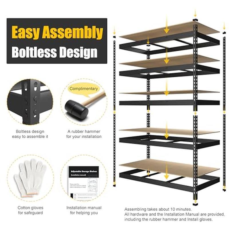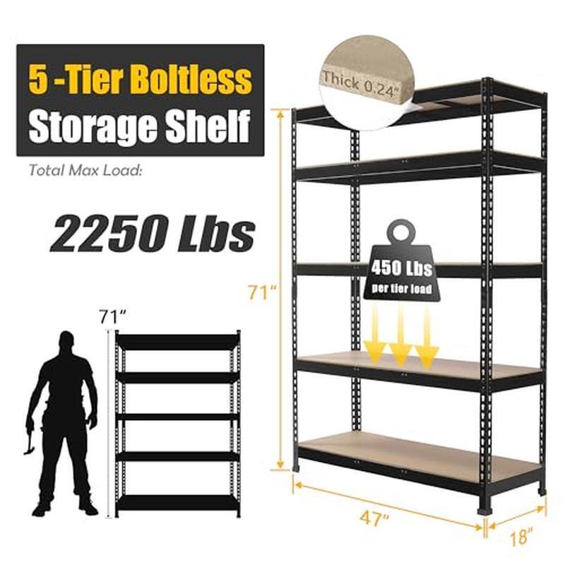 About this item 【MULTIPURPOSE SHELVES】: Overall dimension for storage shelves: 47" W x 18" D x 71" H. Net Weight: 55 lbs. This adjustable shelving unit with perfect size makes it suitable for many places, such as in the garage, pantry, closet, kitchen, warehouse, basement, living room, office, etc 【HEAVY DUTY & LONG-LASTING】 : This 5-tier garage shelving is made of high-quality 0. 24" thicker FSC-Certified MDF boards and 0. 04" thicker heavy duty galvanized metal frame, sturdy and enduring. The metal frame is covered with premium powder coating to give it a smooth surface. Each layer shelf add 2 middle support beam for more weight capacity. Each shelf holds up to 450 lbs, 5 tier shelves' total max load weight is 2250 lbs 【HEIGHT ADJUSTABLE 】: Adjustable storage rack, metal shelving unit can be adjusted the shelf up and down, you can adjust each shelf heigh according to the size of the item so that the items can be stored in any size. (Adjustable at every 1. 2 inches) 【EASY TO ASSEMBLE 】: Due to the boltless design, it is easy to assemble this heavy duty storage rack by lightly pressing it even with your hands or a rubber hammer. Assembling takes approximately 10 minutes. All hardware and the Installation Manual are provided, including the rubber hammer Room Type:Warehouse, Garage, Pantry, Closet, Living Room, Bedroom, Library, Kitchen, Basement, Office, Home, Shop, Study Number of Shelves:5 Special Feature:Storage, Sturdy, Heavy Duty, Space Saving, 47"W x 18"D x 71"H Metal Shelves, 2250 LBS Heavy Duty Storage Shelves, Wide Storage Shelves, Adjustable Product Dimensions:18"D x 47"W x 71"H Style:Industrial : : : : : Material:Engineered Wood, Metal Mounting Type:Floor Mount Shelf Type:Adjustable Metal Shelf Shape:Rectangular You may also like Citric Acid Home Canning Tomatoes Safe Preservation Dairy-Free 12oz Jar Kitchen 10.57 USD 11.13 USD Free shipping 5% off 2-in-1 Push Pull Wagon Walker Kids XL Storage Durable Wheels Toddler Toy New US 40.6 USD 42.74 USD Free shipping 5% off Heritage Hill Glass Jar W/ Lid Wide Mouth Storage Canister Durable Multi-Purpose 8.73 USD 9.19 USD Free shipping 5% off 23 Inch Artificial Silk Flower Bouquet Peony Dahlia Eucalyptus Indoor Decor New 10.77 USD 11.34 USD Free shipping 5% off Tender Centers Dry Cat Food Salmon Chicken Kibble 3lb Complete Nutrition New US 7.48 USD 7.87 USD Free shipping 5% off Medium Oval Galvanized Tub W/ Rattan Handles Storage Party Display Ice Bucket US 18.84 USD 19.83 USD Free shipping 5% off Vegan Brownie Mix Gluten Free Chocolate Chip Plant Protein Non GMO 16oz Jar New 9.92 USD 10.44 USD Free shipping 5% off Battery Powered Deer Feeder Kit Timer Universal Attachment 4 Feed Times New US 47.05 USD 51.99 USD Free shipping 10% off Septic Tank Treatment Odor Control Prevent Clogs Bacteria Natural Safe 32oz New 11.66 USD 12.27 USD Free shipping 5% off Sensitive Baby Wipes Unscented 3 Packs Hypoallergenic Aloe Vitamin E 168 Count 8.51 USD 8.96 USD Free shipping 5% off Acrylic Salad Bowl W/ Servers Dishwasher Safe Large Capacity Durable Design New 37.58 USD 39.56 USD Free shipping 5% off Manual Siphon Pump Universal 6ft Hose Fluid Transfer Pump Vehicles Aquariums New 11.04 USD Free shipping