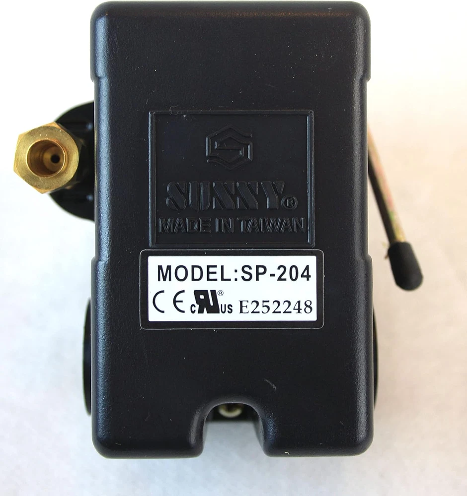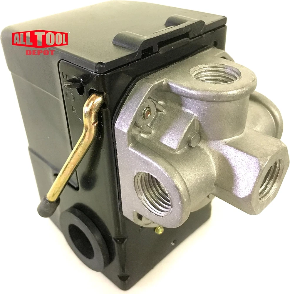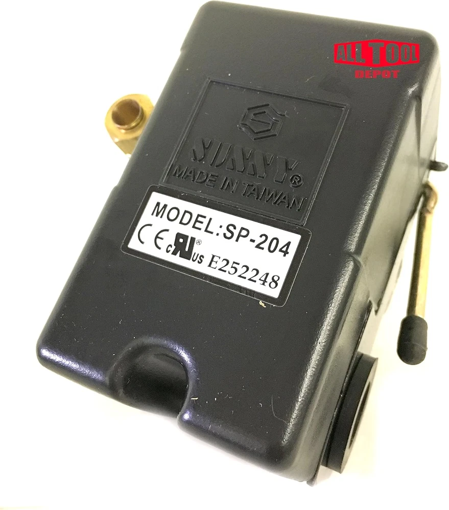 Heavy Duty SUNNY 95-125 PSI air compressor pressure switch, 4 Ports. MAX PRESSURE: 200 PSI MIN CLOSE: 60 PSI, 25AMP DIFFERENTIAL: 28-40 PSI 1/4" COMPRESSION UNLOADER VALVE CONNECTION, 1/4" FEMALE NPT TANK CONNECTION. 1PH: 115v,230v; 3PH: 230V,575V; DC: 32V,115V,230V This Sunny SU-L4 air-compressor pressure switch controls an electrically driven air compressor in a power circuit when the adjustable threshold upon falling is reached and is set to turn off at 125 psi. The switch have four 1/4" NPSF internal fluid connection. The adjustable cut-out range is 60-200 psi. The switch is diaphragm actuated and has a fixed differential. The threshold, or setting point, upon rising adjusts with a screw nut. The switch has screw terminal electrical connections. The maintained manual cut-out lever has auto and off positions.