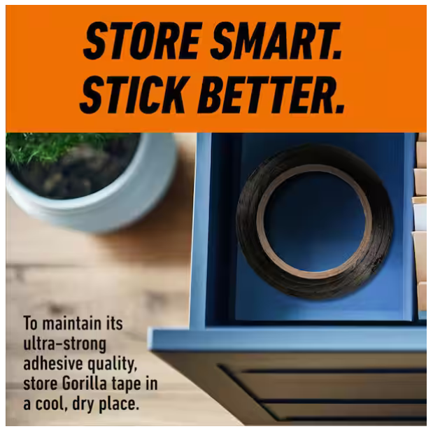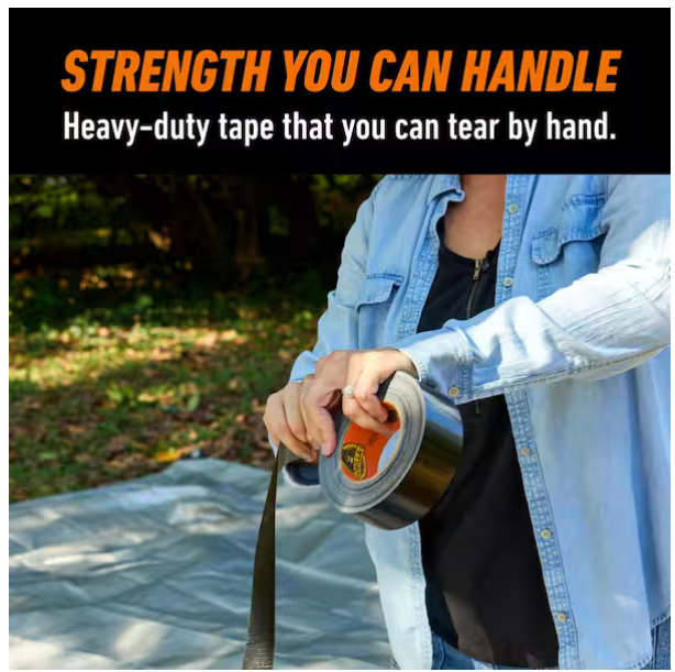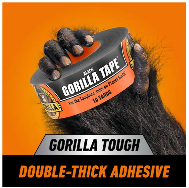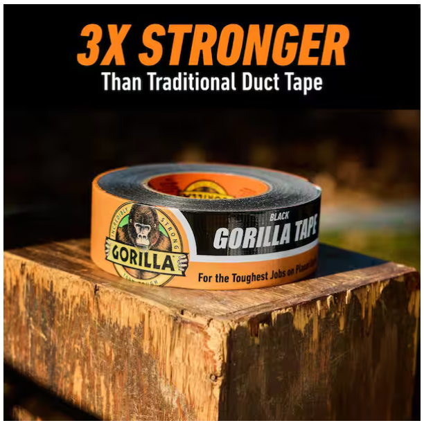 Heavy Duty Black Duct Tape Gorilla Tough Weather Resistant Large 10 Yard Roll Heavy-duty duct tape designed for tough repairs and projects 3X stronger hold for long-lasting performance Double-thick adhesive grips smooth, rough, and uneven surfaces Reinforced backing with tight weave for added strength Tough, all-weather shell resists moisture and wear UV resistant and handles temperature changes Tears by hand for quick, easy use Suitable for indoor and outdoor applications Adheres to wood, stone, stucco, brick, metal, and vinyl Built for demanding jobs by Gorilla Tape
