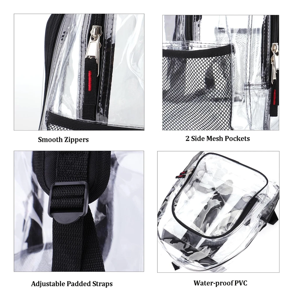 Where can be used: School or extra-curricular activities: books, stationery, water bottle, etc. Sporting events or Concert: clothes, umbrella, phone, etc. Airport or high security settings: laptop, notebook, purse, etc. 【PVC Heavy Duty Clear Backpack】Clear bookbag is made of thicker clear PVC material, which is sturdy enough for everyday use. Ruggedly reinforced shoulder straps for reliable strength when carrying heavier items. Main dual zipper closure transparent backpack with completely see through all around, including back and bottom. Recommend for over 4 years old. 【Large Clear Backpack】With a large main compartment, as well as a spacious front zipper pocket for easy acces and two side pockets perfect for water bottle. Main dual zippered compartment (in Inch): 16.5 H x 12 W x 6D. 【Get Through Security Hassle-Free】Clear backpack perfect for stadium events, school, etc... Pass through stadium security checks easily without unnecessary stalling. See through backpack will keep all your valuable belongings and accessories secure. 【Comfort Padded Straps】Featuring a sturdy handle, reinforced straps, front accessory pocket and soft padded shoulder straps can be adjusted to suit your specific requirements. Plastic backpack is bound to become your favorite buddy to take with you when back to school. 【Waterproof & Multi-Functional】Waterproof clear plastic backpack - water won't ruin what's inside. Clear backpack for girls, boys, kids, men, women, adults back to school. Age grading: Over 4 years old.