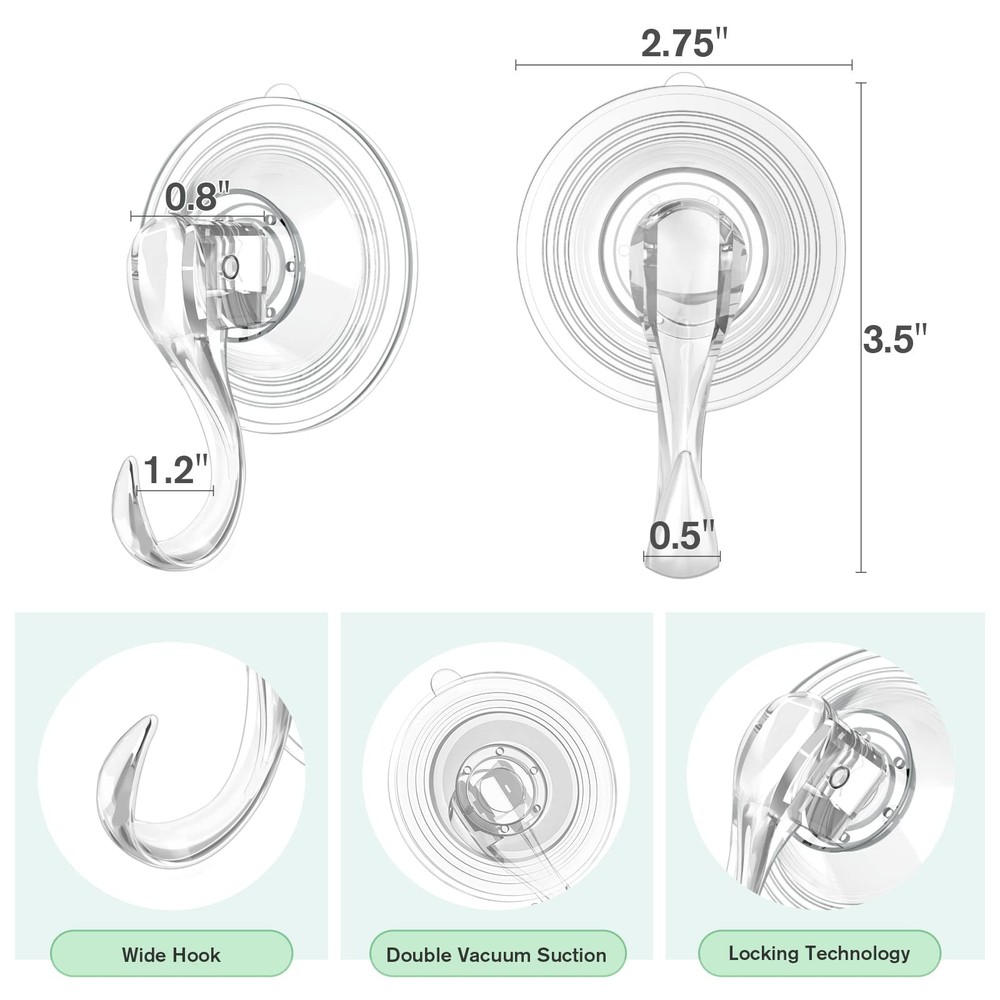 VIS'V Wreath Hanger, Large Suction Cup Wreath Hooks with Wipes, Heavy Duty, 22 LB Capacity, Removable and Reusable, Clear, 2 Pcs Well Made: Suction wreath hanger is made of high-strength PET plastic material and high-tech locking technology; robust construction, sturdy and durable; transparent look is quite minimalistic and simplistic, blends in seamlessly with any decor; won't turn yellow or reduce adhesion over time Heavy Duty: Bigger vacuum suction cups creates a strong seals; stronger suction power can holds up to 22 lbs; double vacuum suction ensures it can work in different temperature indoor or outdoor; lock into place and stay put well, hold tightly without falling or sliding; the hook is large and curved, safer to protect items from slipping off; simple design yet meets versatile uses Easy Installation: Installation is a breeze; no use of any tools, just clean the smooth surface with coming wipes; simply lift the hook into an upright position; press the sution cup firmly to squeeze air out; then click the hook down to finish installation; provids a secure and hassle-free storage solution to hang various decorations Removable and Reusable: Lift the hook to release suction; take the tab of suction cup you can easily to reposition, replace or remove it without damaging the wall or leaving sticky residues; if it being out of shape or lose suction; soak it into the warm water, you can use again after drying Wildly Use: Clear wreath hooks can securely sucks on tile, window, mirror, glass, metal, plastic and other smooth flat surfaces; nice addition to around inside and outside the house, and camper, trailer, RV, hotel, store, dorm; such an essential decorative accessory and really serve its purpose Matches with All Your Home Styles The wreath hanger is designed with transparent materials that match any interior style and atmosphere. Double vacuum suction ensures it can work in different temperature. No need extra tools, just a few seconds to finish installation, it can be reused that is greener and more economical. Very friendly for the tenants and travelers because when you remove the suction hooks it won’t damage the wall and no scratch left. Features: Materials: PET Plastic Length: 3.5 inch Width: 1.75 inch Diameter of Suction Cup: 2.75 inch Bearing Capacity: Up to 22 lbs Package Include: 2/4/6/8 x Wreath Hangers + 2/4/6/8 x Wipes About Install: Choose a smooth surface and clean it with coming wipes. Press the suction cup on smooth surface. Exhausting air in the suction cup then pull the hook down to lock. Hanging items when suction cup hooks sucks firmly. About Remove: Pull the hook up to release locking then pull the tab to remove it. Warm Reminder: Please confirm whether the wreath hooks sucks firmly before hanging heavier objects or valuable items. The wreath holder is not suitable for powder painting wall, stone wall, wood wall and other rough walls. SHIPPING Domestic Buyers - We have confidence in our products, but if you are not fully satisfied please contact us within 30 days of purchase and you will get full refund. - We ship within 3 business days of payment, usually sooner - We offer FREE shipping on all orders! - We only ship to the lower 48 states, no APO/FPO addresses or PO Boxes allowed International buyers – please note: Import duties, taxes, and charges aren't included in the item price or postage cost. These charges are the buyer's responsibility. - Please check with your country's customs office to determine what these additional costs will be prior to bidding or buying. * Order Cancellation Policy ** You can return a product for up to 30 days from the date you purchased it. 1. The seller reserves the right to cancel the special case only due to eBay cancellation fee. 2. The decision of seller is the final. 3. The seller will respond to the cancellation request within 2 business days. Please wait for the result of cancellation. 4. In case the cancellation is not completed by some reasons, the buyer can follow the options below to get the refund. 4.1 The buyer can reject the item when it arrives. 4.2 The buyer can send the item back to the seller within 30 days If the buyer receives item (USA Shipment ONLY). The seller will provide the FREE return label to the buyer when the buyer opens " Return Item" case on eBay by using the reason as "Change my mind" ONLY. 5. When buyer has placed the order. The order will be processed and completed by automatic warehouse system within 5 minutes. In case that buyer sends the cancellation request after 5 minutes of placing the order, the request will be rejected. **Sending direct message to cancel the order is not allowed for every case.* Return Policy For the return case - If buyer would like to return the items for refund or replacement, please CONTACT SELLER to receive the free return label from seller. The refund or replacement will be processed with the tracking number of return label which is provided by seller only. The other ways of return which are not approved by seller will not be processed for the refund or replacement.
