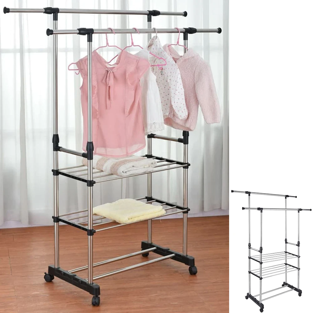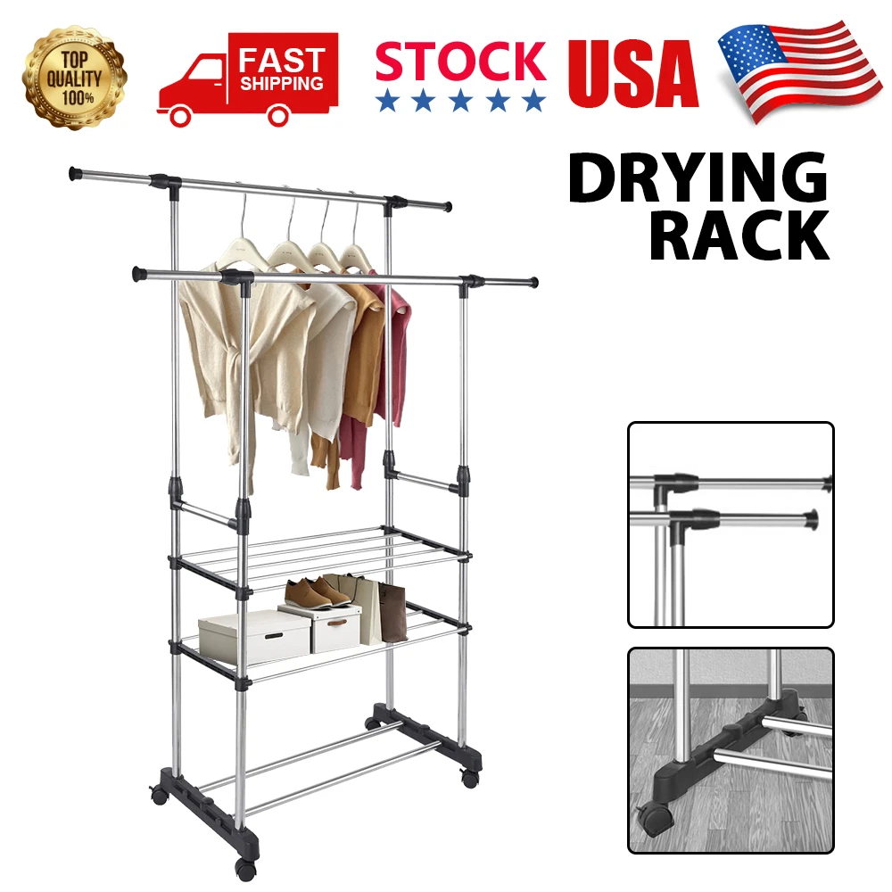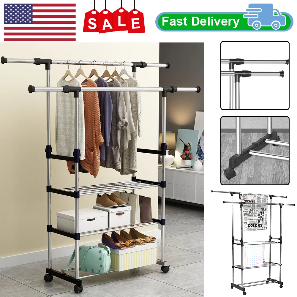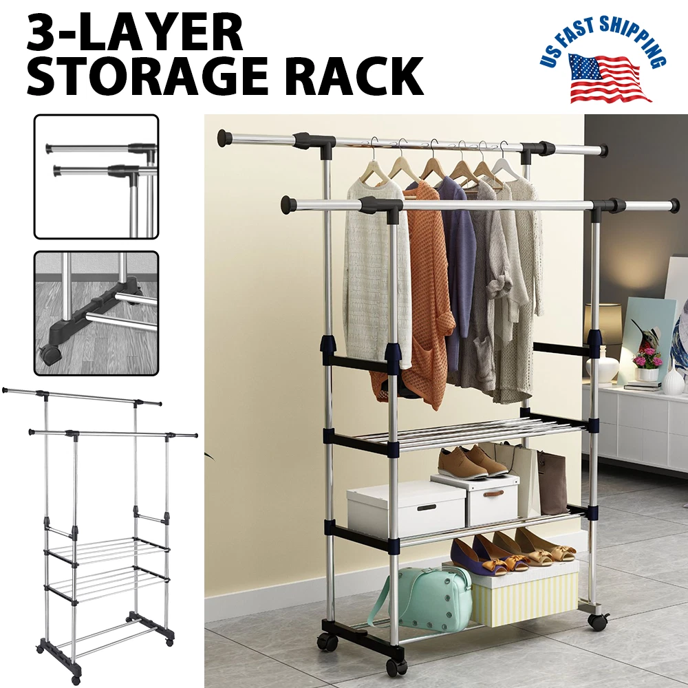 Item description Feature & Details Maximize storage and organization with the clothing garment rack's two hanging rods and bottom shelf. The double hanging rods provide double the capacity, allowing you to store a larger number of garments, while the bottom shelf is perfect for storing shoes, boxes, and accessories. Experience ultimate flexibility with the rolling garment rack's four universal casters, including two lockable ones. Effortlessly gliding the rack across your bedroom for outfit selection or securely parking it in place during ironing sessions. Extra Storage Area: The garment rack on wheels boasts three storage shelf , offering you additional storage options. You can conveniently store items such as suitcases, shoes, hanging umbrellas, and more. This extra bottom shelf not only provides more space but also enhances the stability of the garment rack. Our clothes rack provides the flexibility you need with an extendable hanging rod ranging from 35.5'' to 57.1'' and adjustable height from 35.5'' to 59.1''. You can create a customized storage solution that perfectly fits your needs. With a thickened 1-inch (25.5mm) steel diameter, the heavy duty garment rack provides exceptional strength and stability to support your clothing collection. Rest assured, your garments will be securely held and well-supported on this rack. Specifications: Color:Silver Material:Steel Item Weight:2.8kg/6.17lbs Weight Capacity:330lbs Product size: 59"*5.7"*16.5" Height adjustable: 35.5''-59.1'' Specifications: 1x Garment Rack 1x Manual